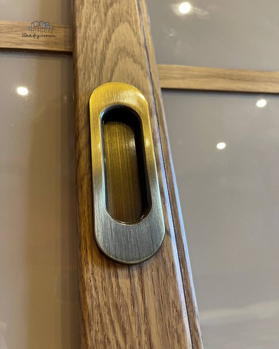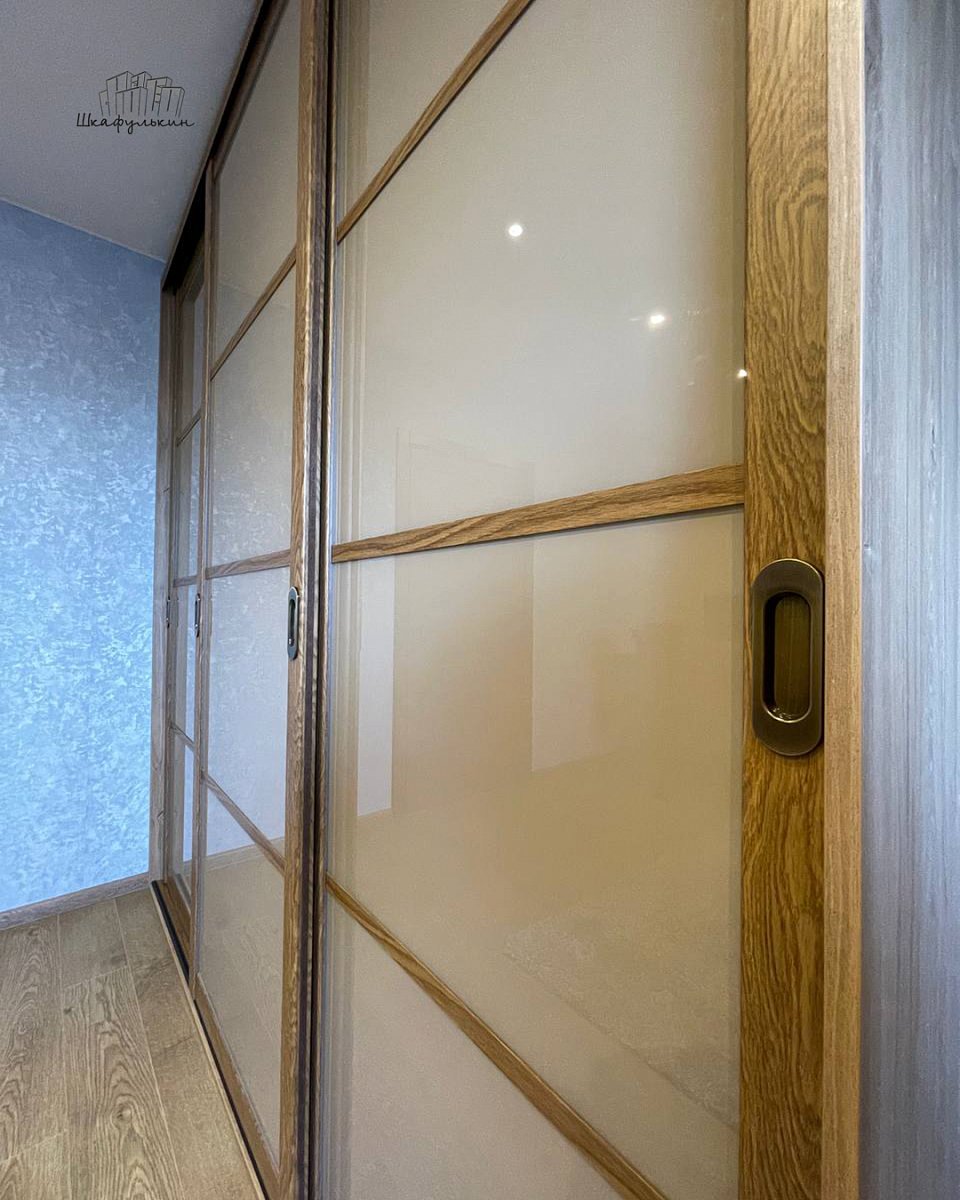 Двери-купе: 3 шт. / HOLZ 55х30, декор: Дуб дикорастущий 2738 / вставка: стекло LACOBEL 1236 Brown Light /делитель накладка Дуб дикорастущий 2738/ треки: Дуб дикорастущий 2738 / нижний трек: Дуб дикорастущий 2738.