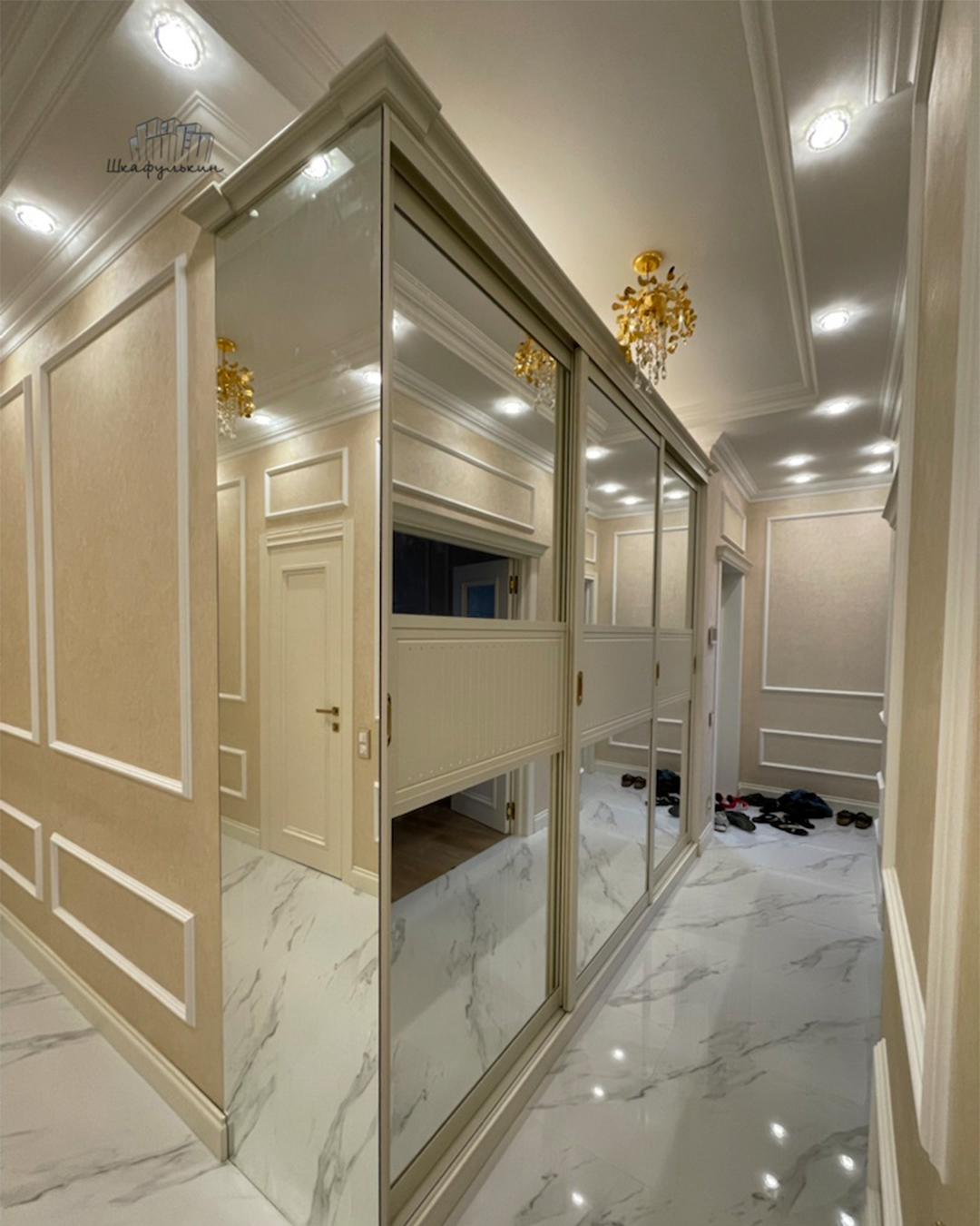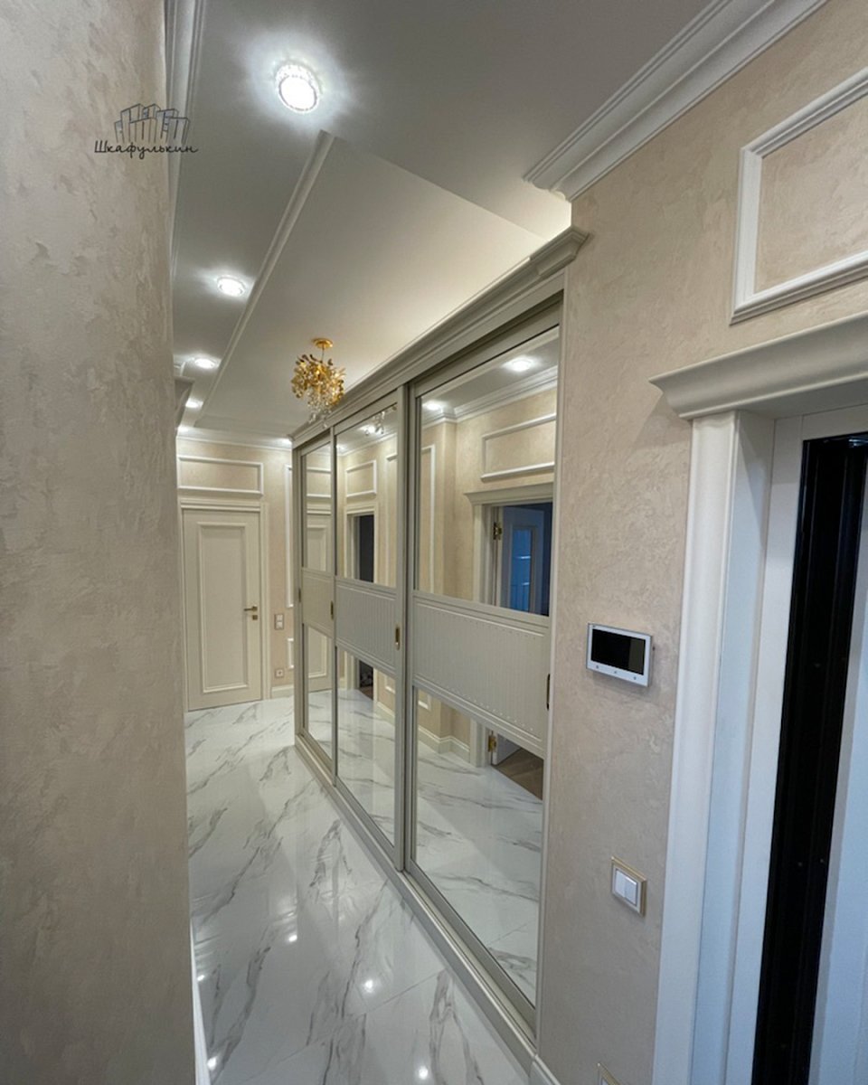 Двери-купе: 3 шт. / HOLZ 55х30, покраска: RAL 1013 матовая/ вставка 1: зеркало серебро / вставка 2: МДФ 08мм RAL 1013.