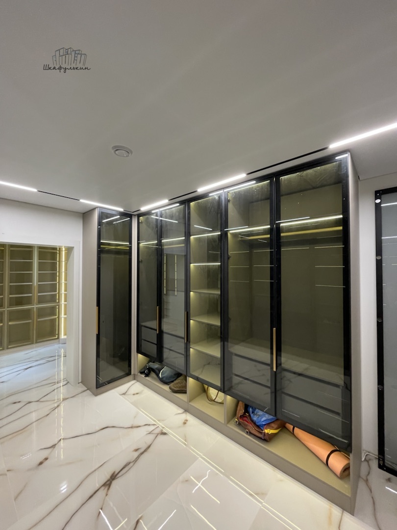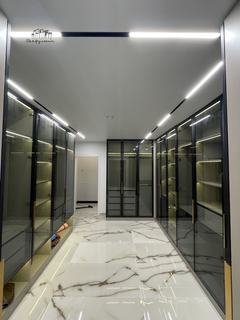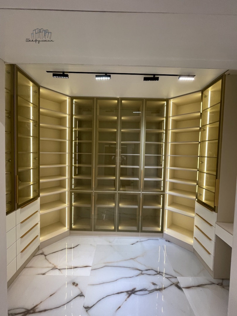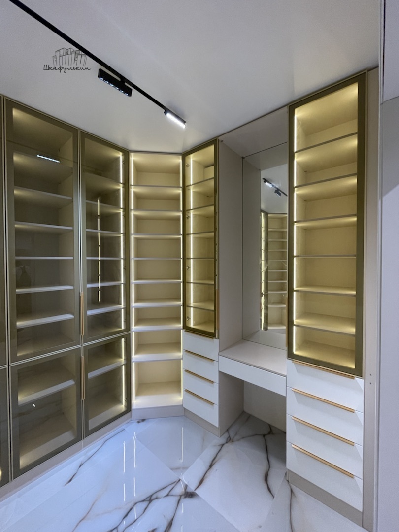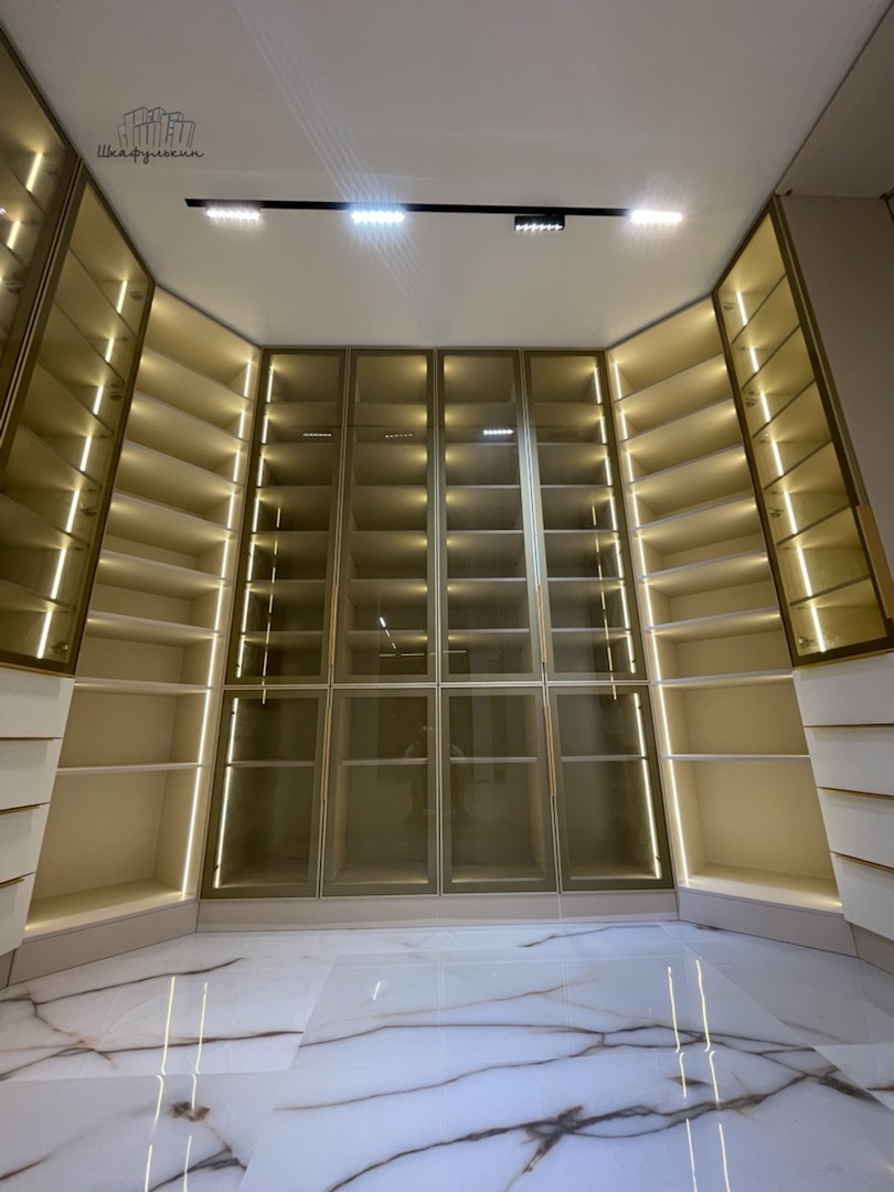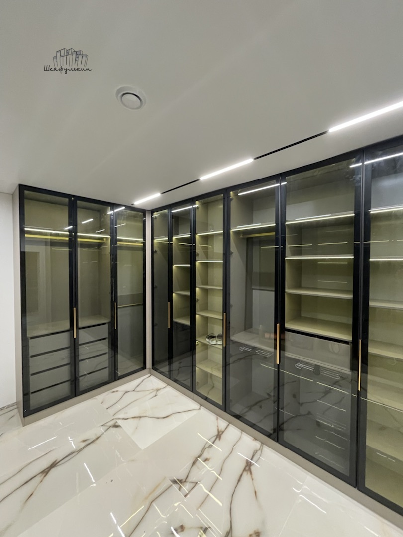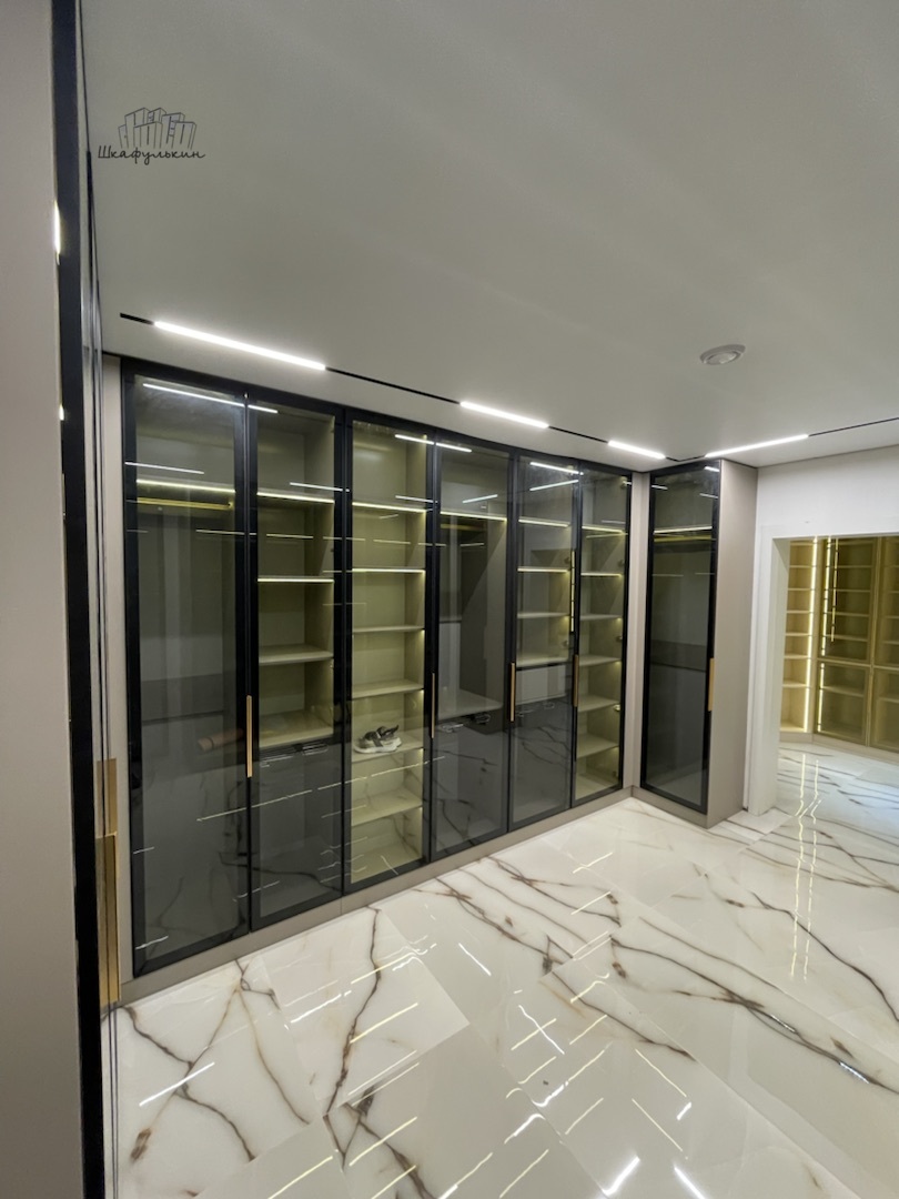Фасад распашной: 13 шт. / рамочный / AL профиль ФБМ 8 / декор: золото / вставка: стекло Бронза.