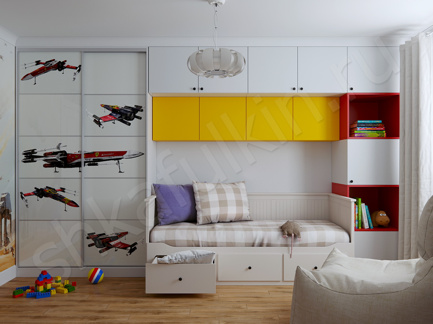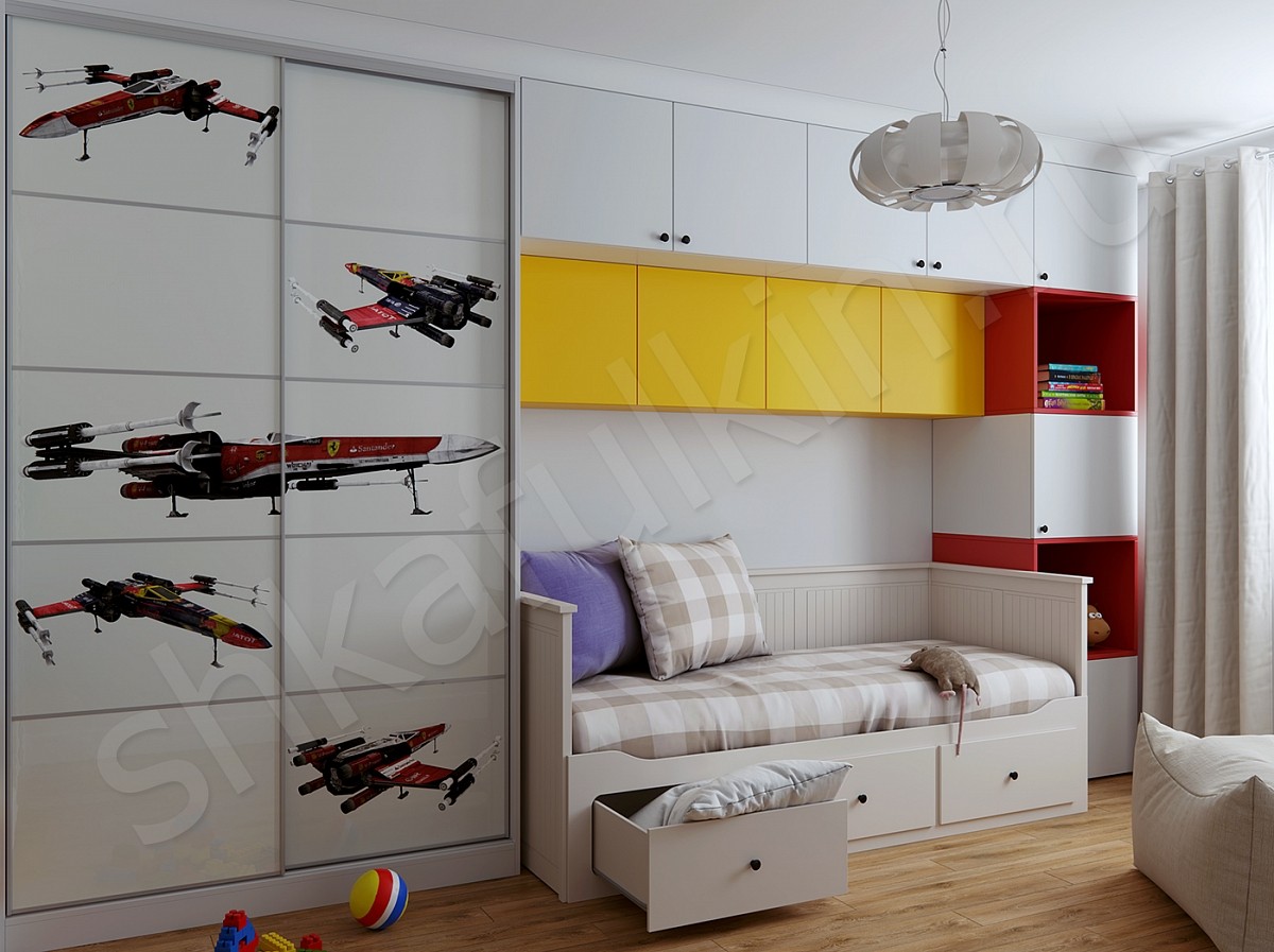 Шкаф-купе для детской комнаты с фотопечатью выглядит очень современно и красиво. Ведь так важно, чтобы малыш находился в комфортной и безопасной атмосфере. "Шкафулькин" изготавливает любую мебель на заказ, к шкафу-купе "Авиатор" мы можем изготовить современную и удобную стенку, которая будет завершать общую концепцию дизайна детской комнаты.