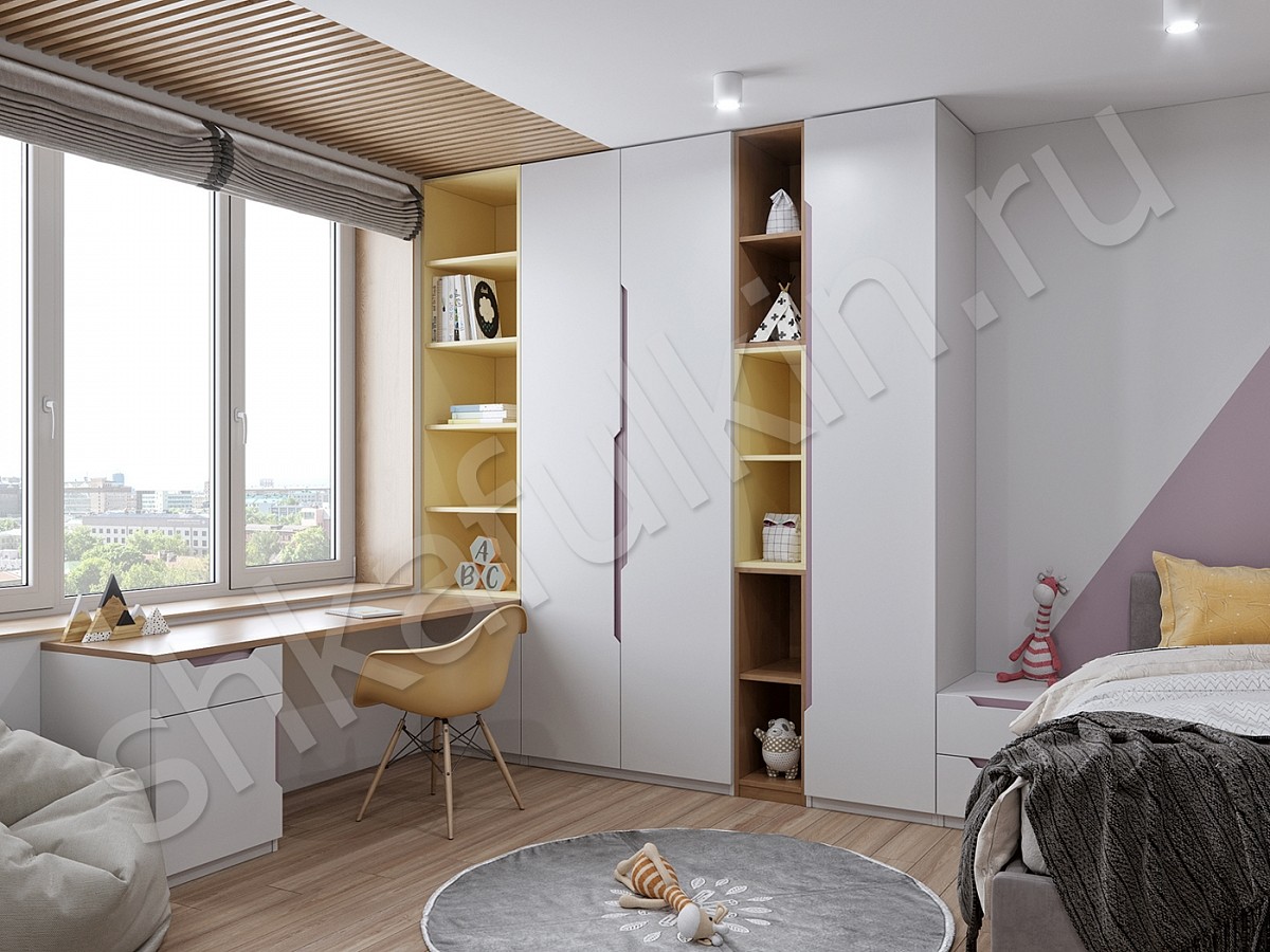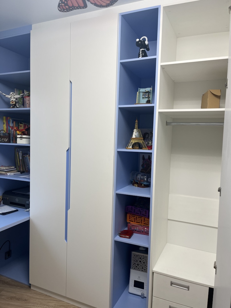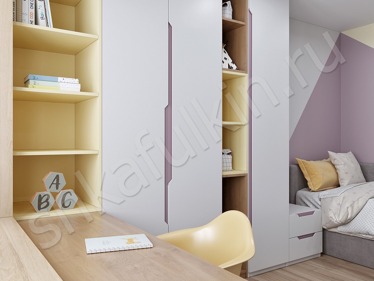 В распашном шкафу Бамбини фасад имеет особенную форму, со скрытым местом для удобного захвата. Такую возможность можно предусмотреть на этапе заказа мебельных фасадов, определившись с видом материала.