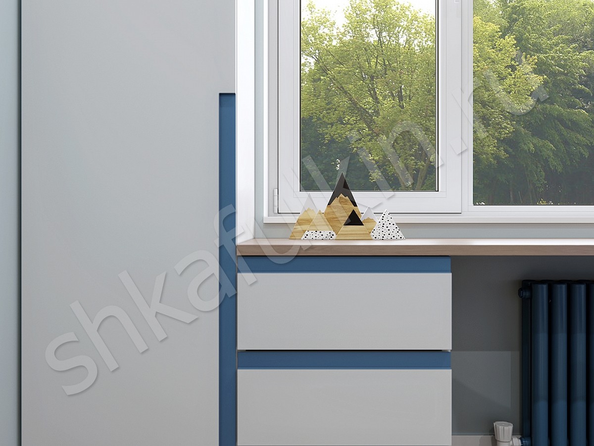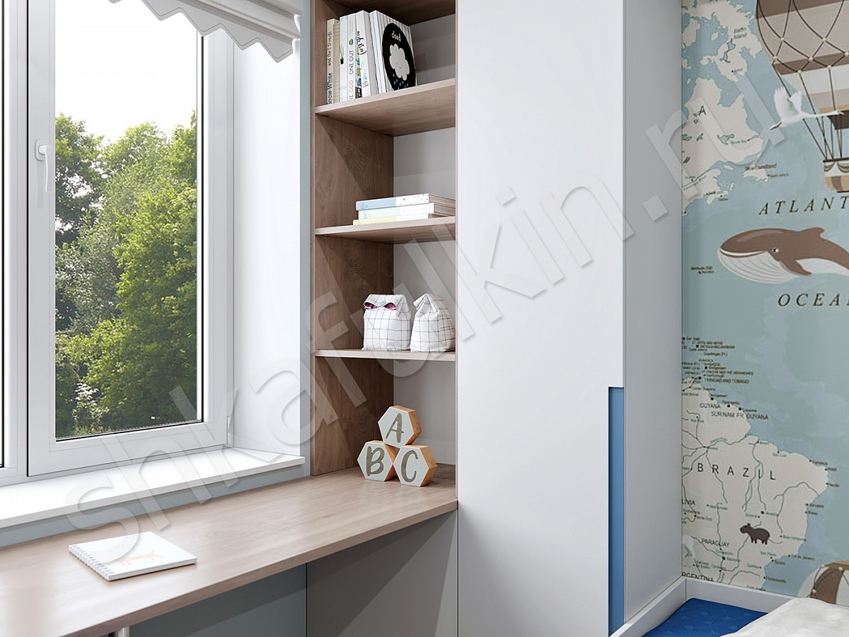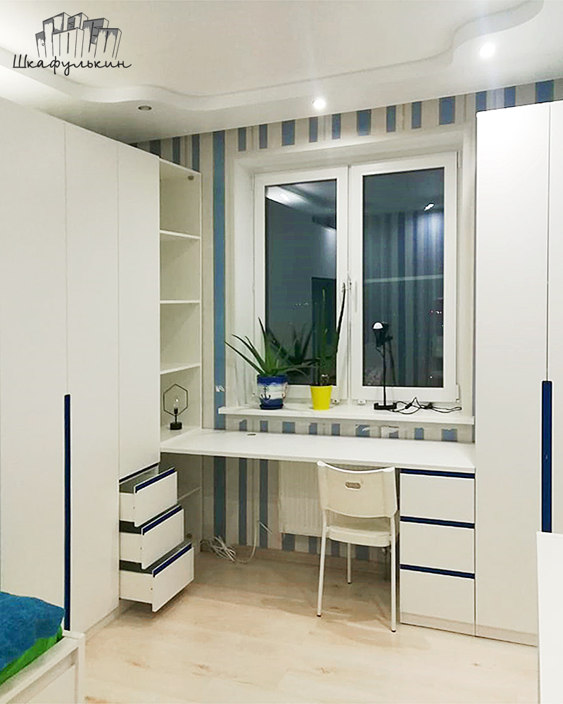 Современный распашной шкаф с рабочим местом. Корпус выполнен из ЛДСП белого цвета и под дерево. Фасады крашеные в белый цвет с фрезеровкой.