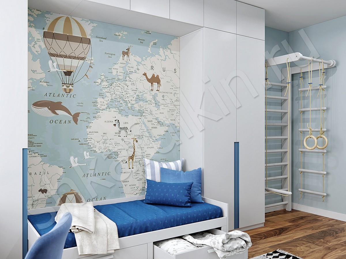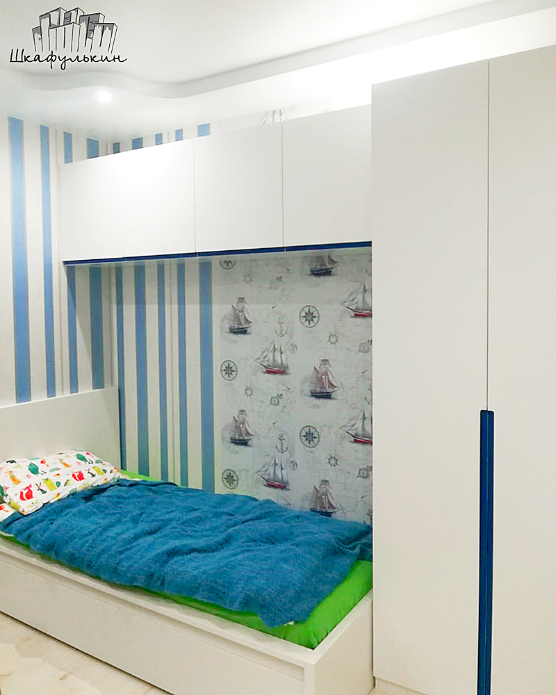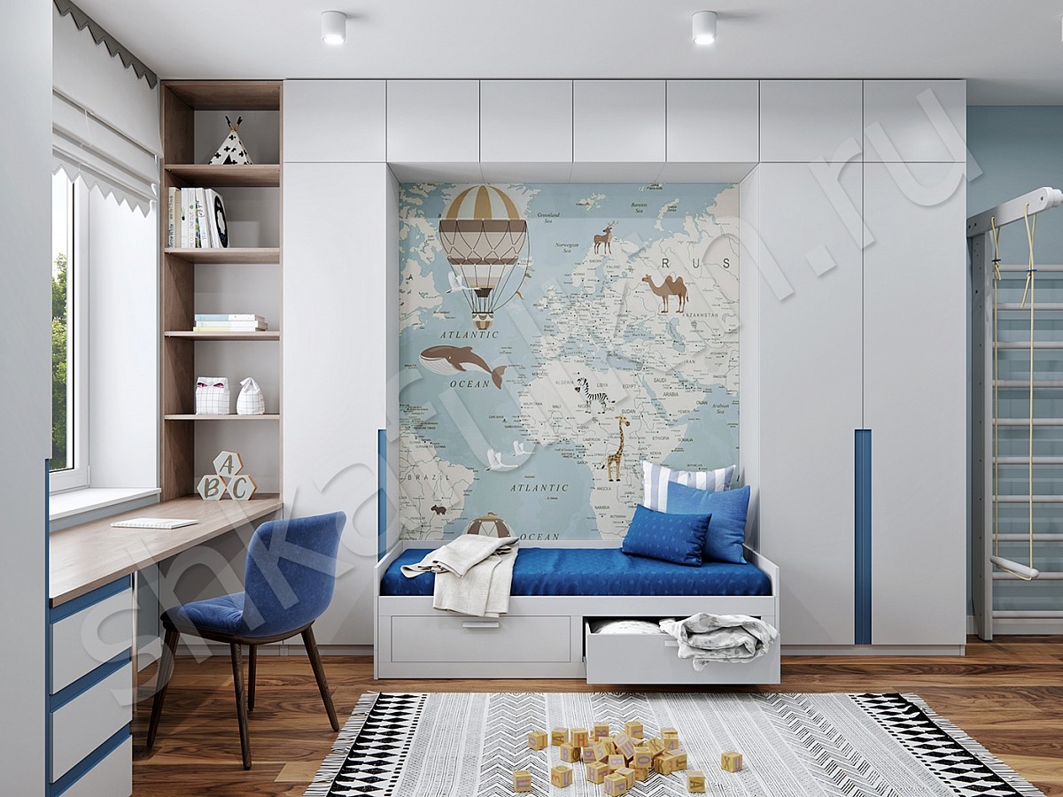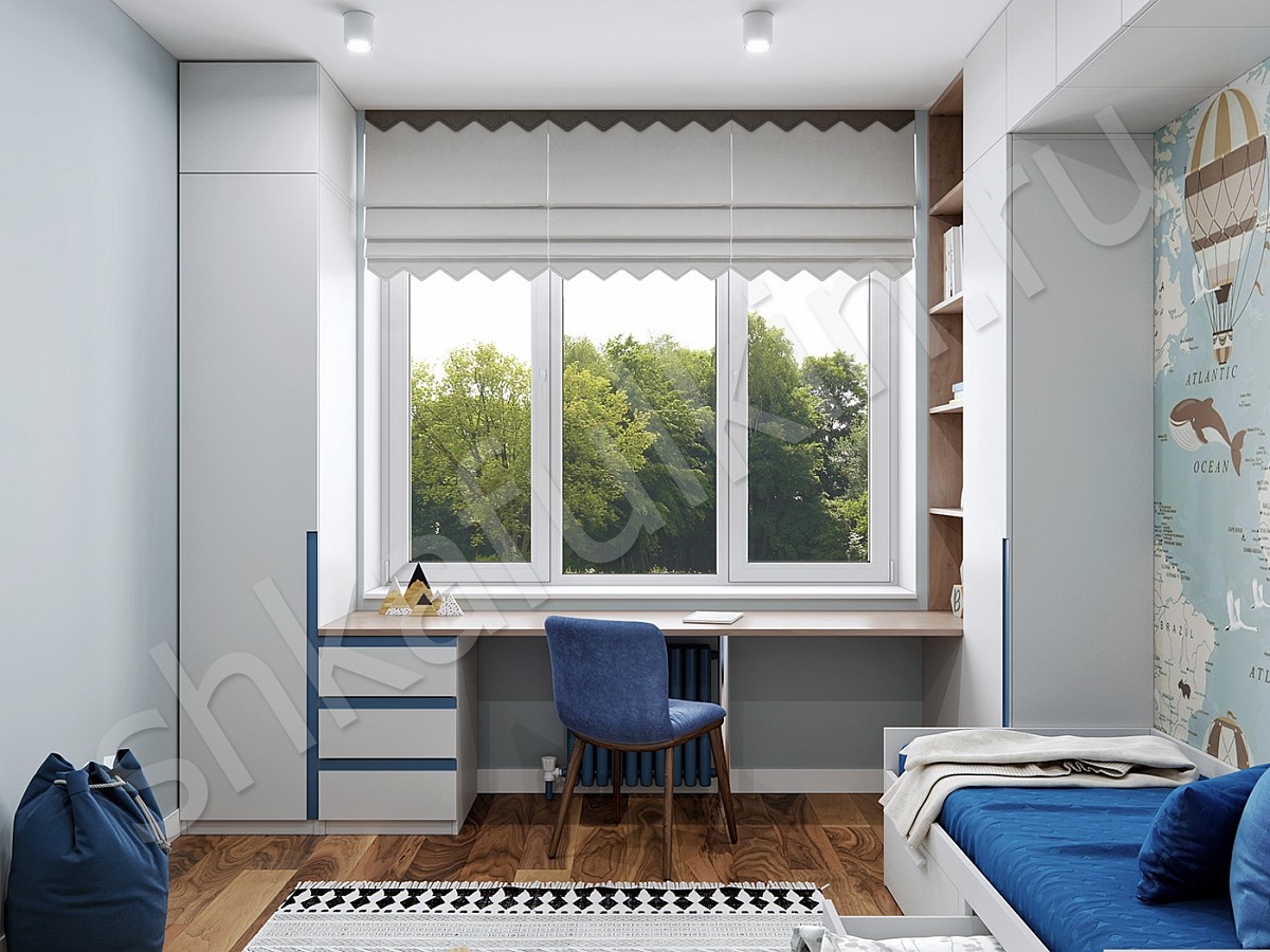 Современный распашной шкаф с рабочим местом. Корпус выполнен из ЛДСП белого цвета и под дерево. Фасады крашеные в белый цвет с фрезеровкой.
