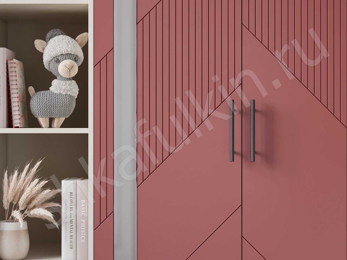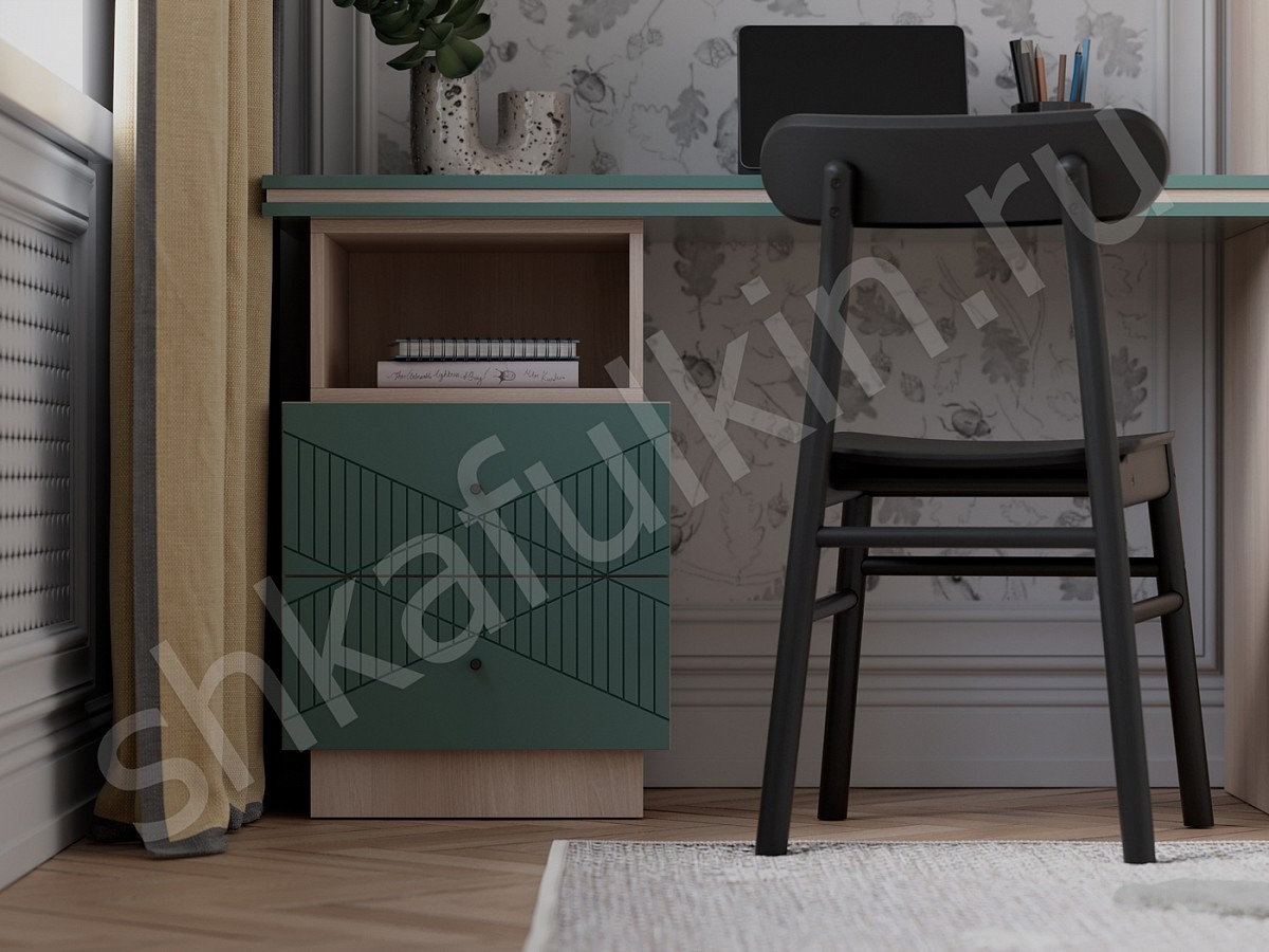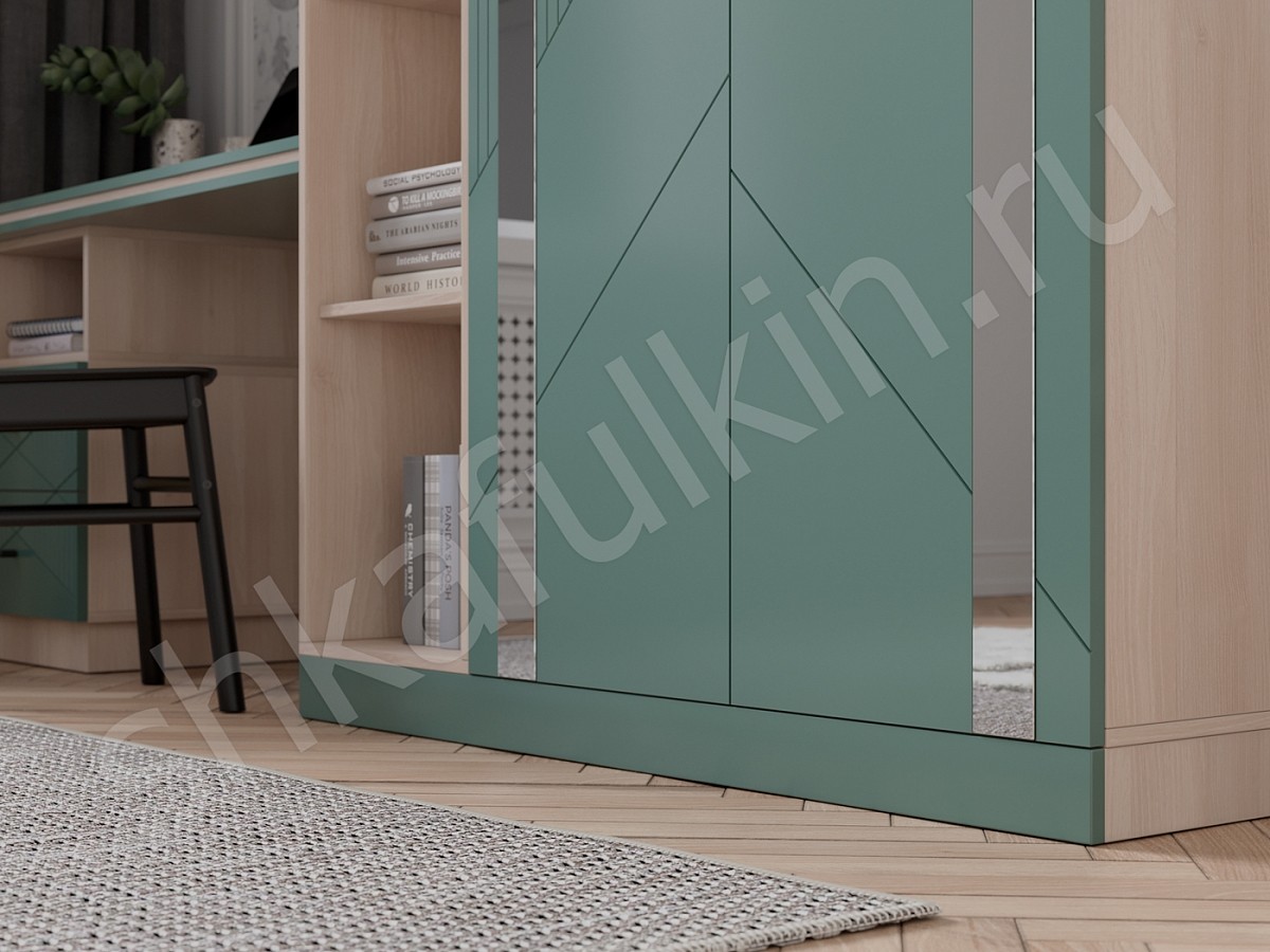 Современный распашной шкаф с рабочим местом идеален для детской комнаты. Фасады с авторской фрезеровкой, крашеные в цвет по палитре каталога NCS.