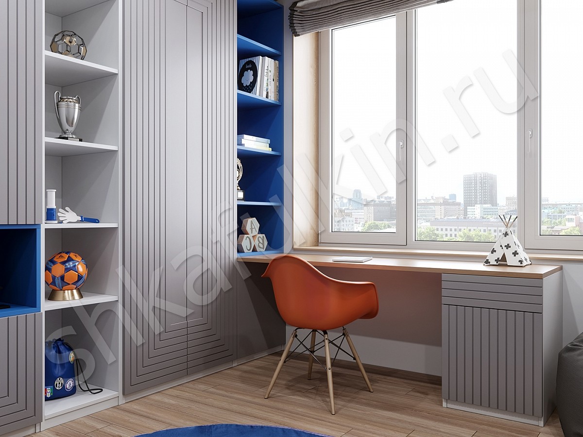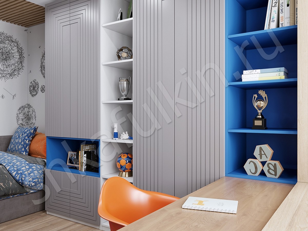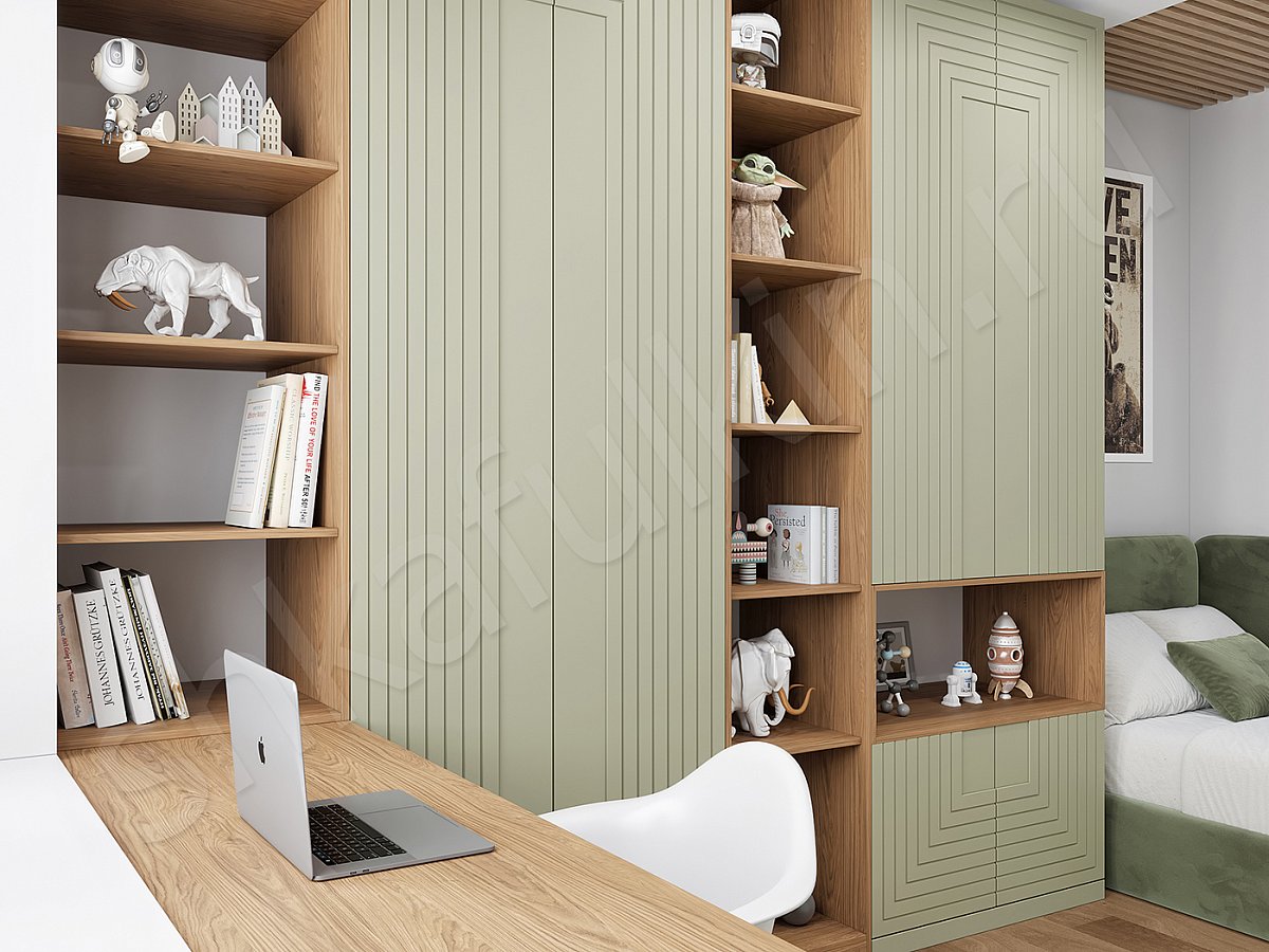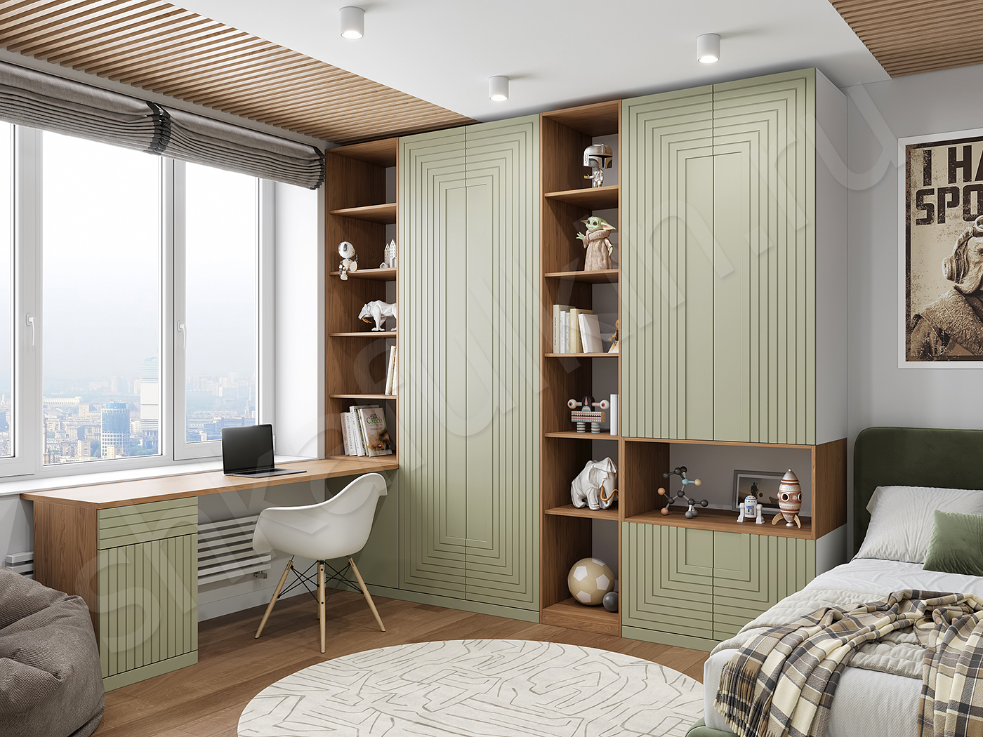 Современный распашной шкаф с рабочим местом идеален для детской комнаты. Фасады с авторской фрезеровкой, крашеные в цвет по палитре каталога NCS.