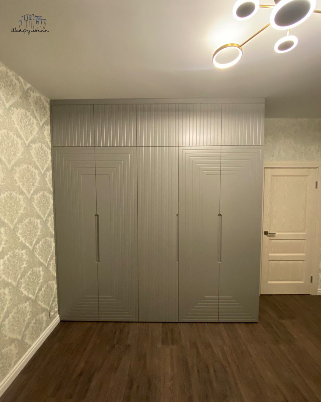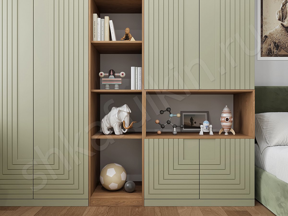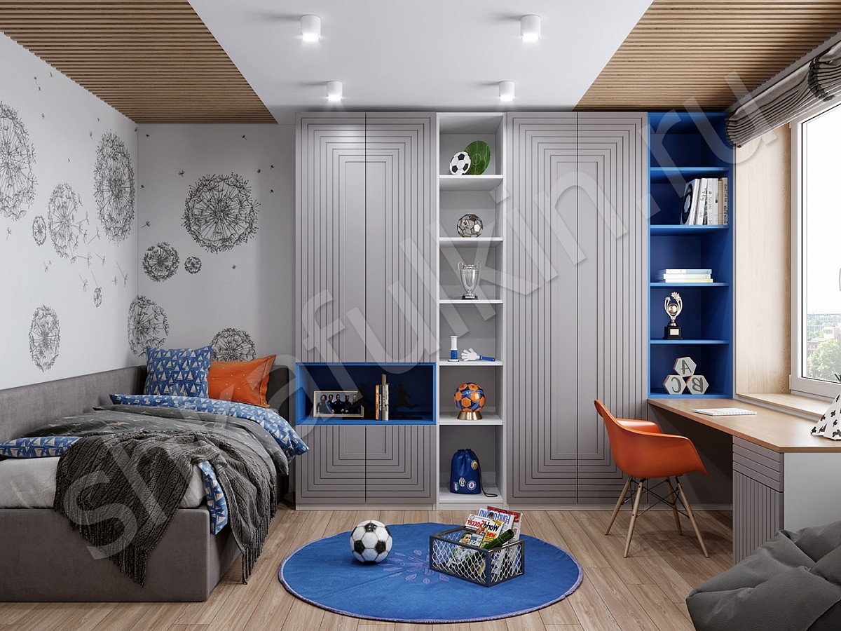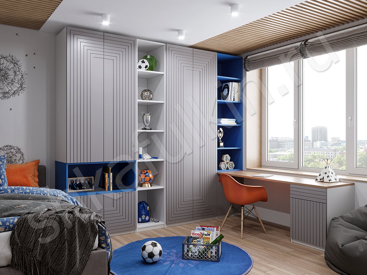 Современный распашной шкаф с рабочим местом идеален для детской комнаты. Фасады с авторской фрезеровкой, крашеные в цвет по палитре каталога NCS.