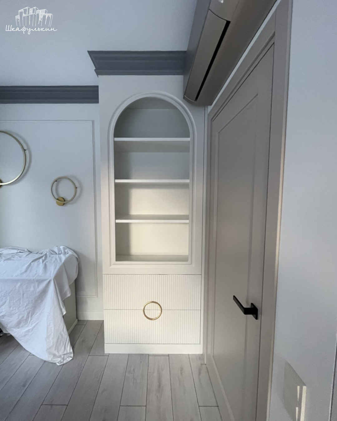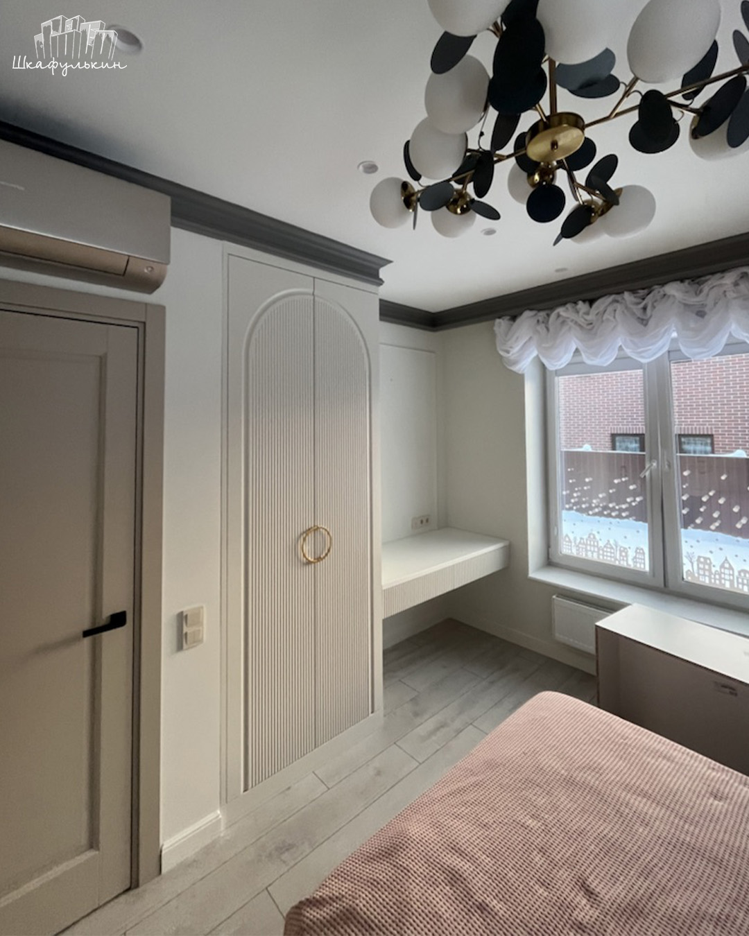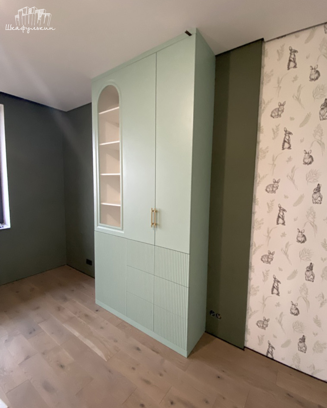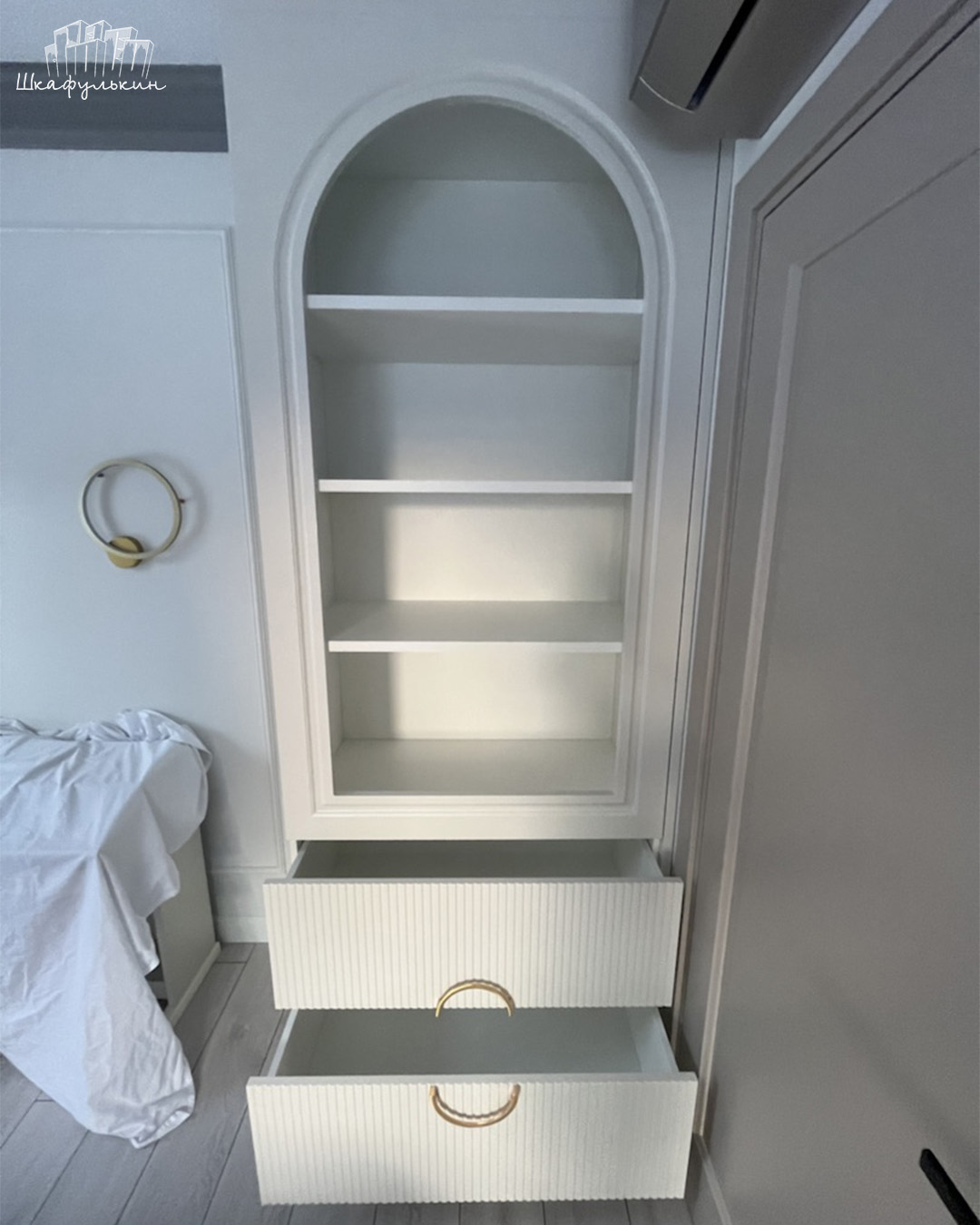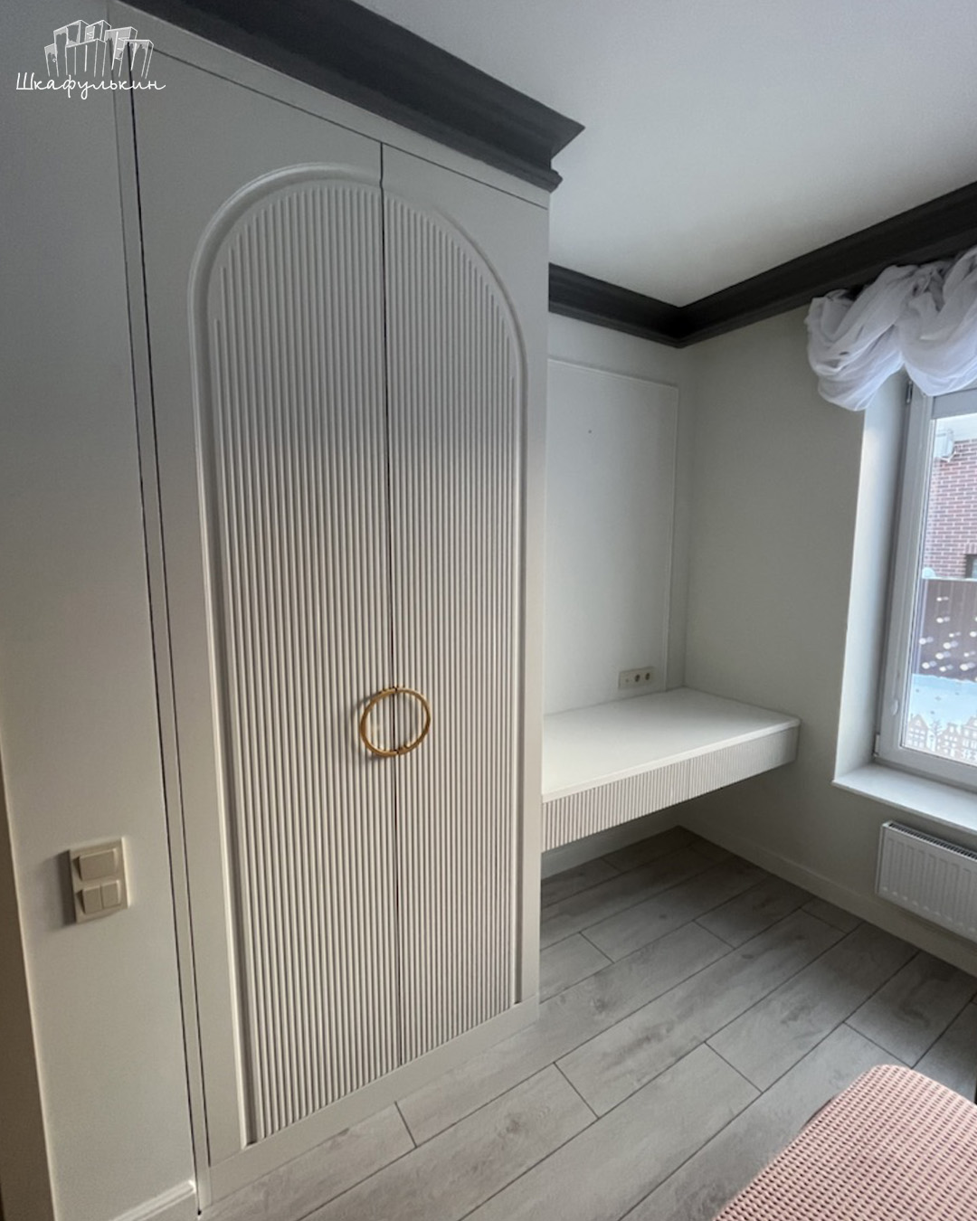 Фрезерованные фасады с арочным рисунком можно подчеркнуть цветом или витринными шкафами, как на примере для детской комнаты. Римская арка имеет идеальную форму. Она плавно и гармонично переходит в боковые стены. Такая конструкция визуально сглаживает острые углы в комнате и удлиняет потолок.
