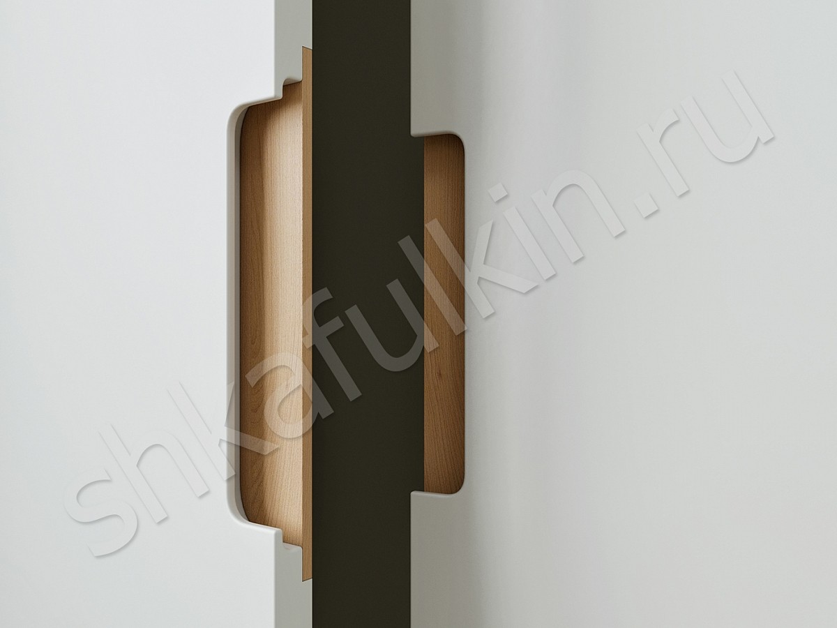 Фасад: МДФ крашенный по RAL 9002 с интегрированной ручкой и вставкой под дерево или шпон.