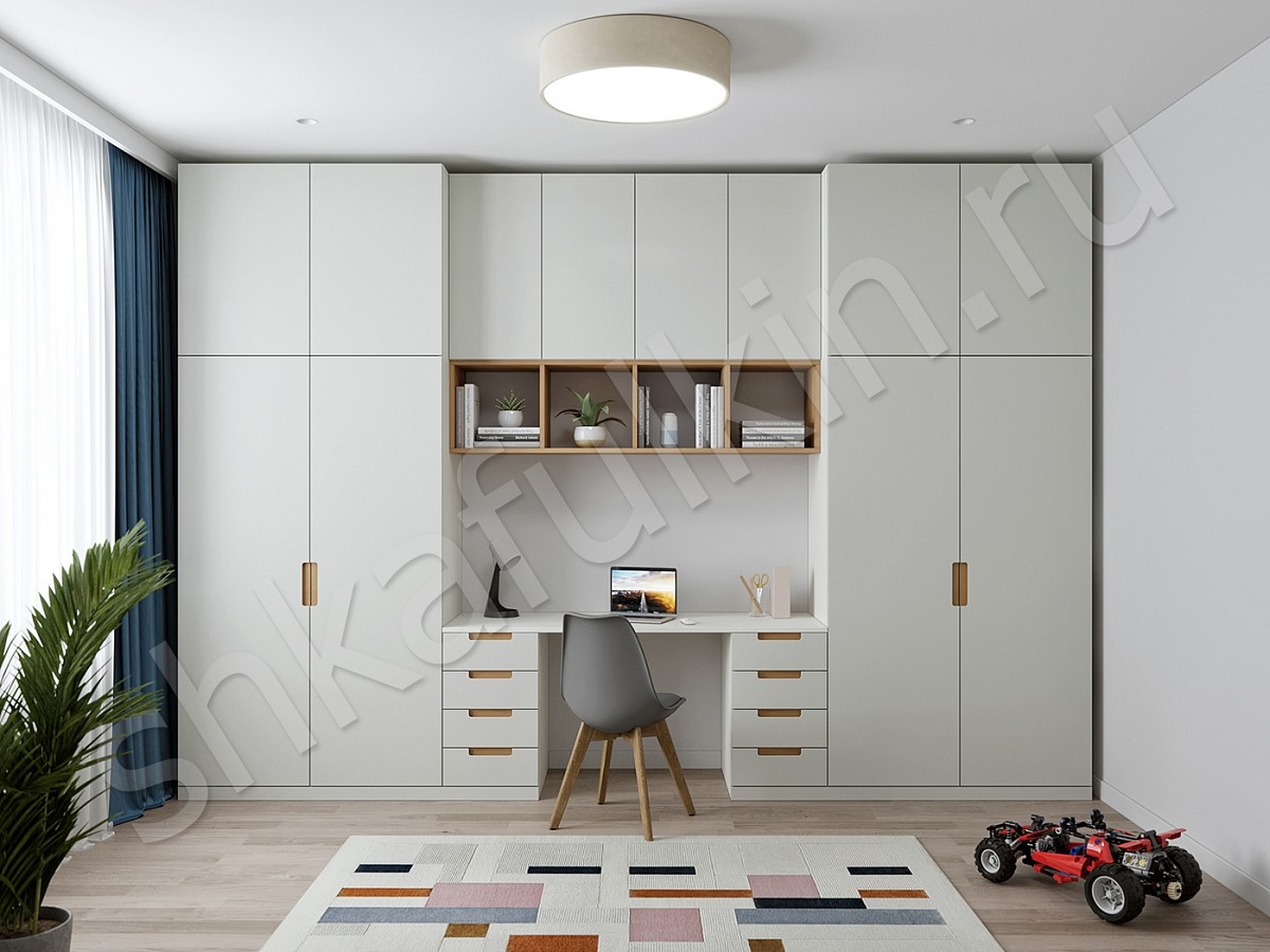 Сочетание рабочего места со шкафом для хранения вещей - это практично, удобно и позволяет сэкономить пространство в помещении. Интегрированные ручки долговечны в использовании, они не требуют особого ухода. Кроме того, они смотрятся современно и придают "изюминку" фасадам изделия.