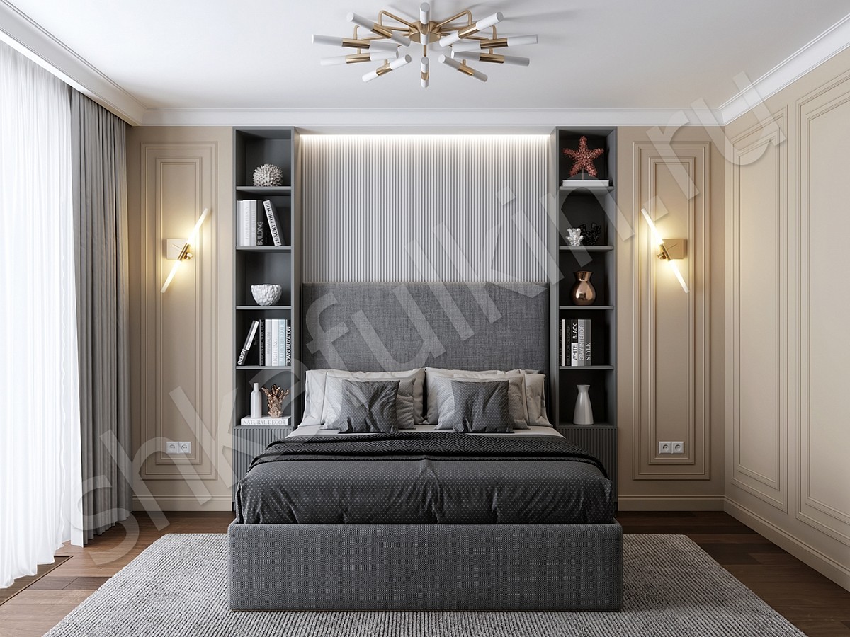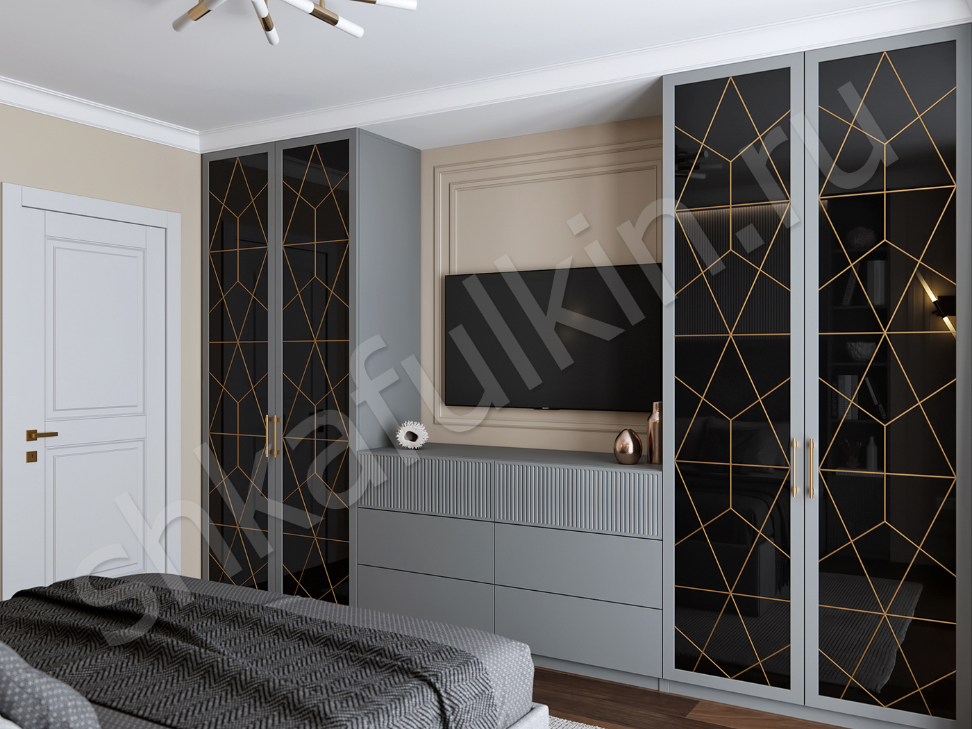 Фасады: МДФ крашенные по RAL 7037 (в цвет ЛДСП) с фрезеровкой.