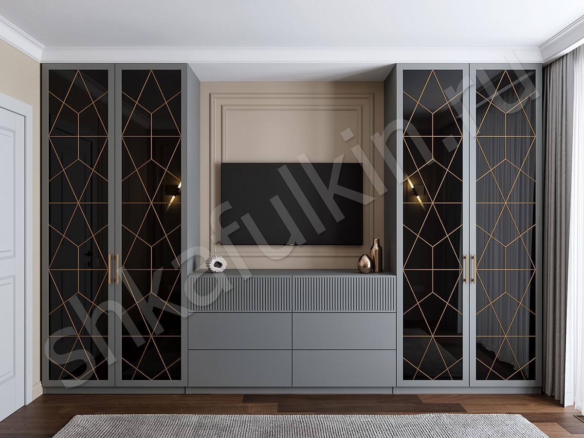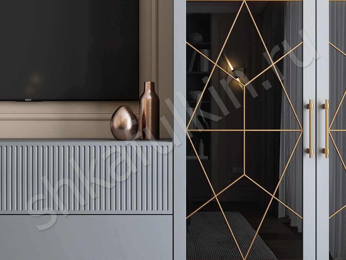 Фасады: МДФ крашенные по RAL 7037 с фрезеровкой, стекло лакобель, патина.