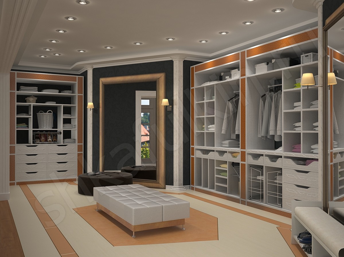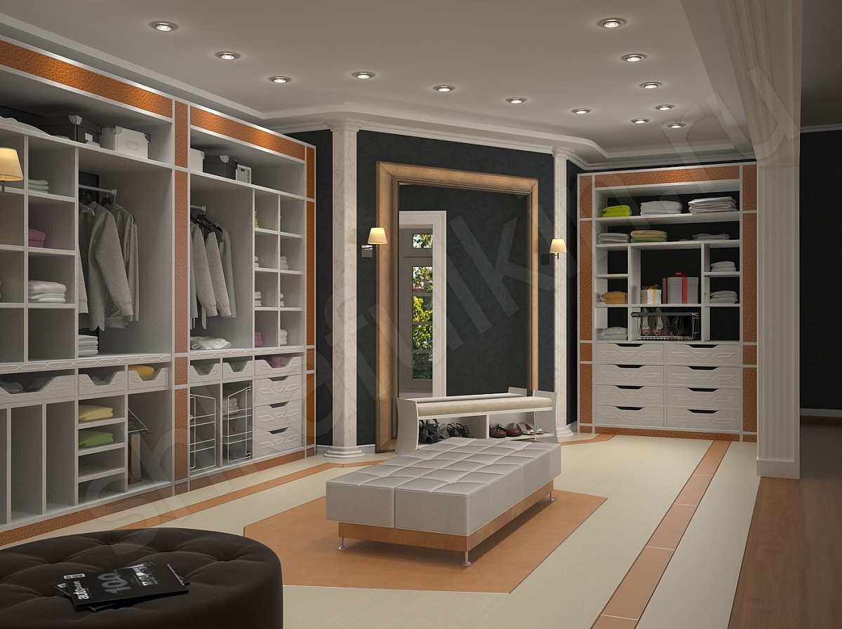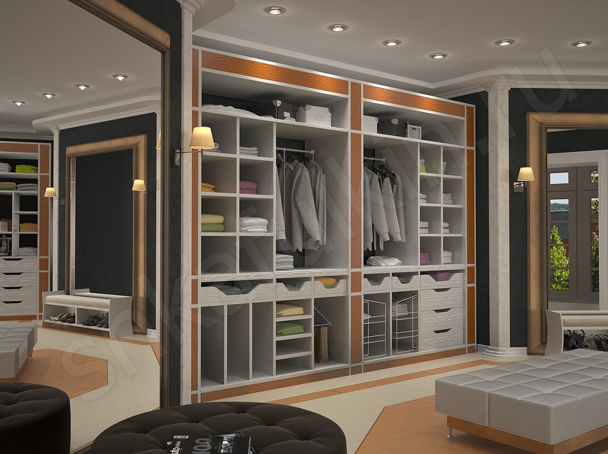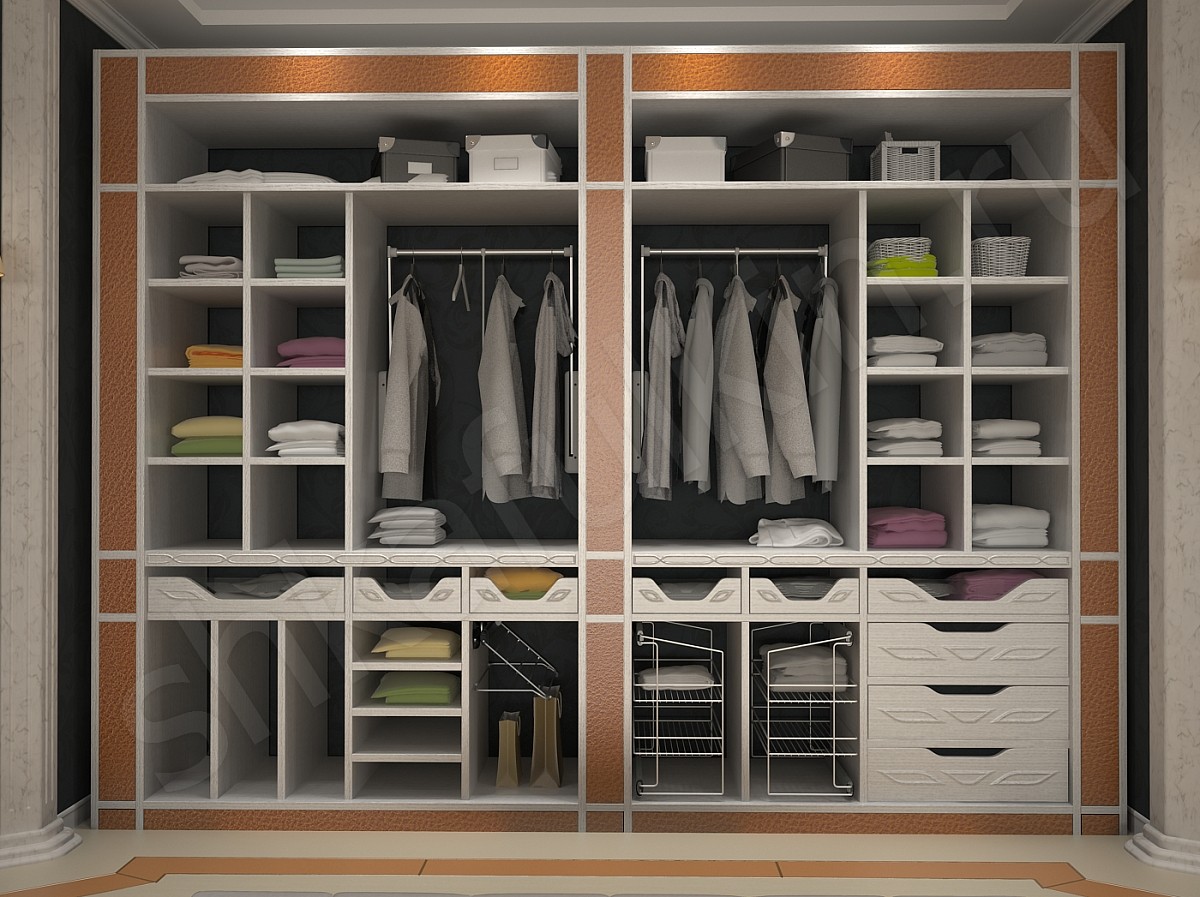 Стильно, модно и экстравагантно смотрится гардеробный шкаф с декоративными вставками из искусственной кожи. Такой вариант гардеробной комнаты придется по душе ценителям роскошной жизни и изысканных вещей. Им непременно понравится игра света и тени на поверхности материалов, качественное выполнение всех элементов и продуманное расположение частей конструкции.
