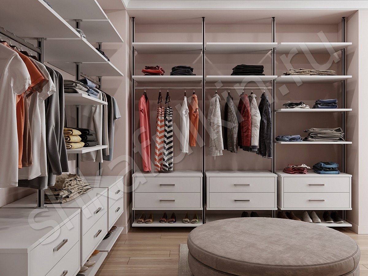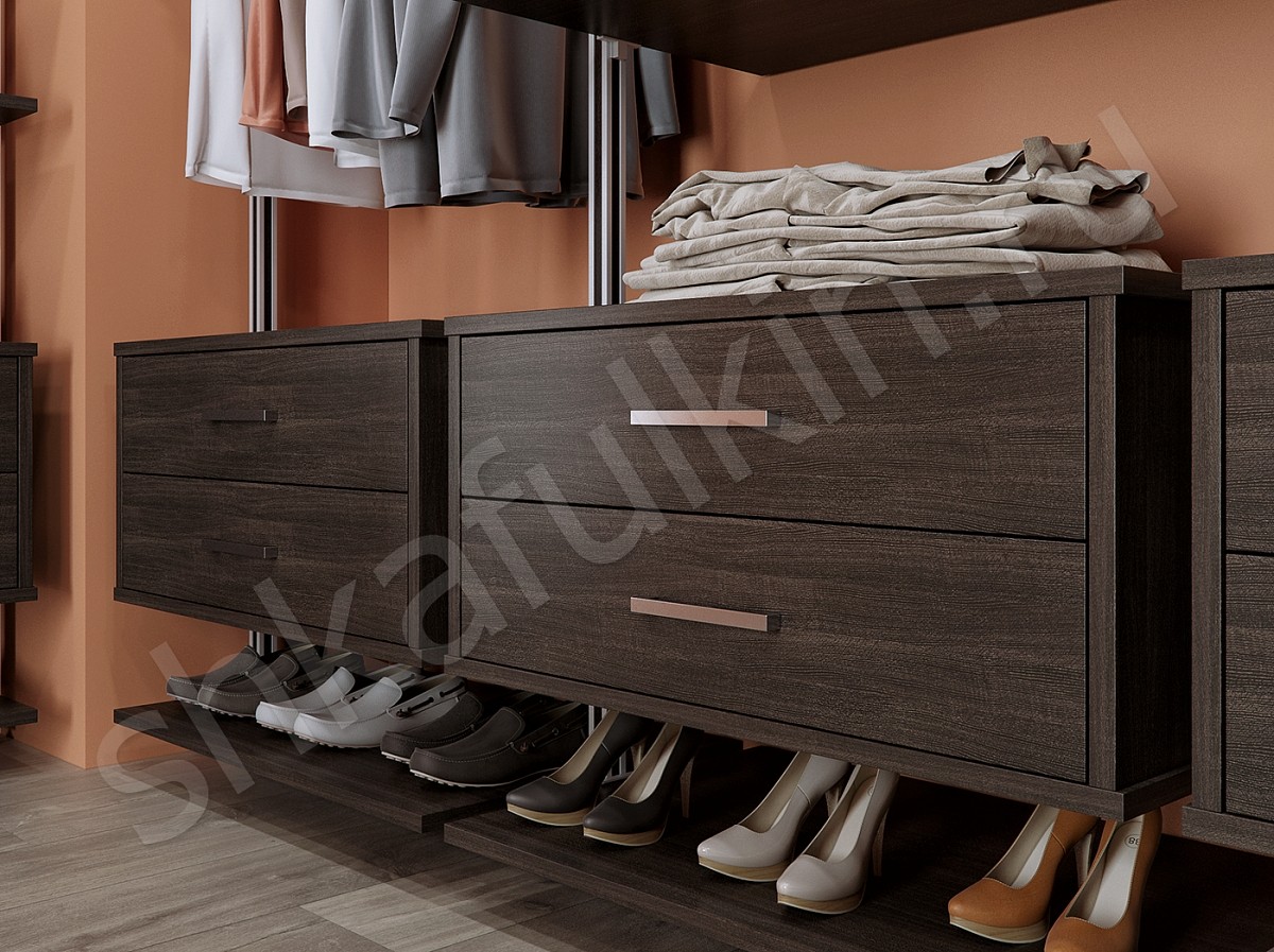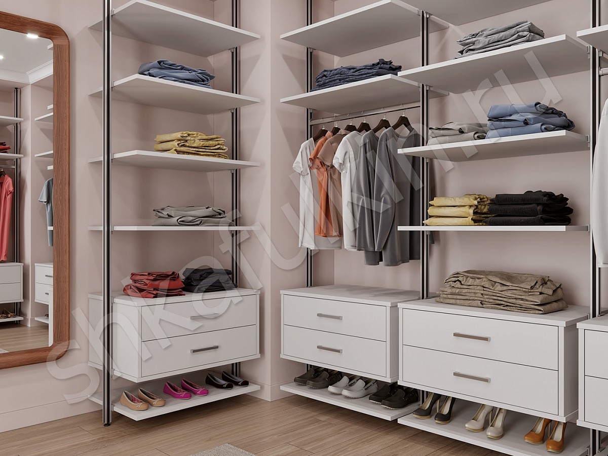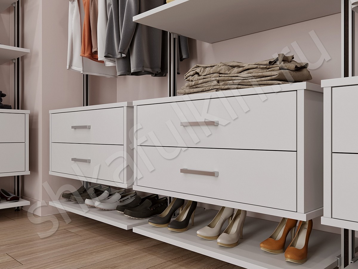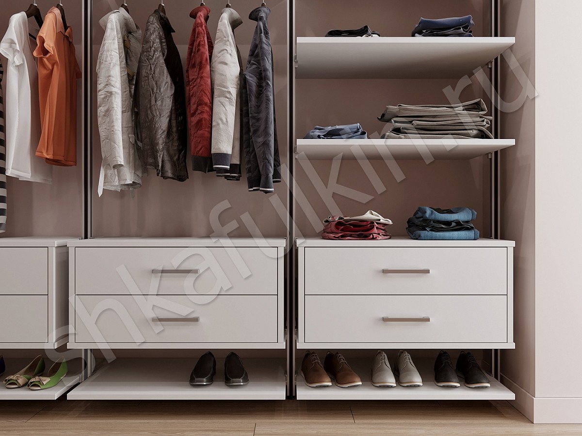 Легкая и просторная модель гардеробной Гарни отличается большой вместительностью и практичностью. Отличный вариант для обустройства гардеробной комнаты. Открытые полки для одежды и закрытые выдвижные ящики - идеальное сочетание для практичных людей.