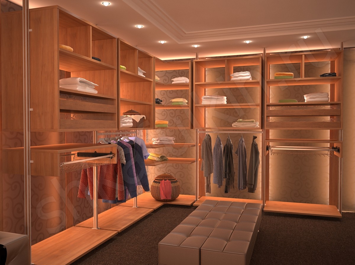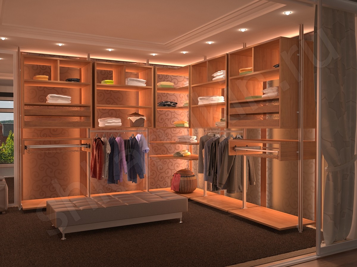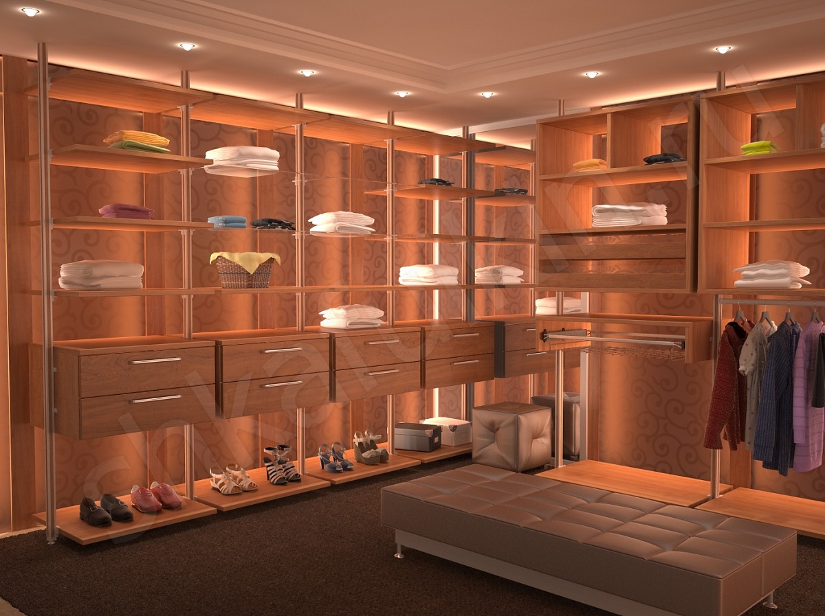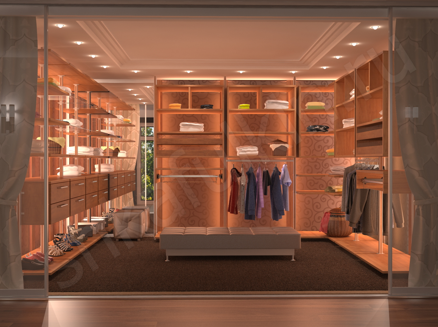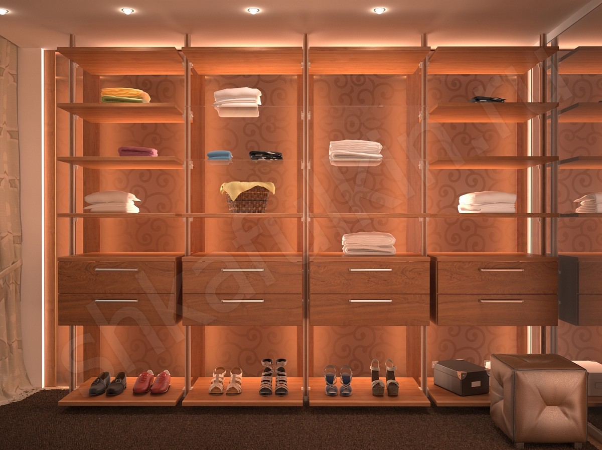Данная гардеробная система имеет удобное расположение зеркал, полочек, ящиков, штанг для вешалок, а также подсветку. Ведь даже самой практичной и удобной гардеробной пользоваться не комфортно, если как следует не продумать освещение. В помещении без окон, в полумраке, сложно разглядеть что-либо в зеркале и правильно выбрать наряд. Вы можете заказать у нас гардеробную со встроенными осветительными приборами и продуманным дизайном.