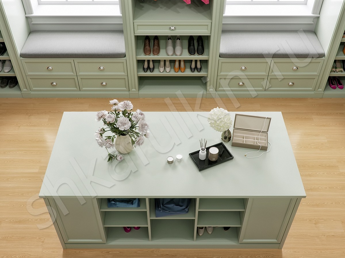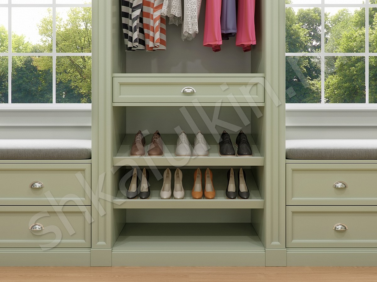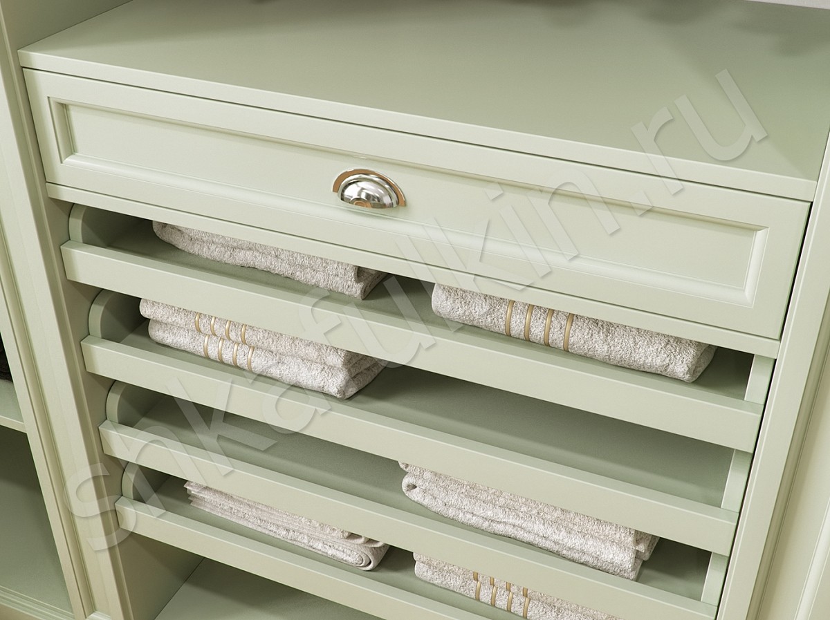 Прекрасная и нежная гардеробная "Оливия" придется по вкусу утонченной натуре. Функциональное расположение полок, ящиков и штанг делают помещение удобным и практичным. Естественный оливковый оттенок выбран не случайно, как более сложный оттенок зеленого, он прекрасно влияет на психику, способствует успокоению глаз и нервной системы. Оливковый цвет имеет свойство поглощать свет, именно поэтому оформить гардеробную комнату лучше в сочетании с белым. Не стоит забывать и про грамотное распределение света. Большие окна или мощные лампы в потолке помогут грамотно решить такую простую задачу.