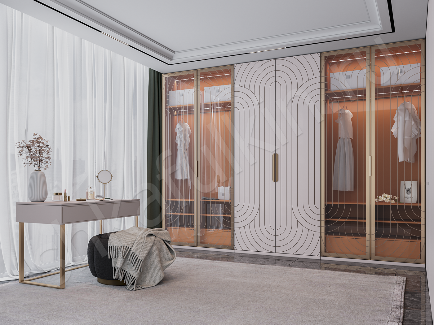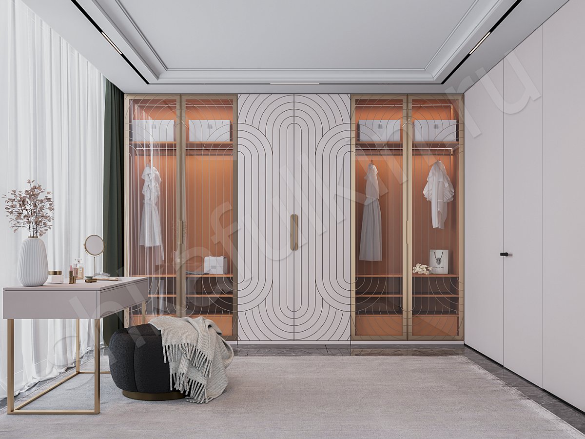 Фасады: МДФ крашенная по NCS/алюминиевый профиль с витражным контуром на стекле.