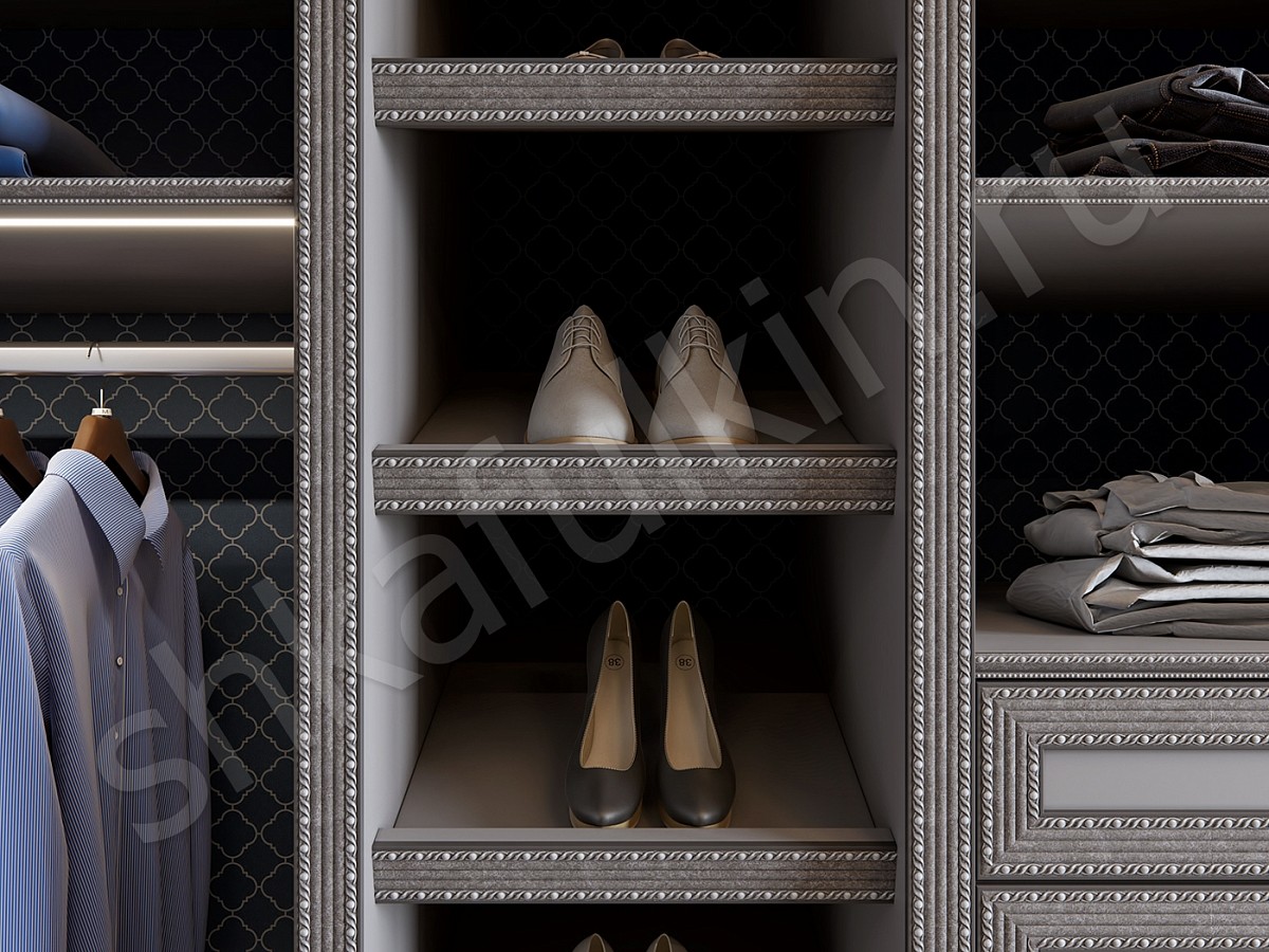 Гардеробная в сером цвете с декоративными молдингами и встроенной подсветкой - современная интерпретация классического стиля в интерьере. Грамотный дизайн гардеробной комнаты поможет избавиться от громоздких шкафов в квартире. Мы готовы воплотить дизайн-проекты от маленьких до больших размеров в разных стилях и цветовых решениях. Превратить гардеробную не просто в функциональное место хранения вещей, добавить изысканности и статусности всему помещению в целом, можно с более внушительным метражом. Появляется возможность не просто лаконично выполнить, но и добавить интерьерного шика, превратив гардеробную комнату в стильное пространство.