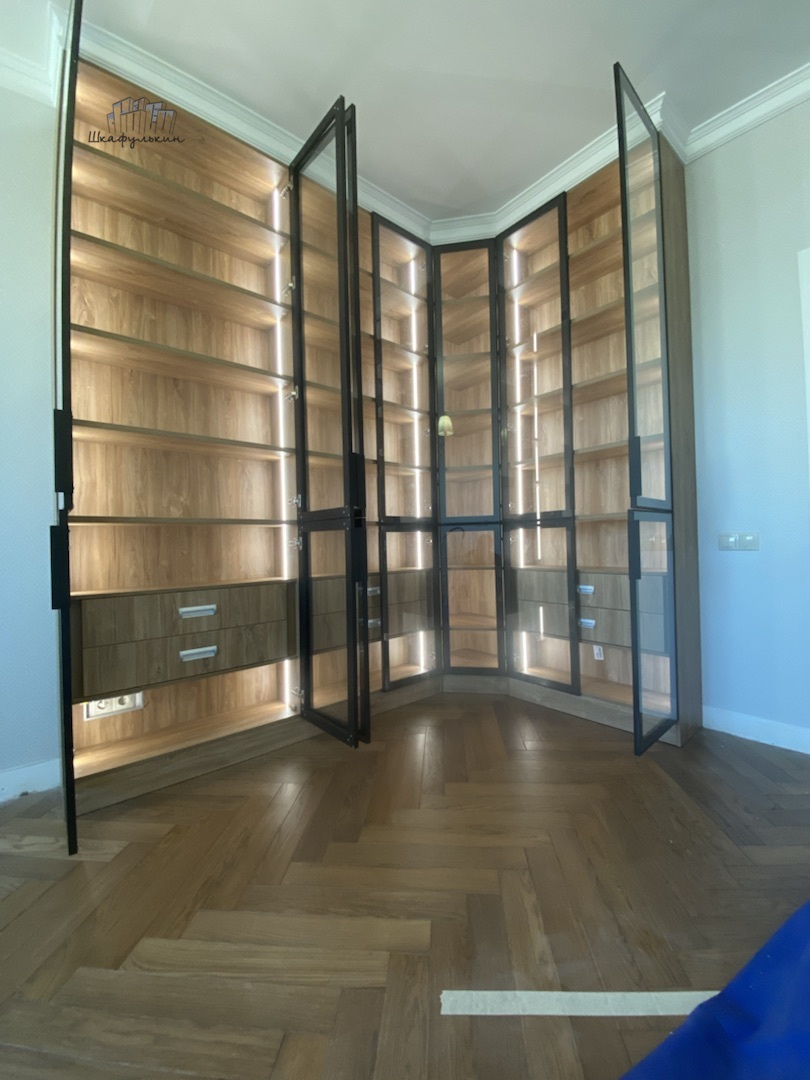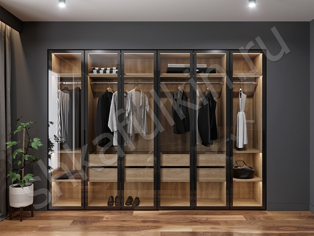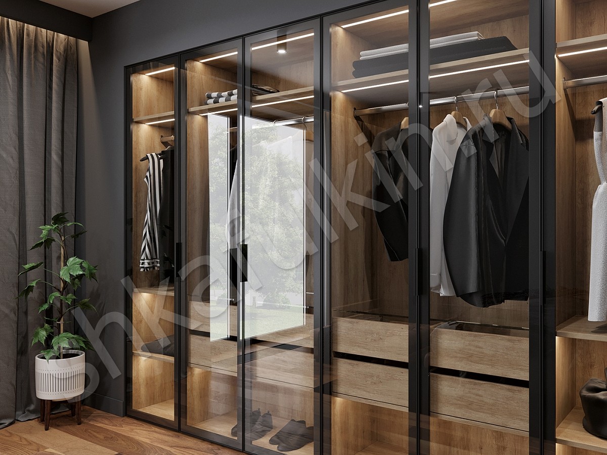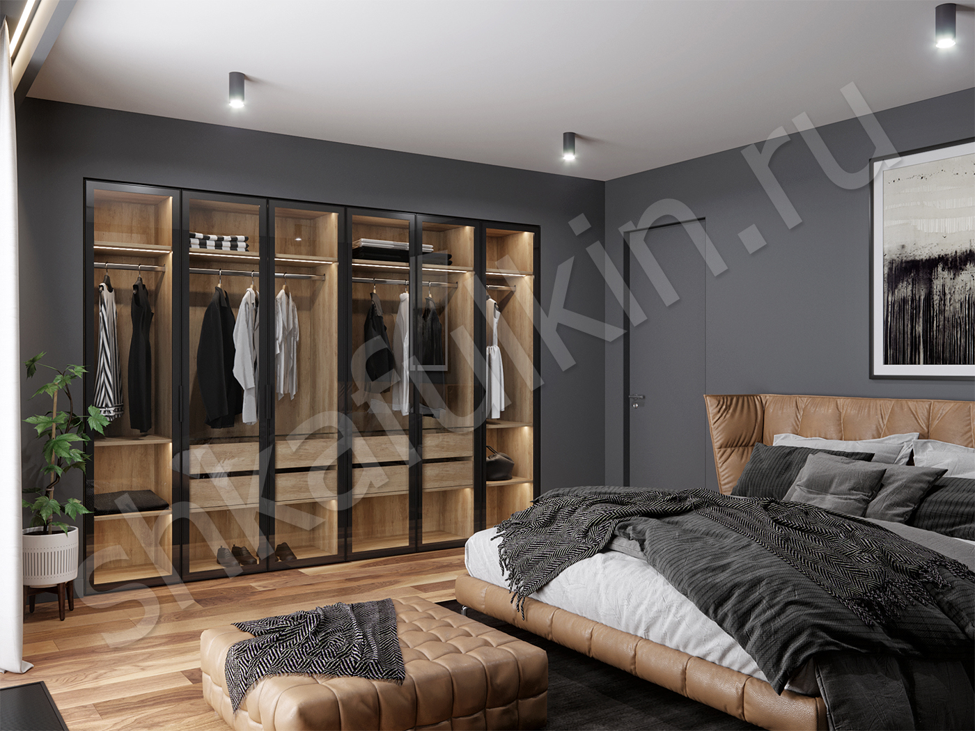 Фасады со стеклом выгодно подчеркнут стиль вашего интерьера. Конструкции из стекла всегда визуально облегчают интерьер. Стекло отражает свет и пропускает его внутрь, а значит, помещение со стеклянными стенками и полками днем не требует включения дополнительного освещения. Для удобства внутри гардеробной есть яркая подсветка. С ней гардеробная выглядит особенно эффектно.