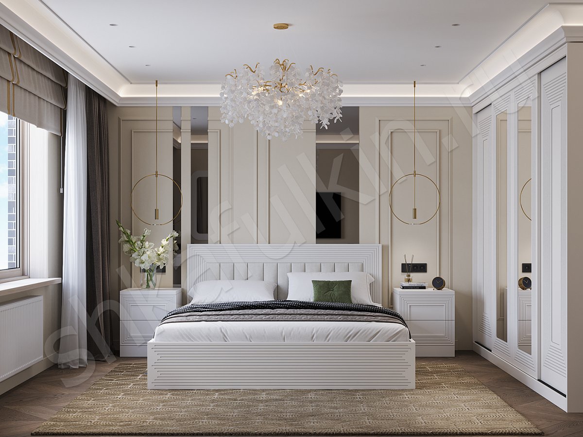 Изголовье: МДФ c фрезеровкой, крашенная по NCS/вставка ткань.