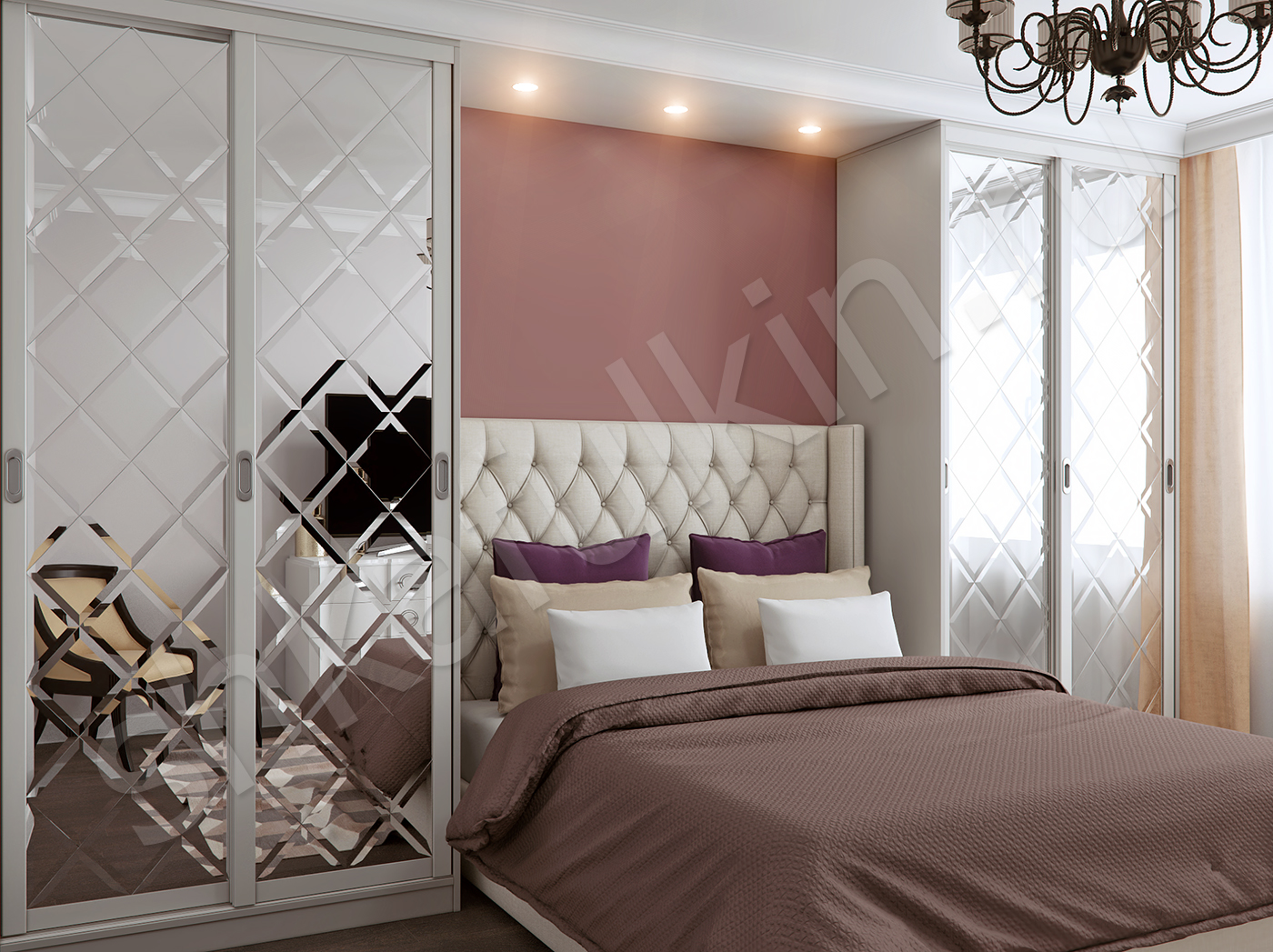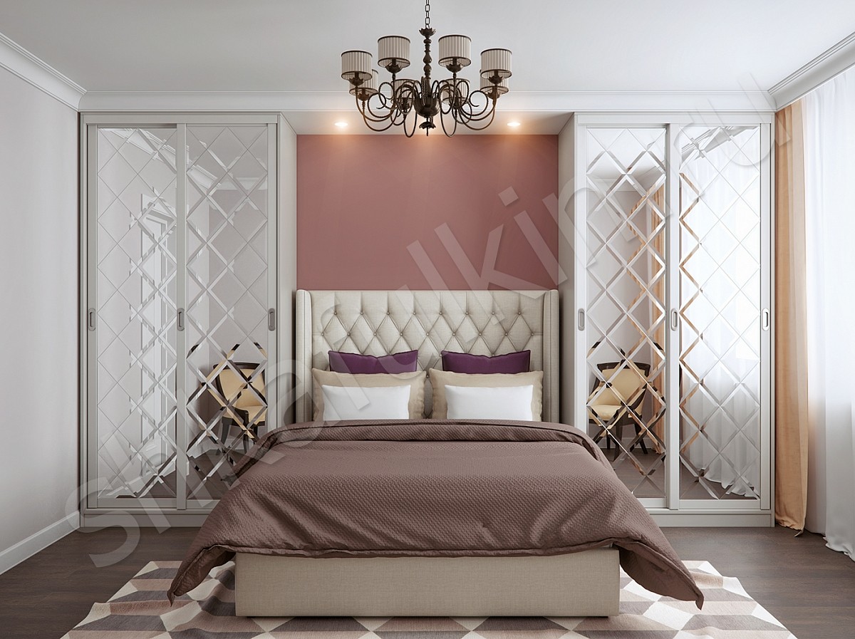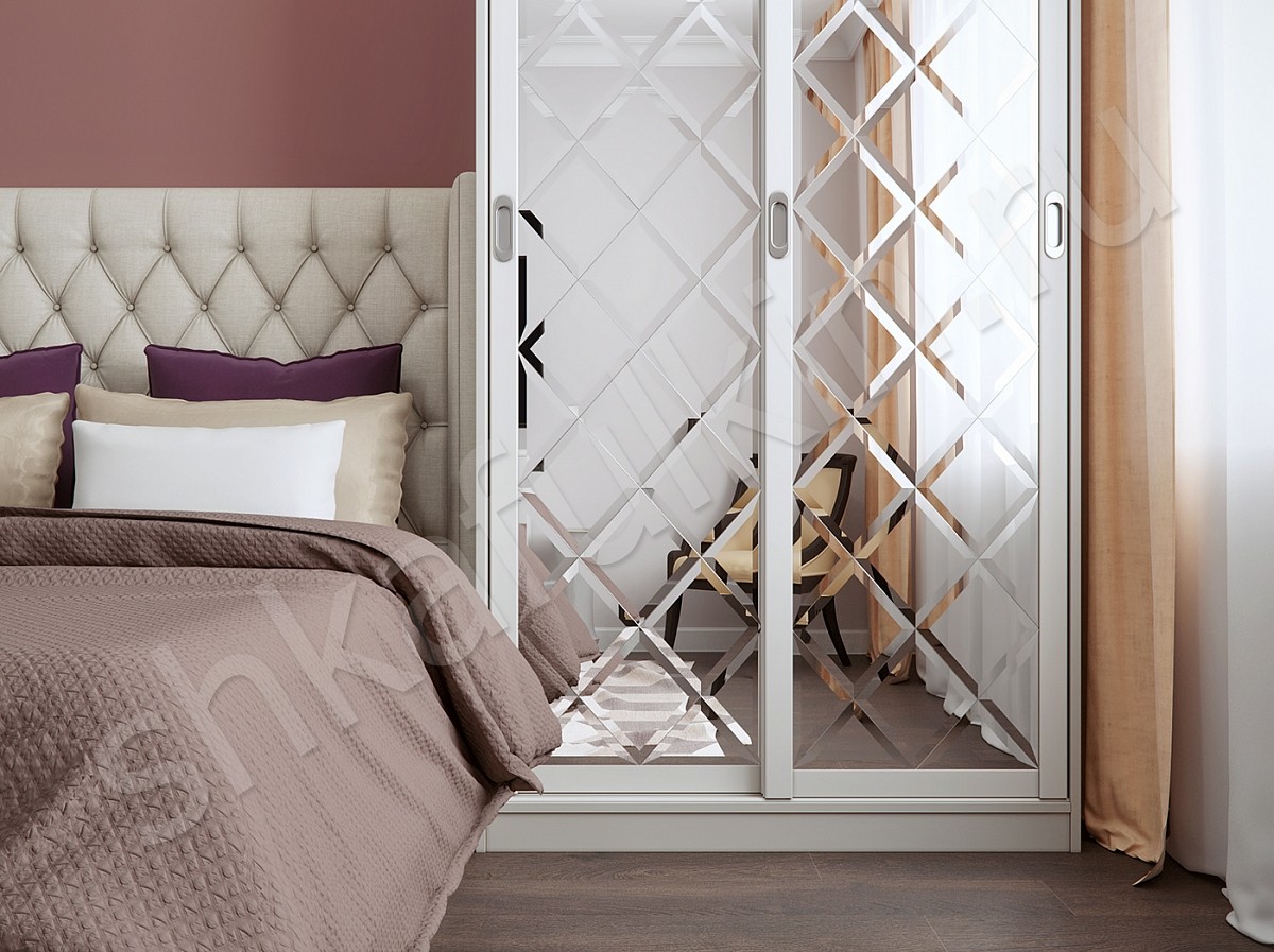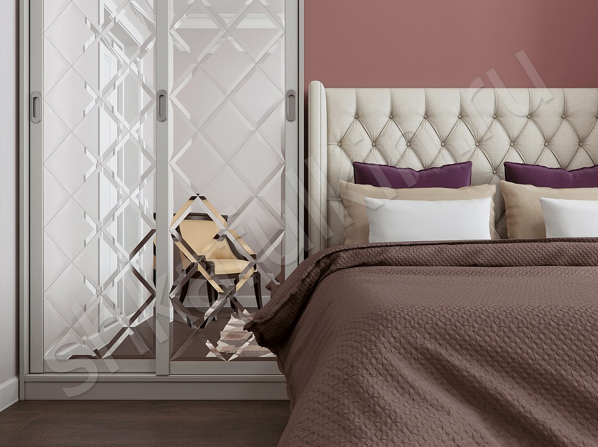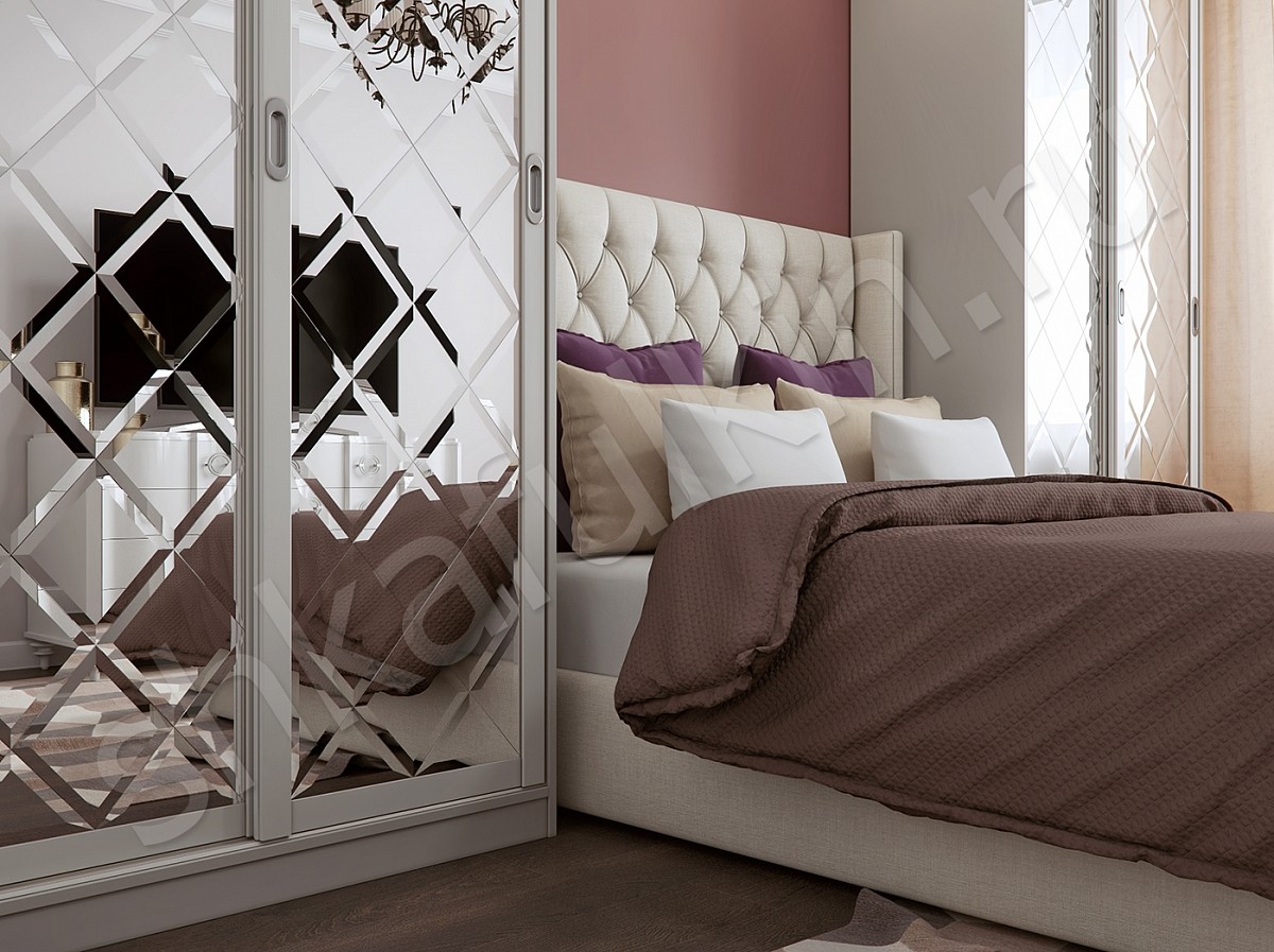 Красивой и уютной спальню делают не только оттенки стен и потолка, качественный текстиль и мягкий свет, но и грамотная планировка, и конечно же правильный выбор мебели. Шкаф-купе с зеркалом - это слишком просто и обычно. Мы предлагаем усовершенствовать такой шкаф-купе и сделать зеркало с фацетом. Такое оформление дверей гармонично дополнит интерьер спальни или гостиной. Если расположить пару одинаковых шкафов по сторонам кровати, то это сделает комнату не только удобной для каждого члена семьи, но и более гармоничной. Симметрия создает ощущение "правильности" и поможет сэкономить пространство перед кроватью и освободить его для другой, необходимой в комнате, мебели. Если Вы не хотите делать два шкафа-купе в спальне, то один из шкафов возле кровати может быть заменен высоким комодом, стеллажом или открытыми подвесными полками.