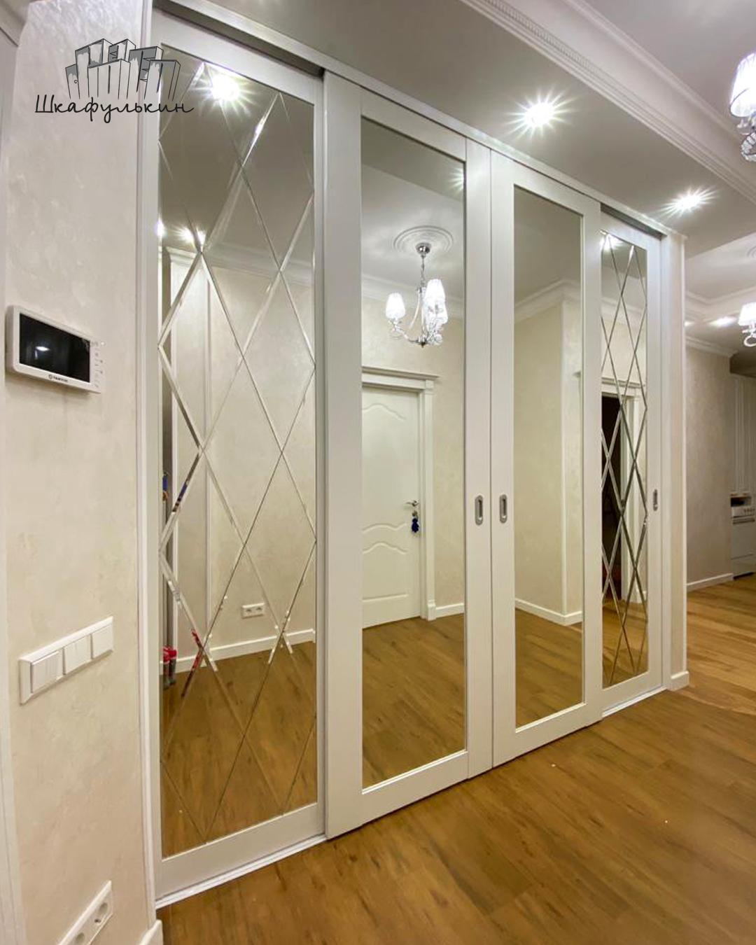 Двери: зеркало с фацетом, пленка безопасности, шлегель, тихоходные ролики.