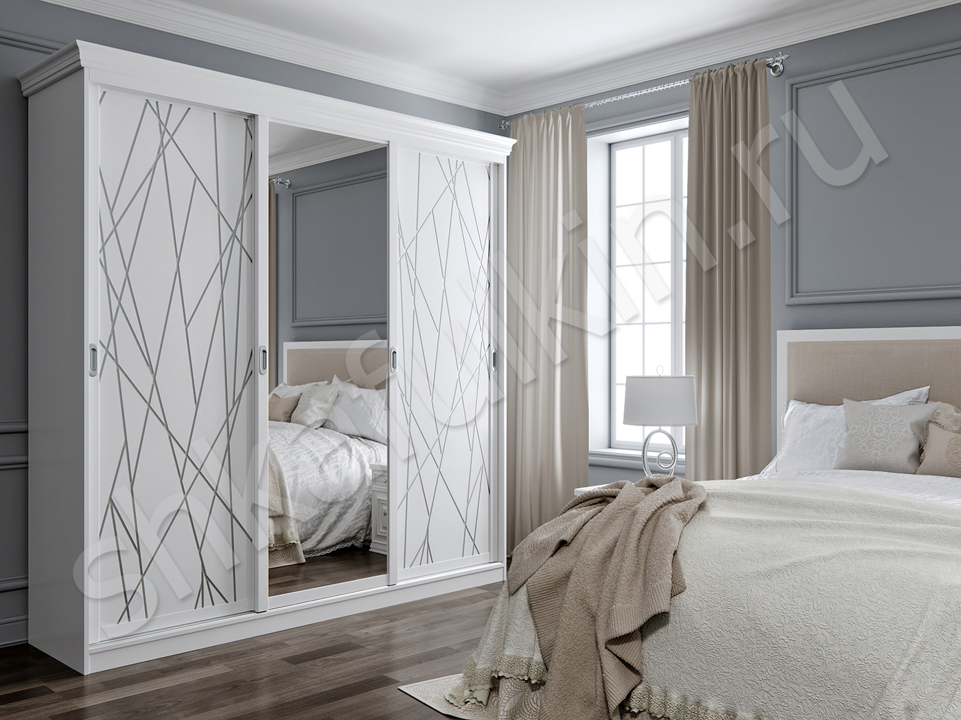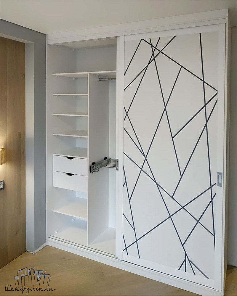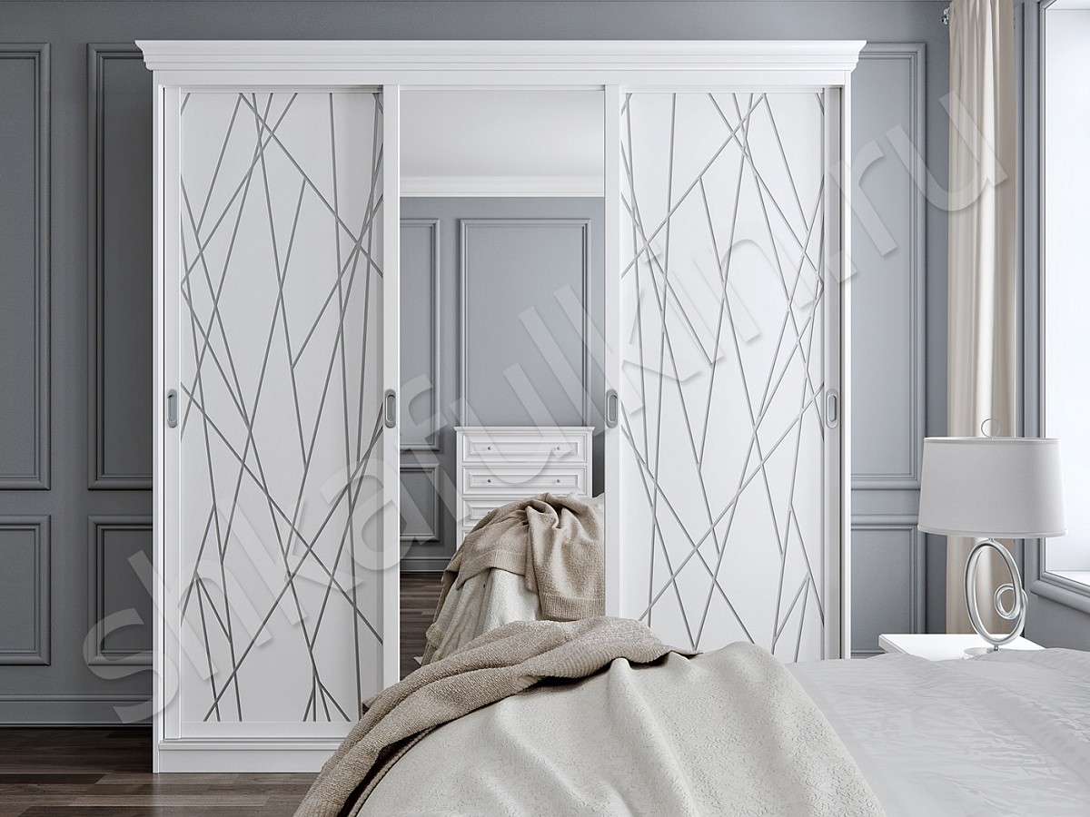 Стильный шкаф-купе станет украшением вашей спальни или гостиной. Двери-купе выполнены с фрезерованными фасадами и нанесением серебряного рисунка, также возможно изготовление таких фасадов с фотопечатью. Для того, чтобы шкаф стал гармоничной деталью интерьера, необходимо учитывать те цвета, которые уже используются в помещении. Лучше, чтобы эти цвета сочетались или работали на контрасте. Не стоит использовать в оформлении шкафа более двух цветов, особенно если в интерьере присутствуют другие цвета.