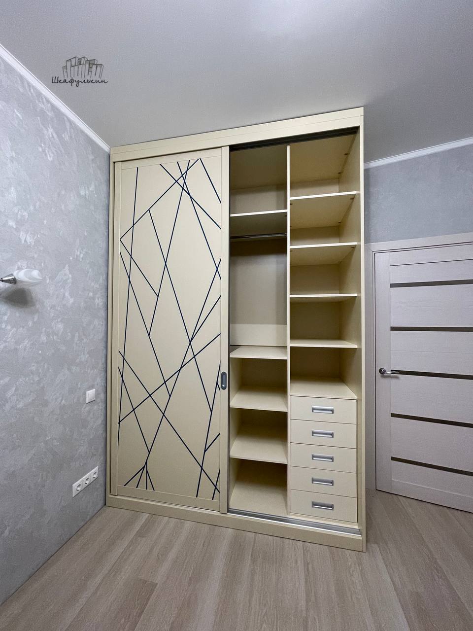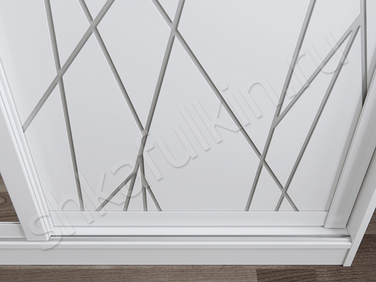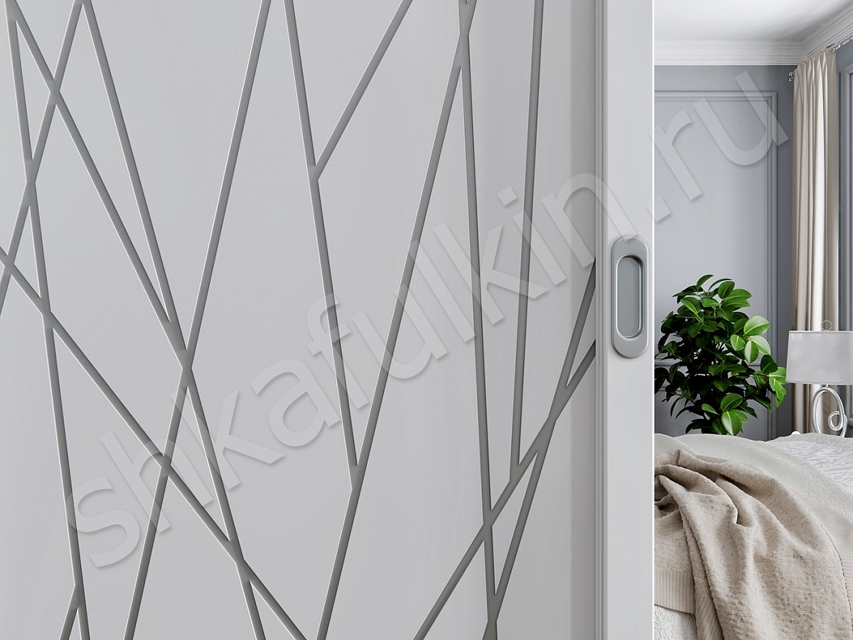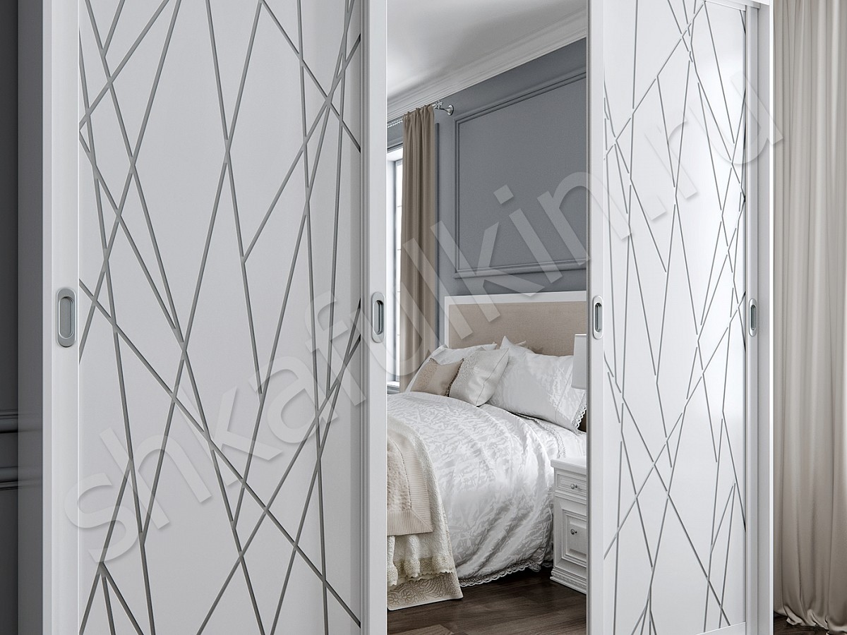 Двери: МДФ с белой покраской с фрезеровкой и серебряной патиной или фотопечатью.