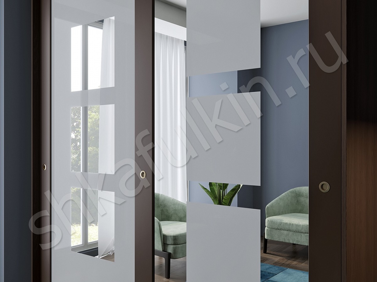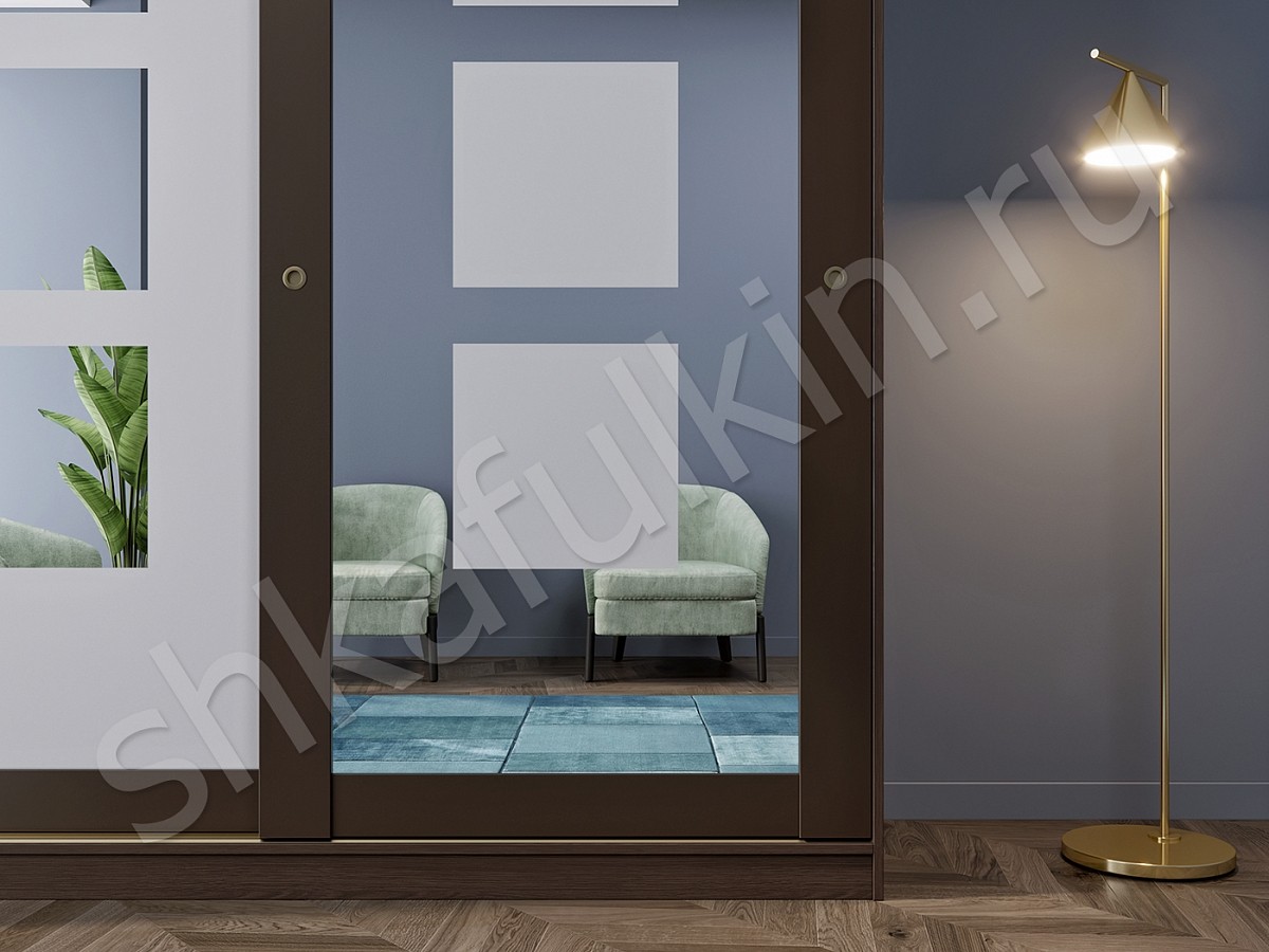 Двери: профиль NCS S 8010-Y50R или профиль Люкс, зеркало с пескоструйным рисунком на выбор, тихоходные ролики, врезные круглые ручки.