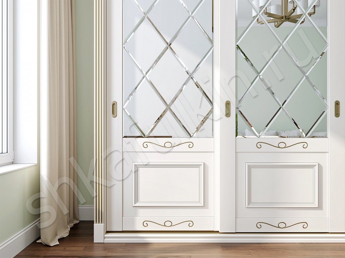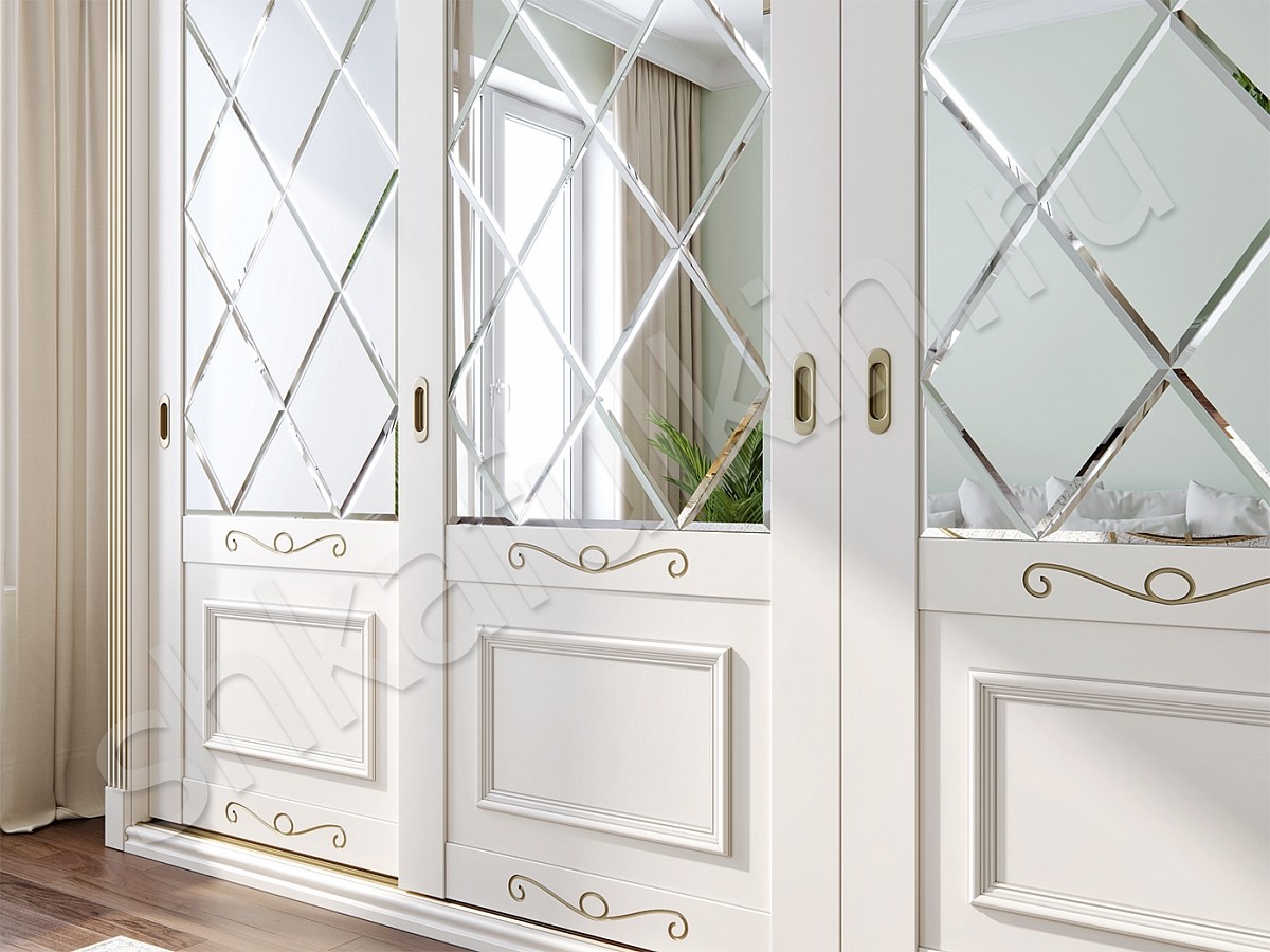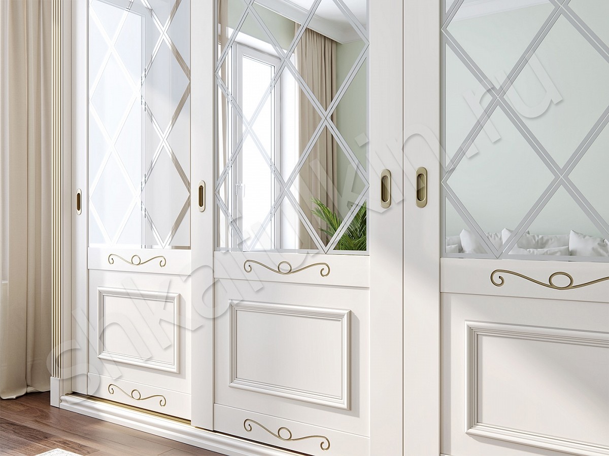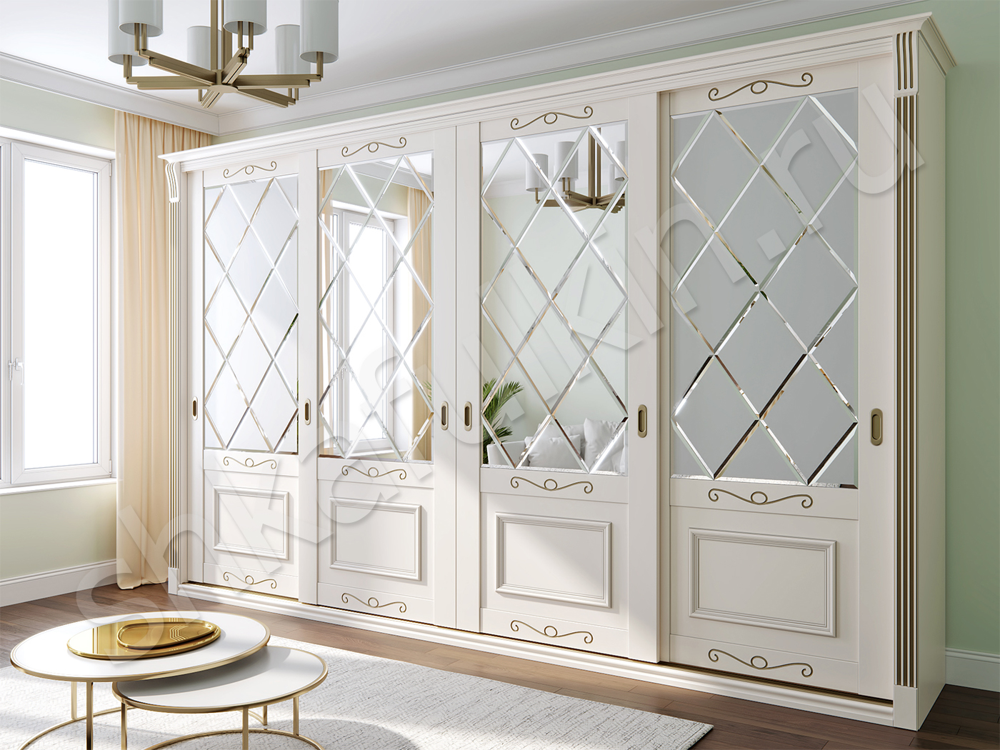 Для тех, кто хочет украсить свою спальню или просторную гостиную, предлагается шкаф с фрезерованными вставками и зеркальными вставками с Фацетом или рисунком на выбор. Эта модель шкафа-купе подчеркнет выбранный вами классический стиль. Настоящей «жемчужиной» станет для спальной комнаты или просторной гардеробной предложенная модель эксклюзивного шкафа.