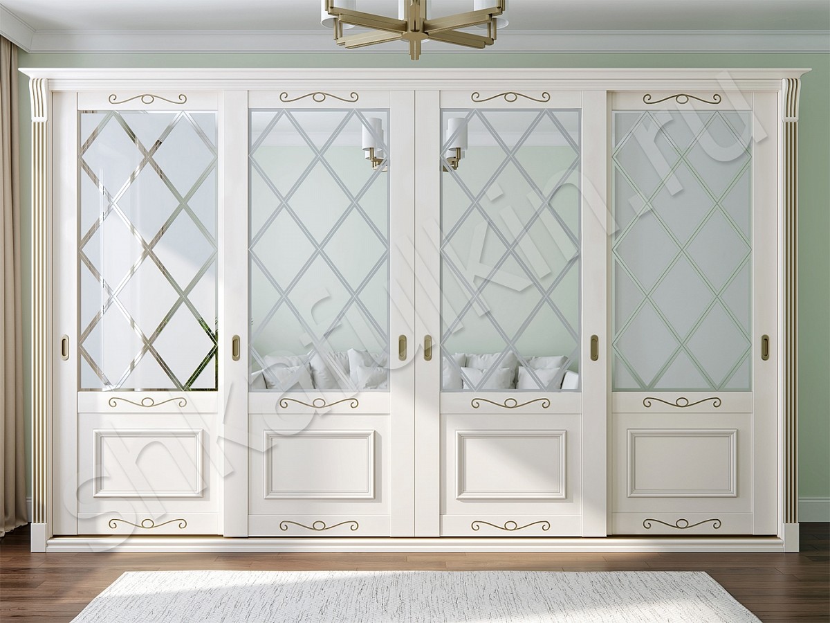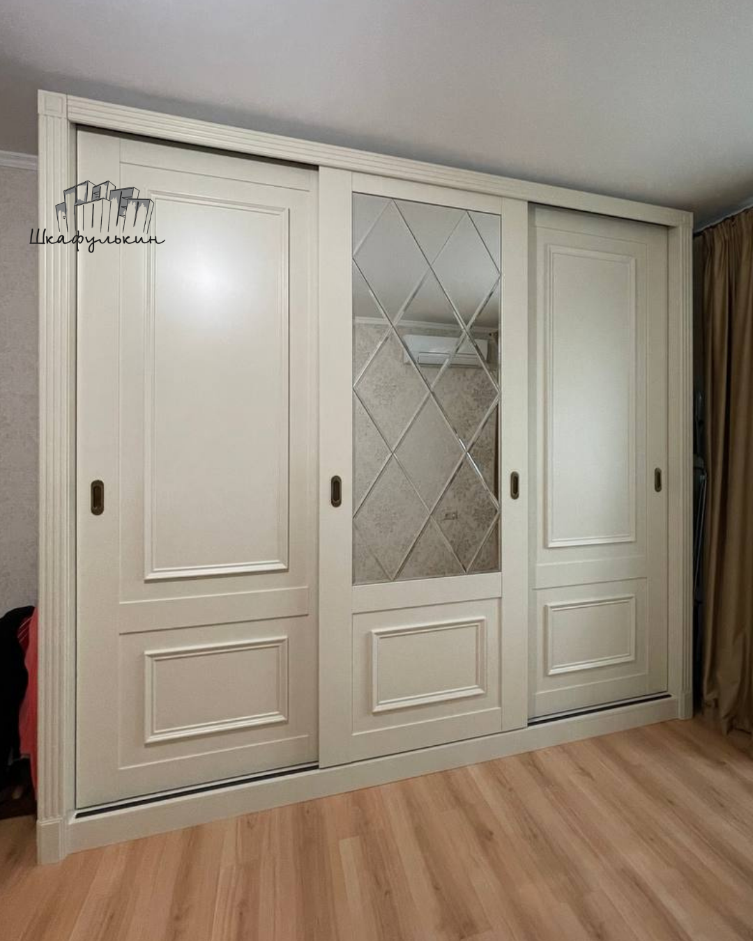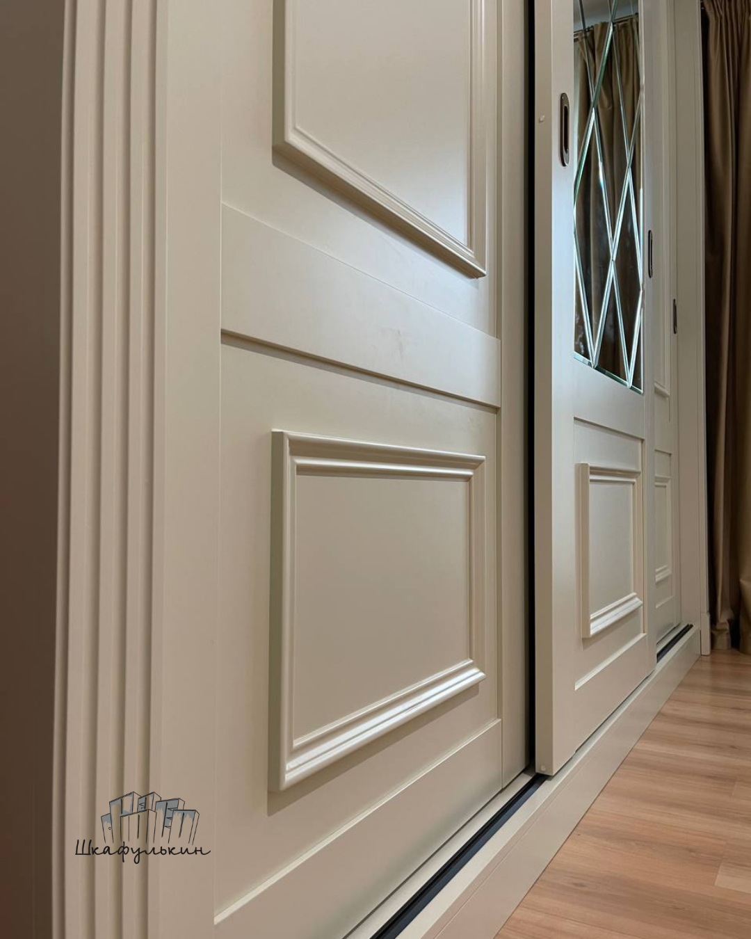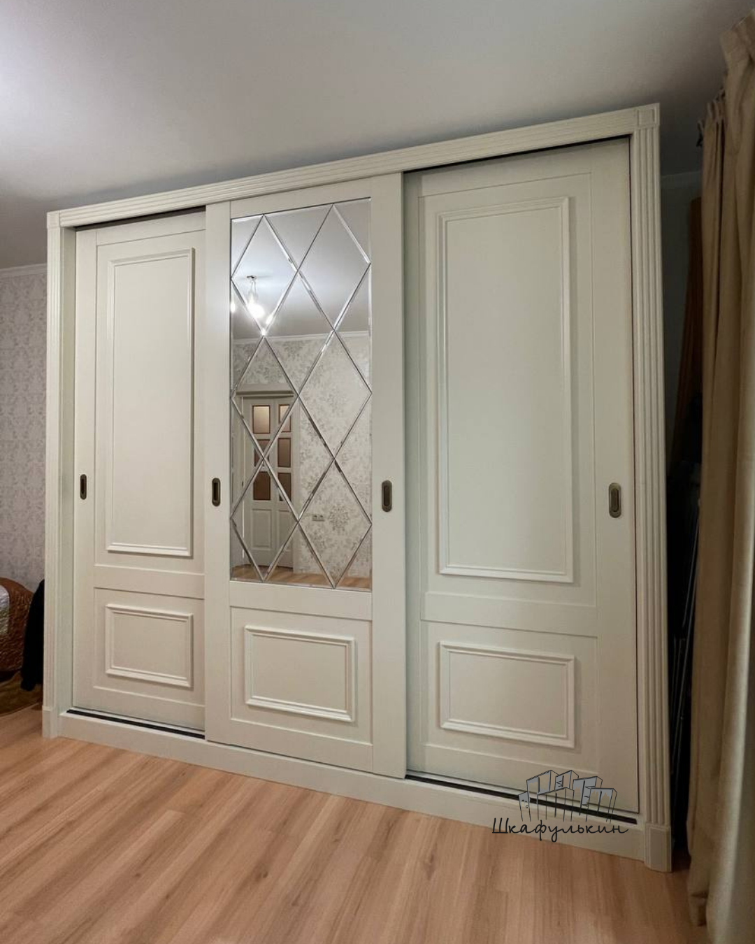 Для тех, кто хочет украсить свою спальню или просторную гостиную, предлагается шкаф с фрезерованными вставками и зеркальными вставками с Фацетом или рисунком на выбор. Эта модель шкафа-купе подчеркнет выбранный вами классический стиль. Настоящей «жемчужиной» станет для спальной комнаты или просторной гардеробной предложенная модель эксклюзивного шкафа.