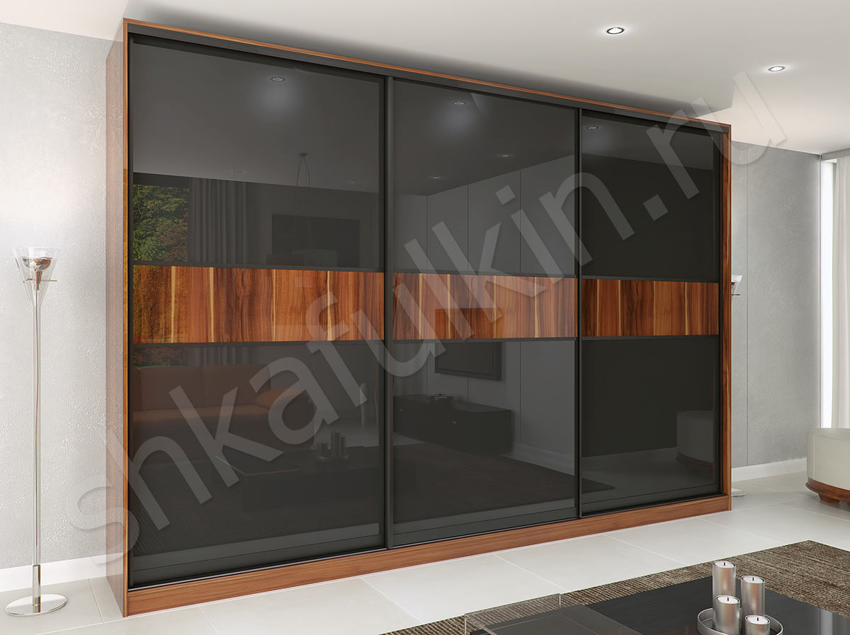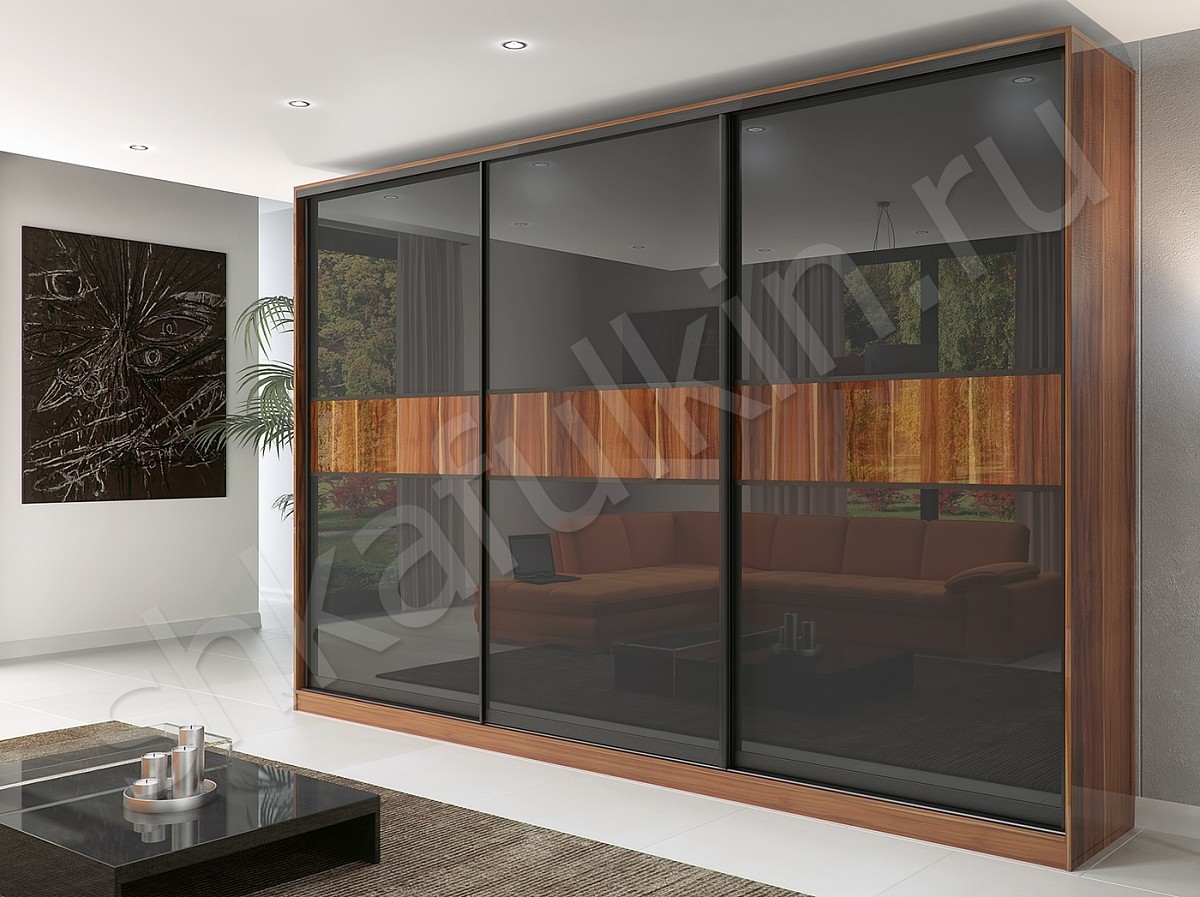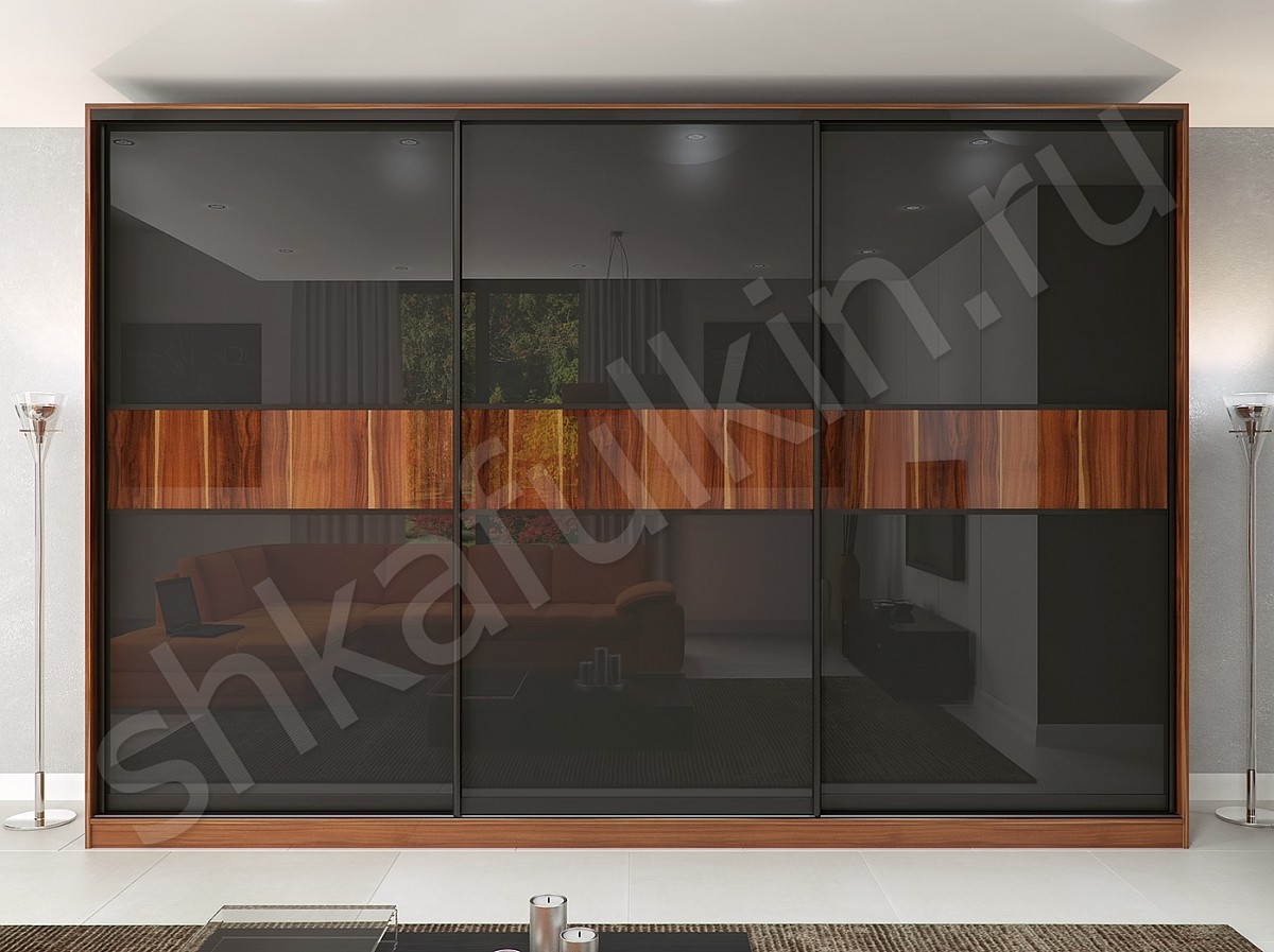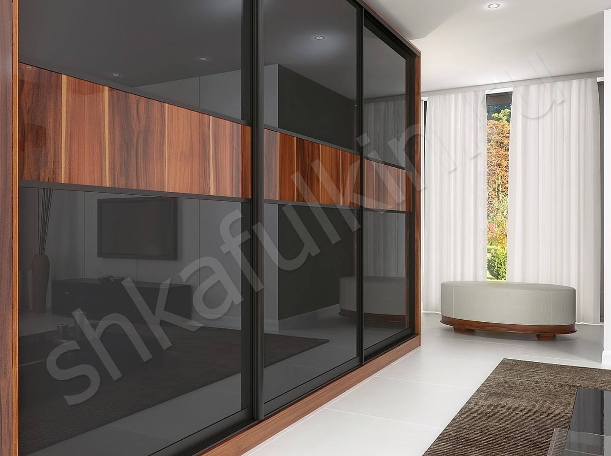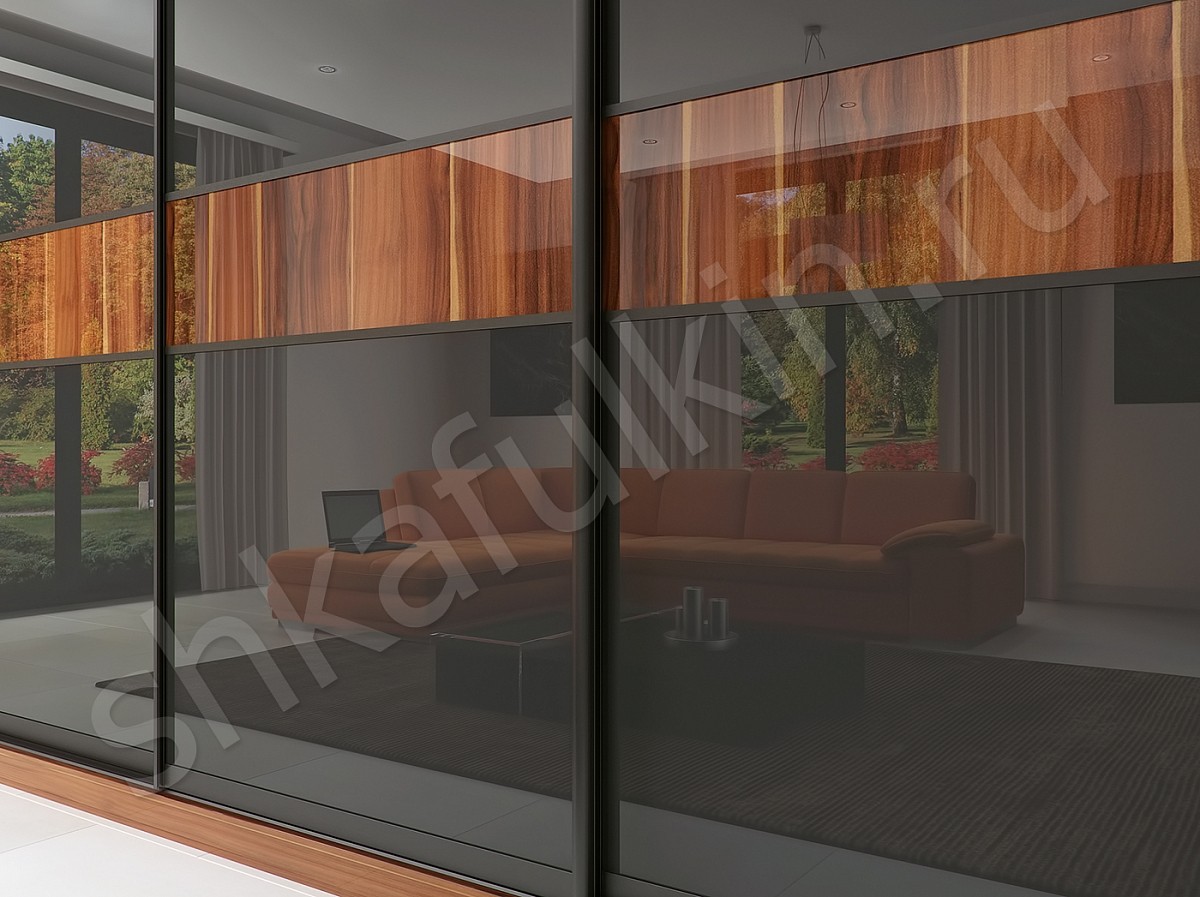 Корпусный шкаф-купе "Торрес Лёгкий" органично впишется в современную спальню или гостиную. Двери шкафа из черного стекла Лакобель с фотопечатью с нижнеопорной системой. Горизонтальная полоса с изображением древесной фактуры гармонично сочетается с корпусом шкафа из ДСП. Сочетание цвета благородного дерева и темного стекла смотрится оригинально, стильно и изысканно.