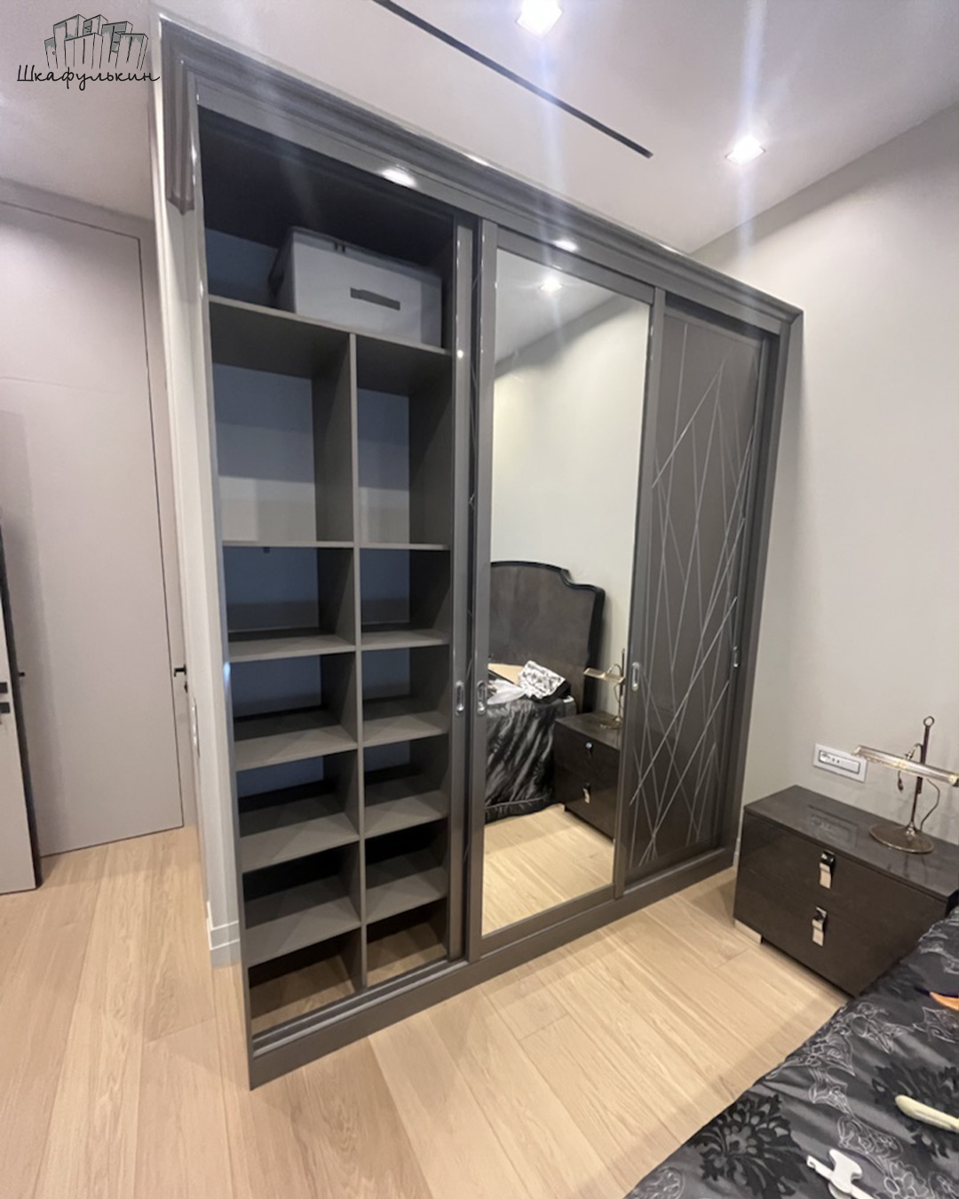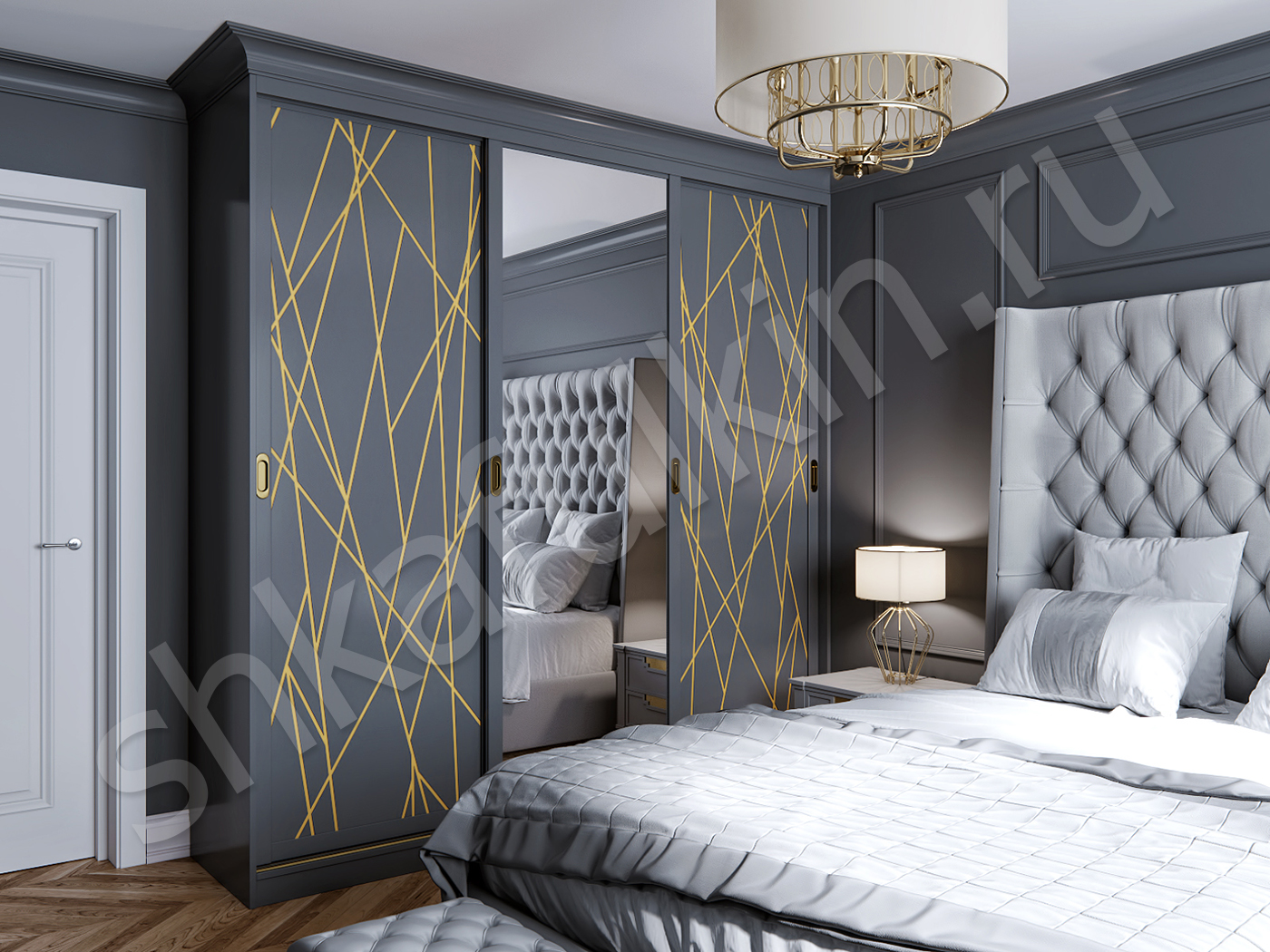 Стильный шкаф-купе станет украшением вашей спальни или гостиной. Двери-купе выполнены с фрезерованными фасадами и нанесением серебряного рисунка, также возможно изготовление таких фасадов с фотопечатью. Для того, чтобы шкаф стал гармоничной деталью интерьера, необходимо учитывать те цвета, которые уже используются в помещении. Лучше, чтобы эти цвета сочетались или работали на контрасте. Не стоит использовать в оформлении шкафа более двух цветов, особенно если в интерьере присутствуют другие цвета.