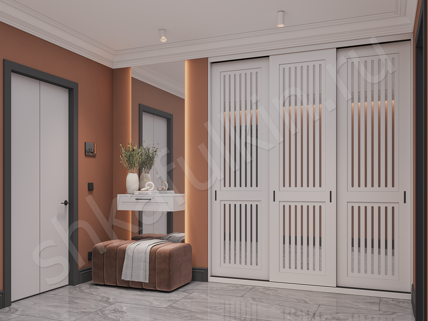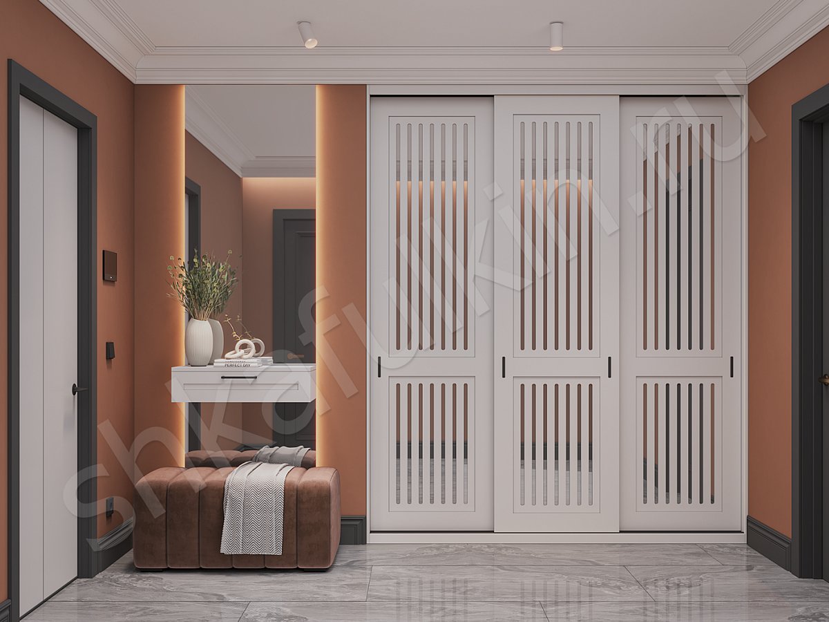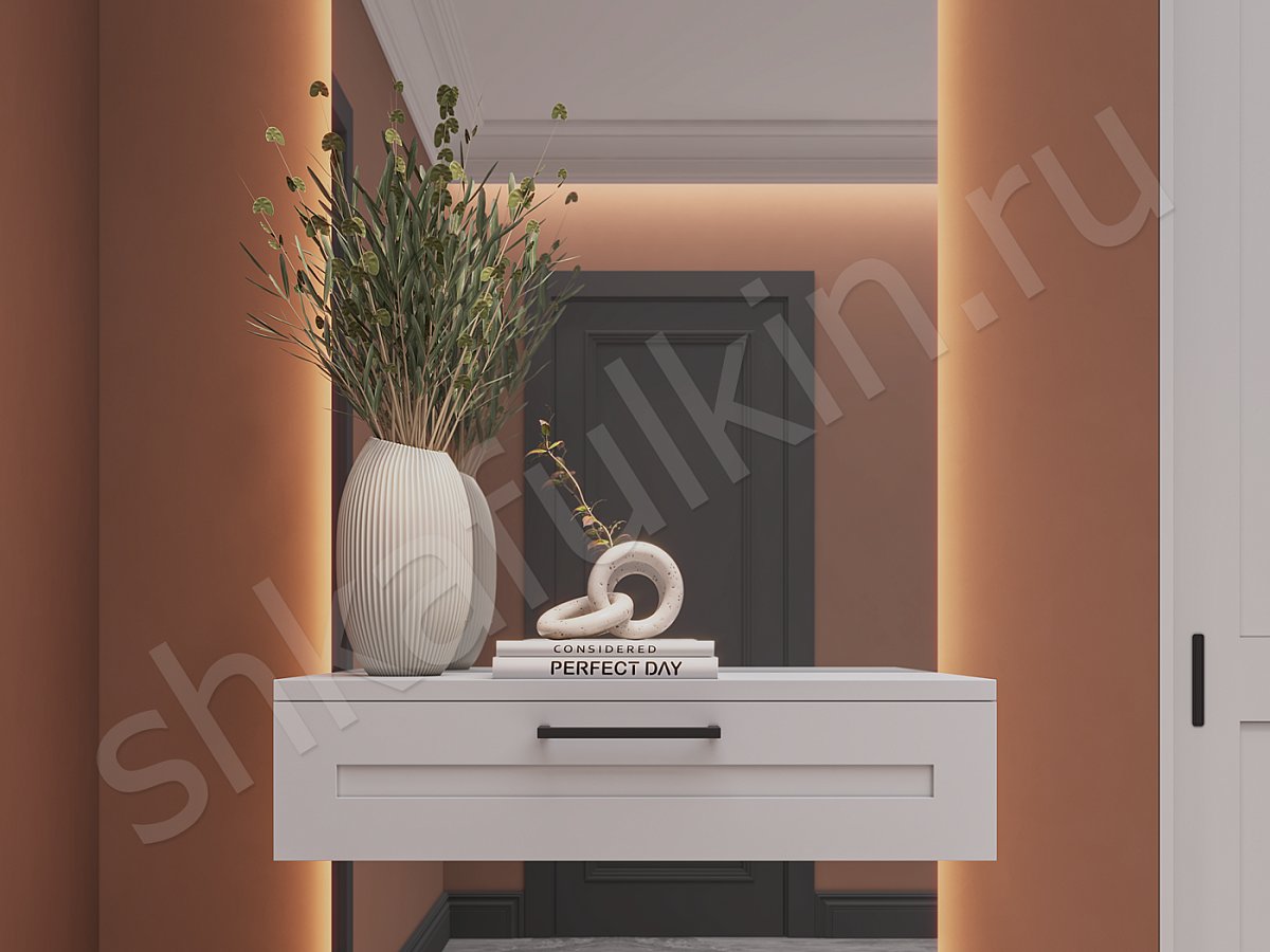 Фасады: МДФ c фрезеровкой, крашенная по NCS,вставка зеркало.