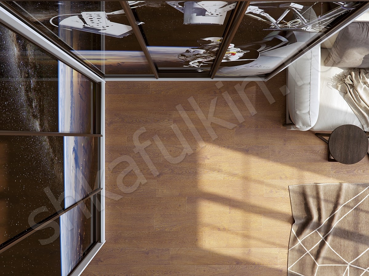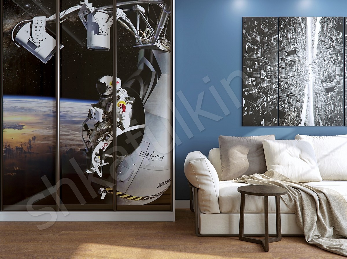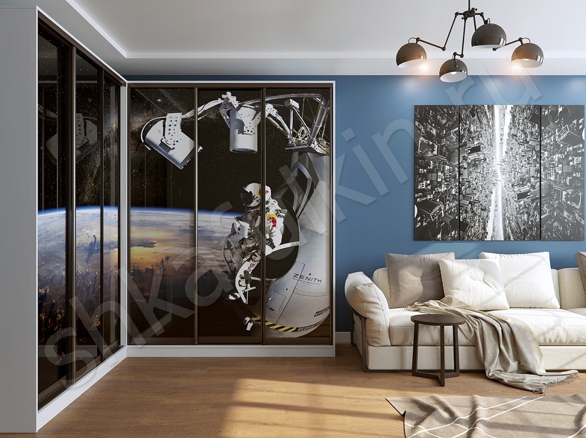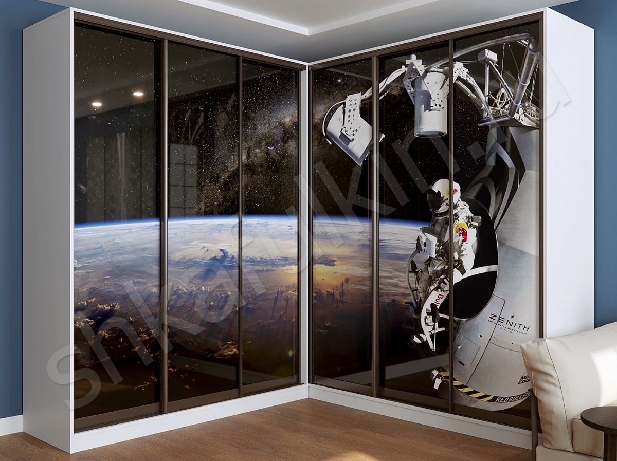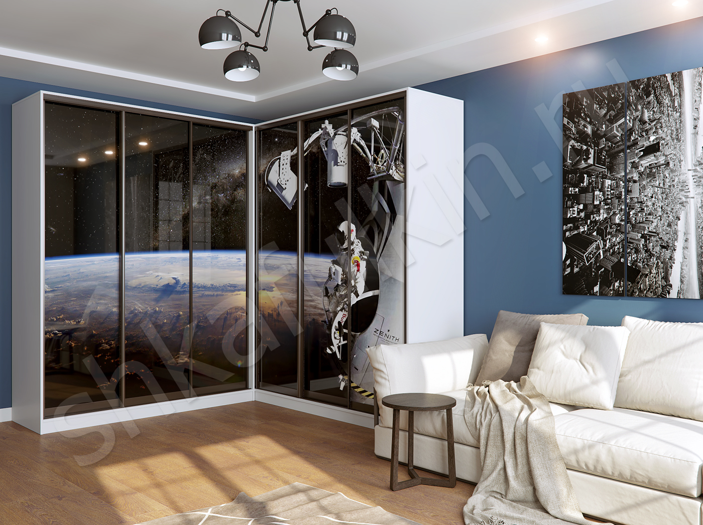 Простой интерьер можно преобразить с помощью красивой и качественной мебели. Грамотная планировка комнаты – залог любого удобного и функционального интерьера. Угловой шкаф-купе "Космос" с фотопечатью создаст фантастическую атмосферу в комнате и подарит ощущение легкости и непринужденности. Если Вы хотите сделать другой рисунок на фасадах, то мы рады помочь Вам с выбором!