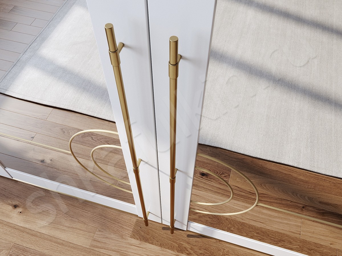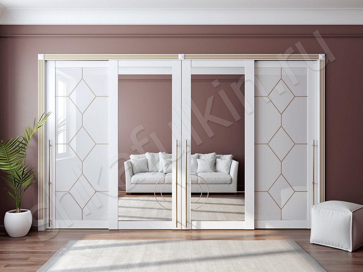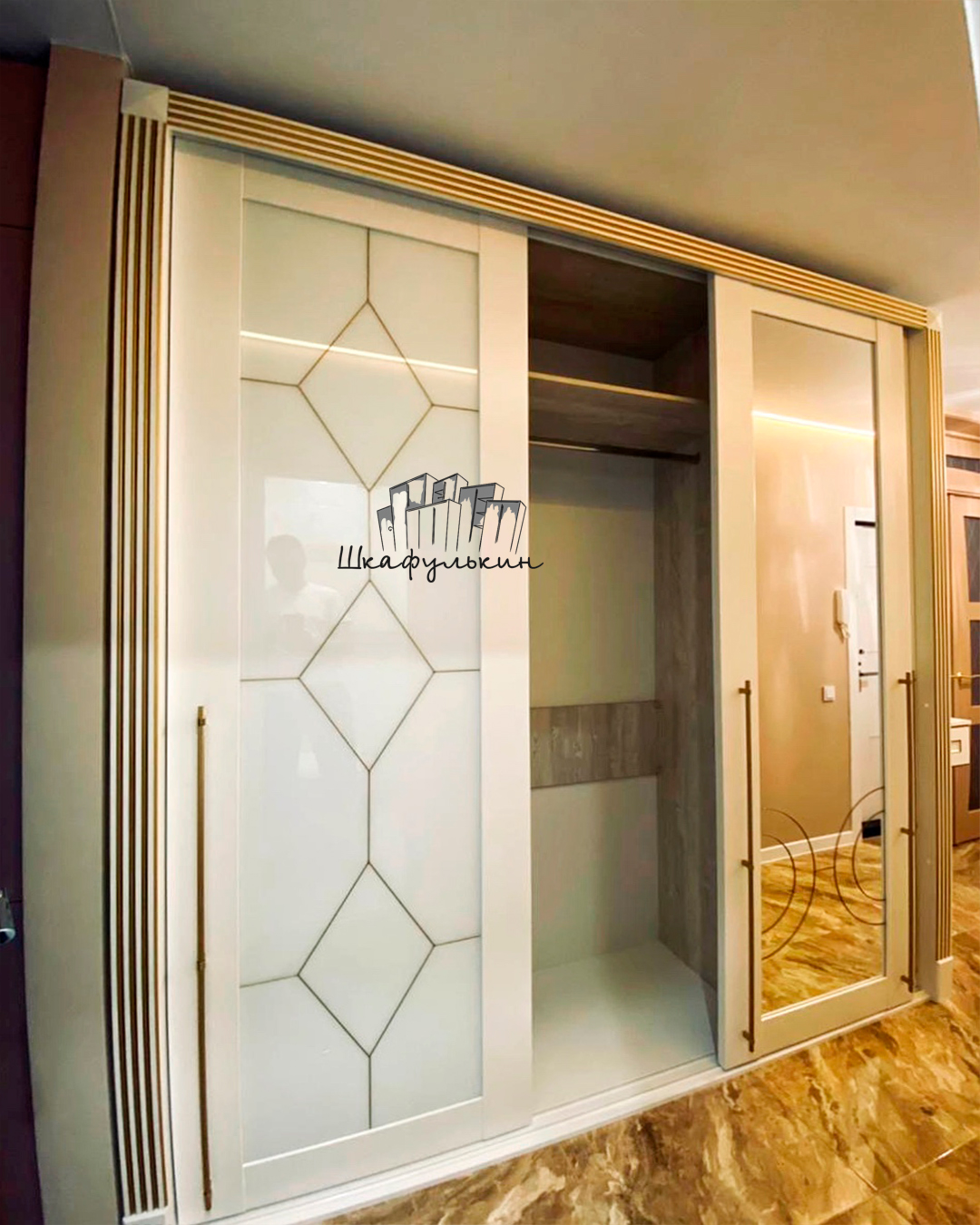 Двери: зеркало и стекло на выбор с заливным витражом, тихоходные ролики, ручки-рейлинги.