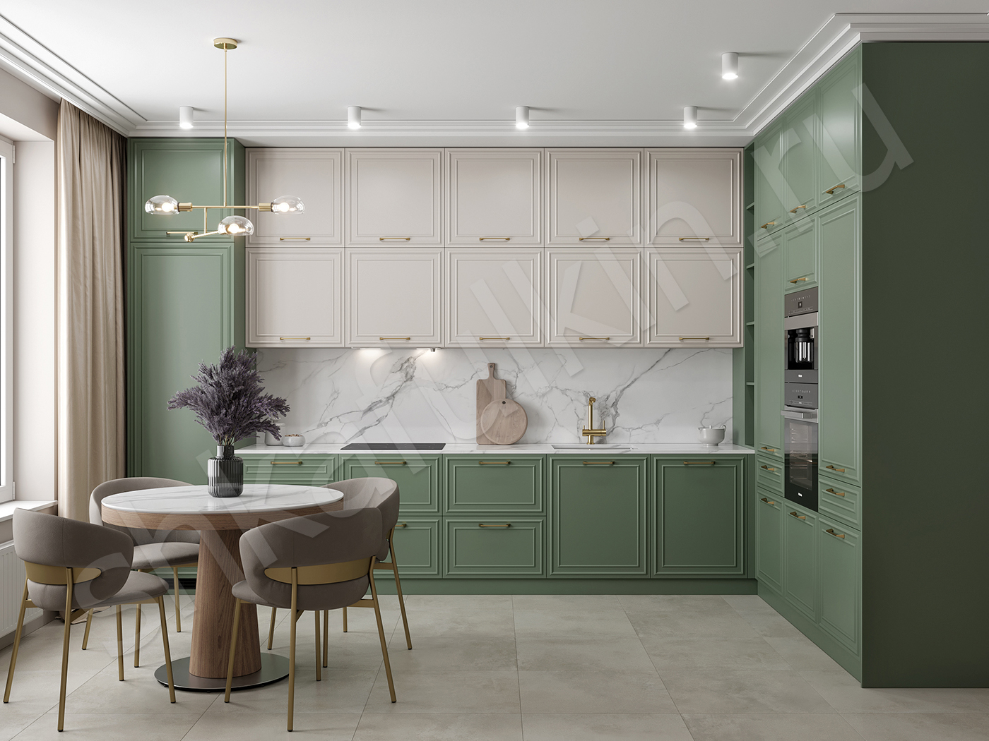 Фасад: МДФ с фрезеровкой, крашенный NCS S 4010-G10Y и NCS S 1505-Y50R.