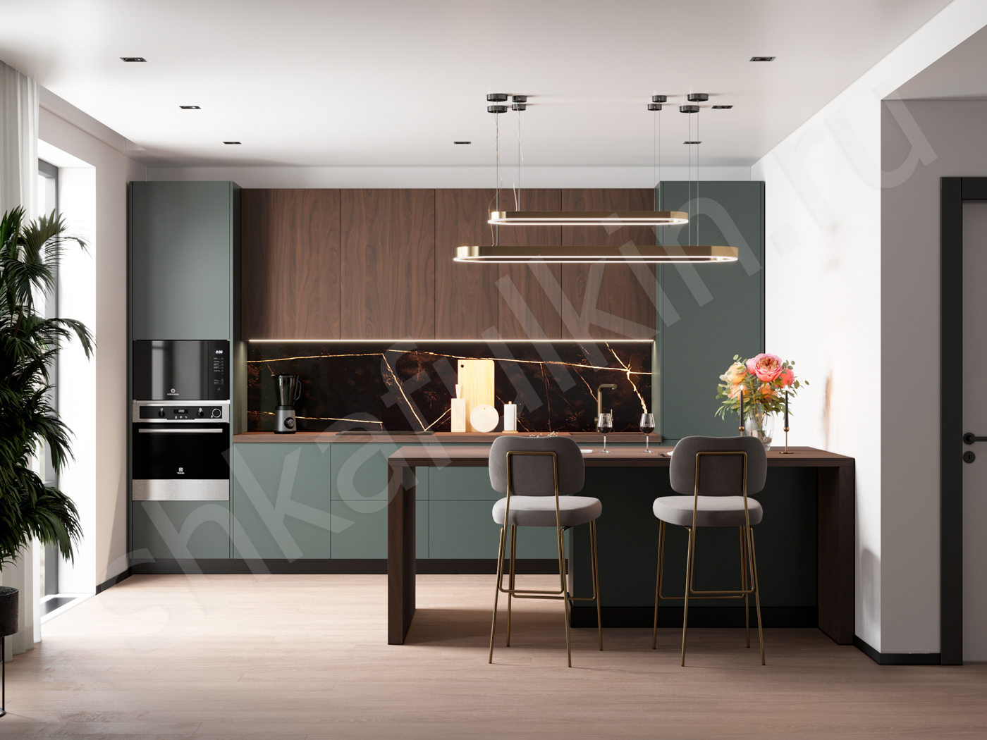 Фасад: МДФ крашенный по NCS - S 7005-B80G, H3711 орех пацифик табак