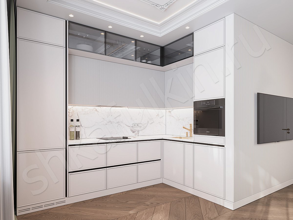 Фасады: МДФ c фрезеровкой, крашенная по NCS/алюминиевый профиль со стеклом.