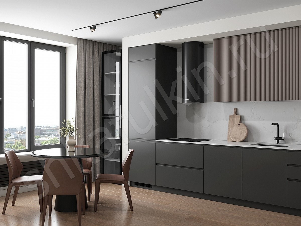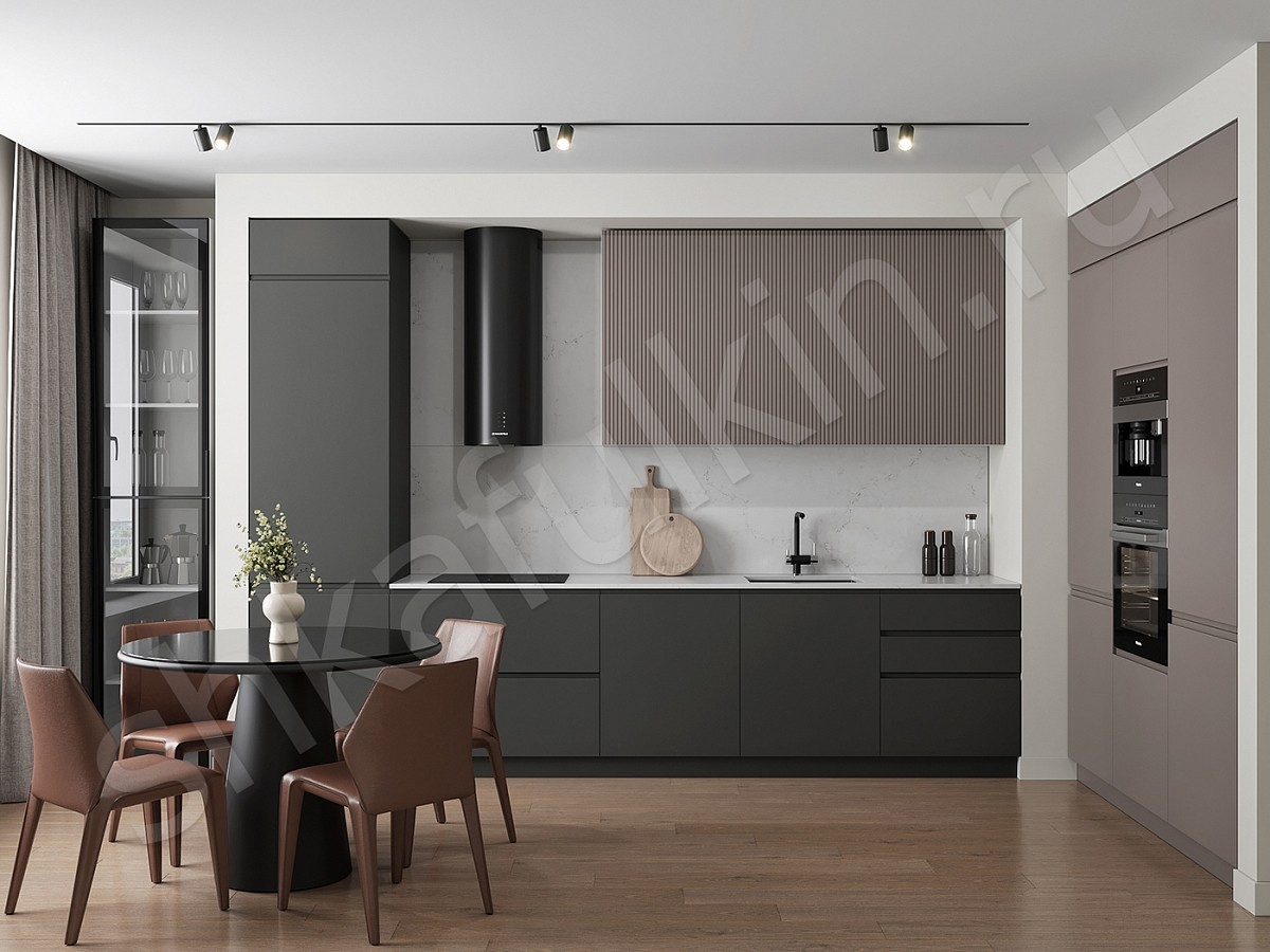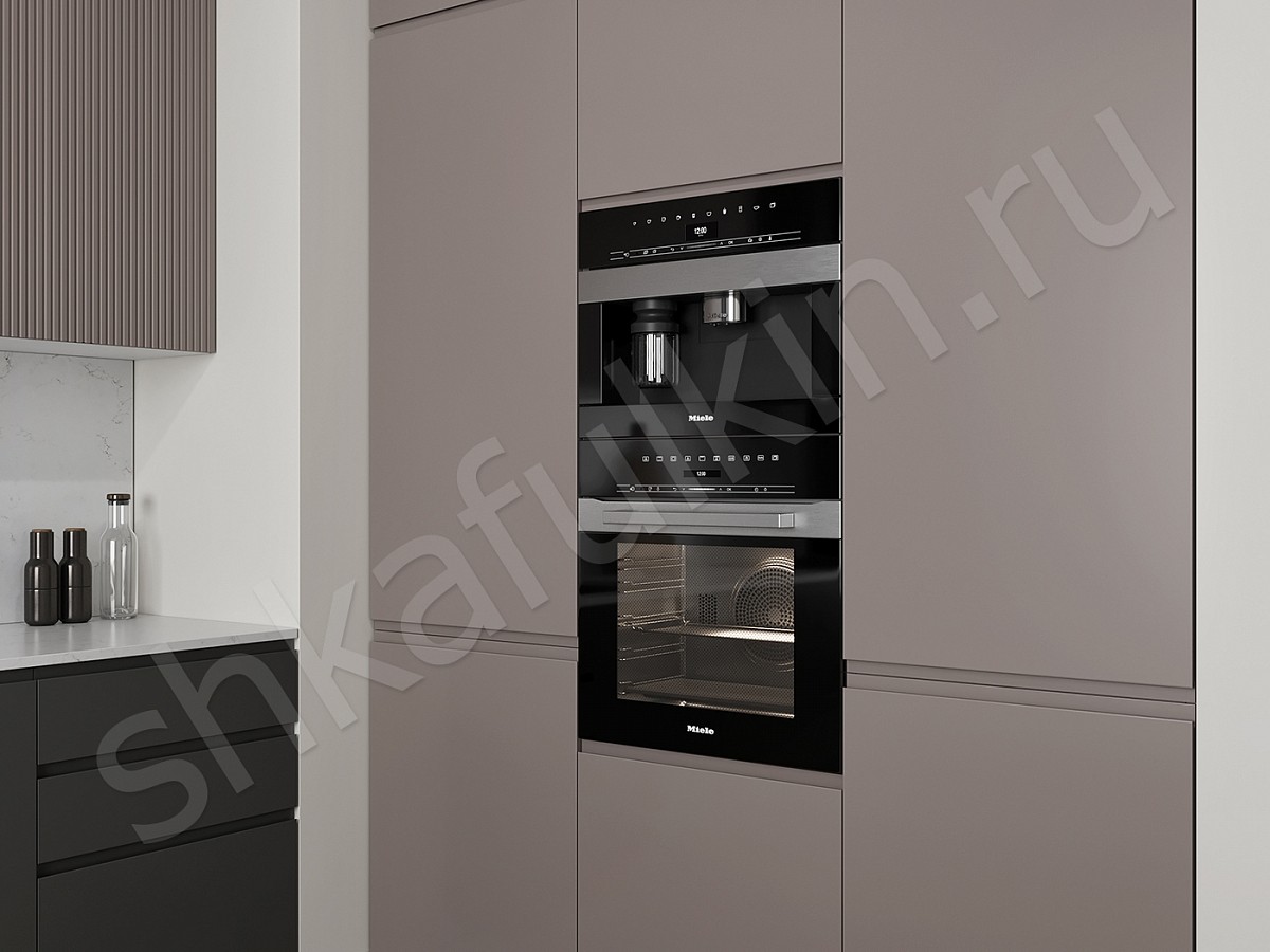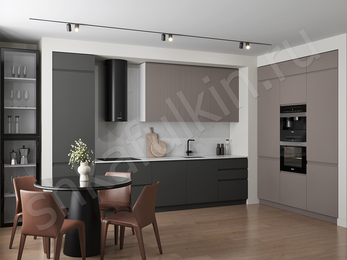 Фасад: МДФ с интегрированной ручкой, крашенный NCS S 7500-N.