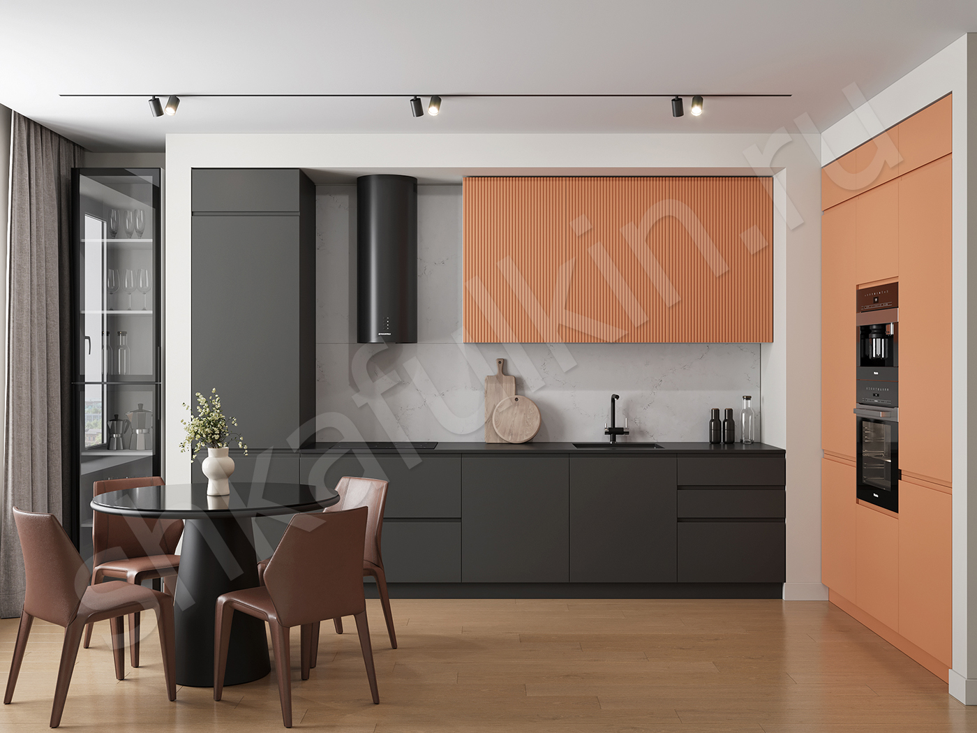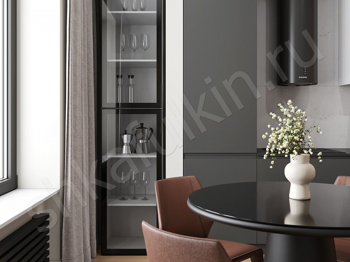 Фасад: МДФ с интегрированной ручкой, крашенный NCS S 7500-N.