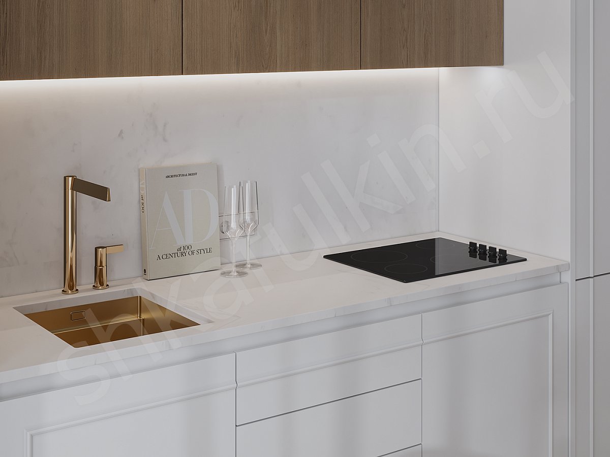 Белый цвет фасадов, отражая лучи солнца и свет ламп, повышает степень яркости и свежести кухни. Деревяные фасады вносят свою лепту: красивая естественная фактура делает помещение органичным и уютным.