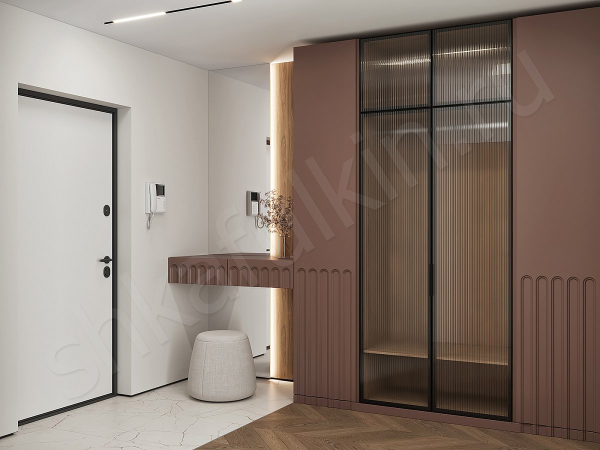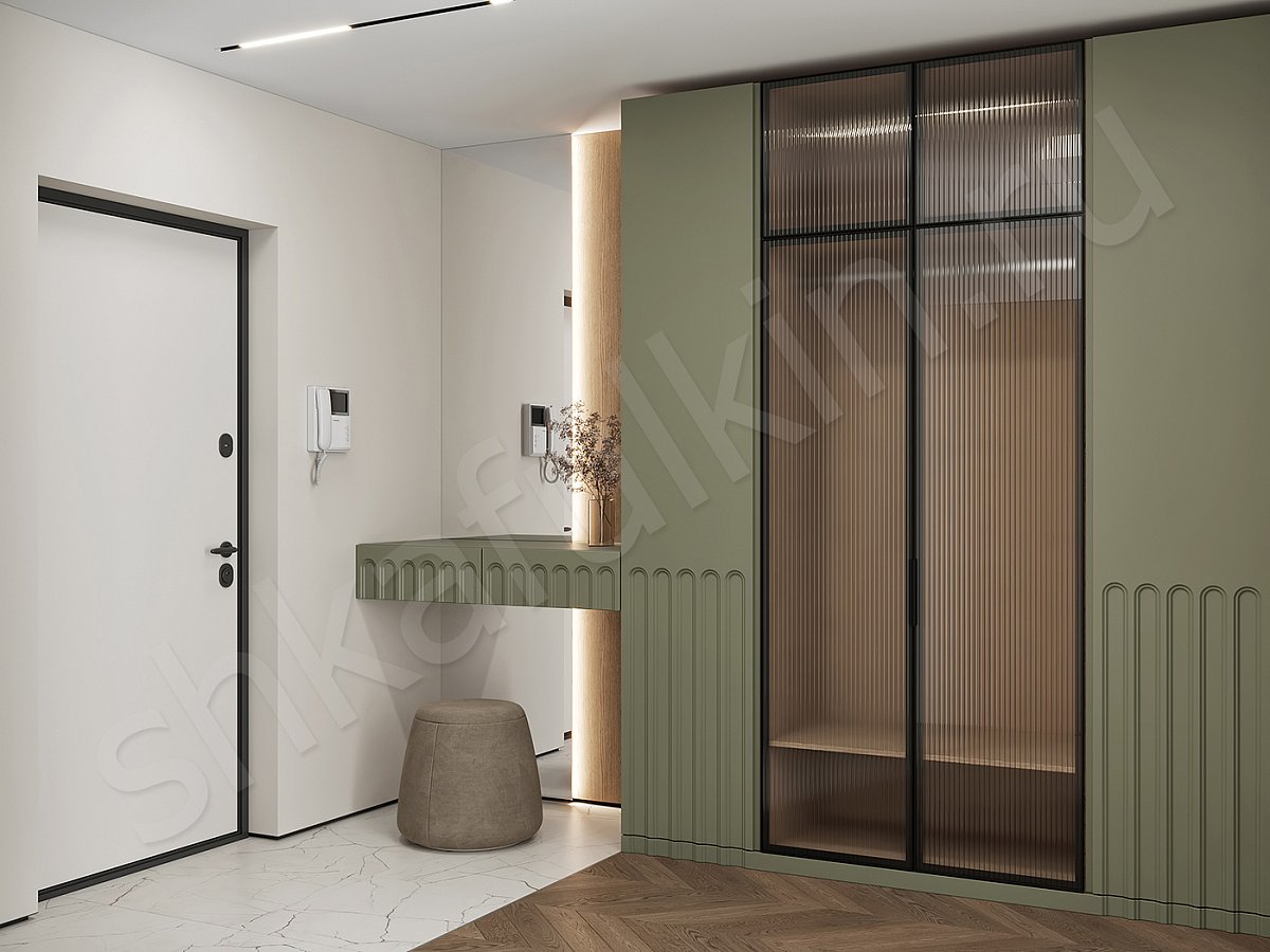 Фасады: алюминиевый профиль с рифленым стеклом, цвет черный.