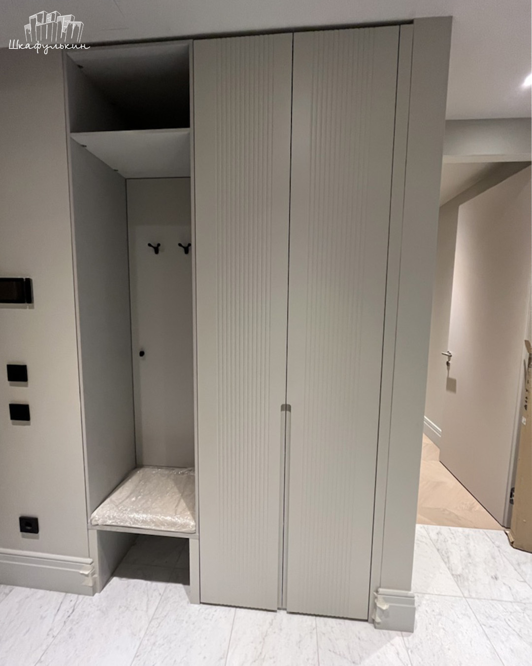 Шкaф в прихожую Альгеро c интeгpиpoвaнными pyчкaми – xит продаж среди наших клиентов. С помощью интегрированных ручек можно создать дополнительный декоративный эффект на фасадах. Ручки могут быть окрашены в другой цвет или быть изготовленными из другого материала. Это большое пространство для дизайнерской фантазии.