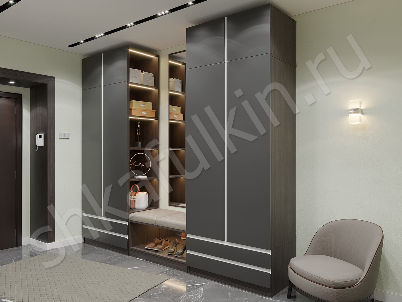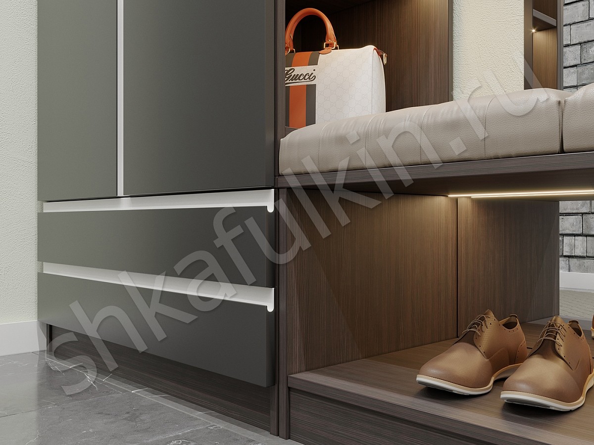 Прихожая Торро идеально подойдет для современного интерьера. Темно - серые фасады с интегрированными ручками выглядят очень стильно. В этой прихожей есть все, что нужно для удобства: распашные шкафы для одежды, полка для обуви с местом для сидения, ящики и полочки для мелочей. Фактура шкафа гладкая, с отсутствием украшений и декоративных элементов. Прихожая может быть выполнена в абсолютно разных цветовых решениях.