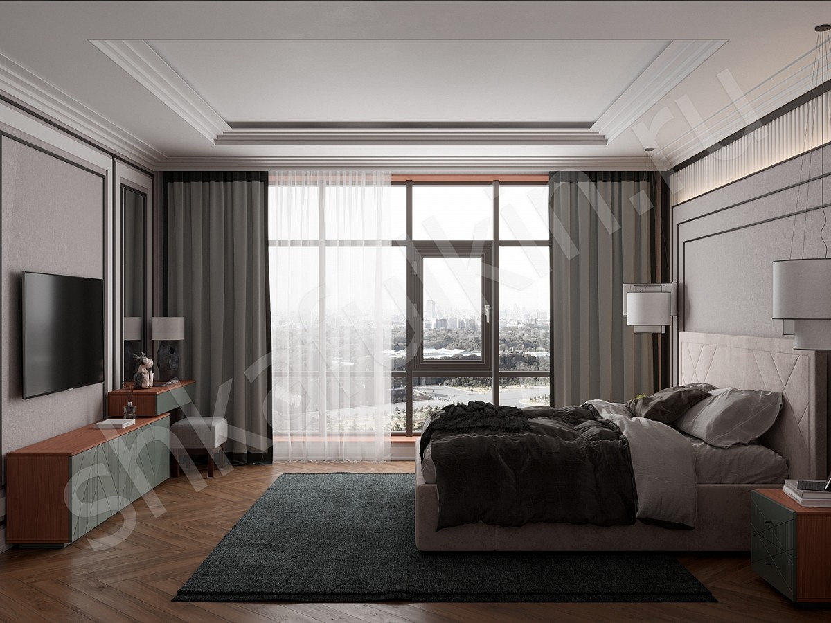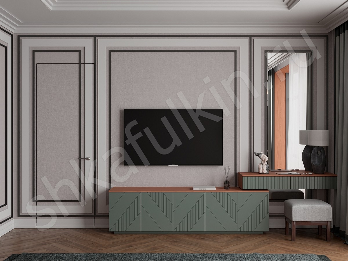 Фасады: МДФ с фрезеровкой и зеркальными вставками крашенная по NCS.