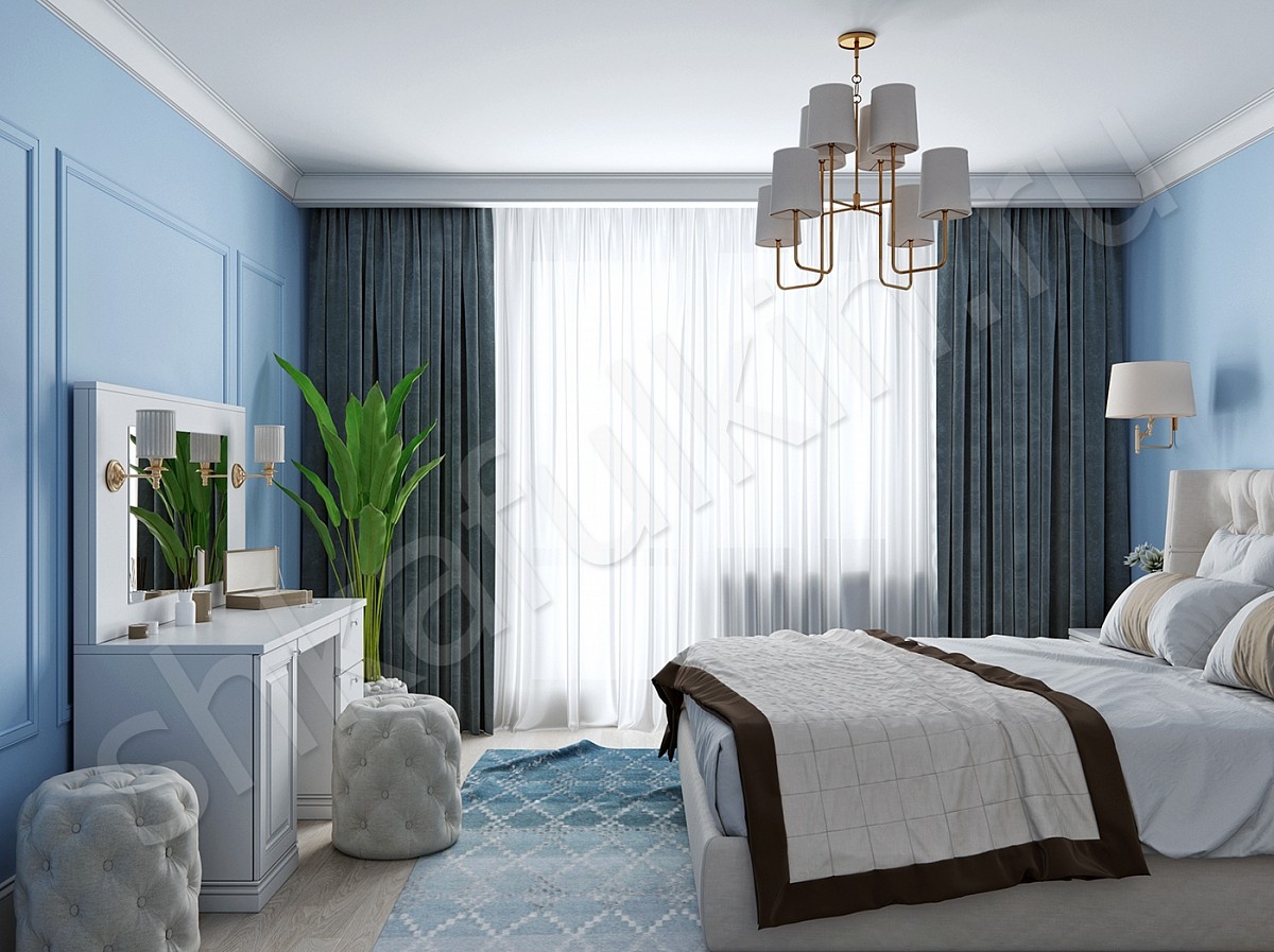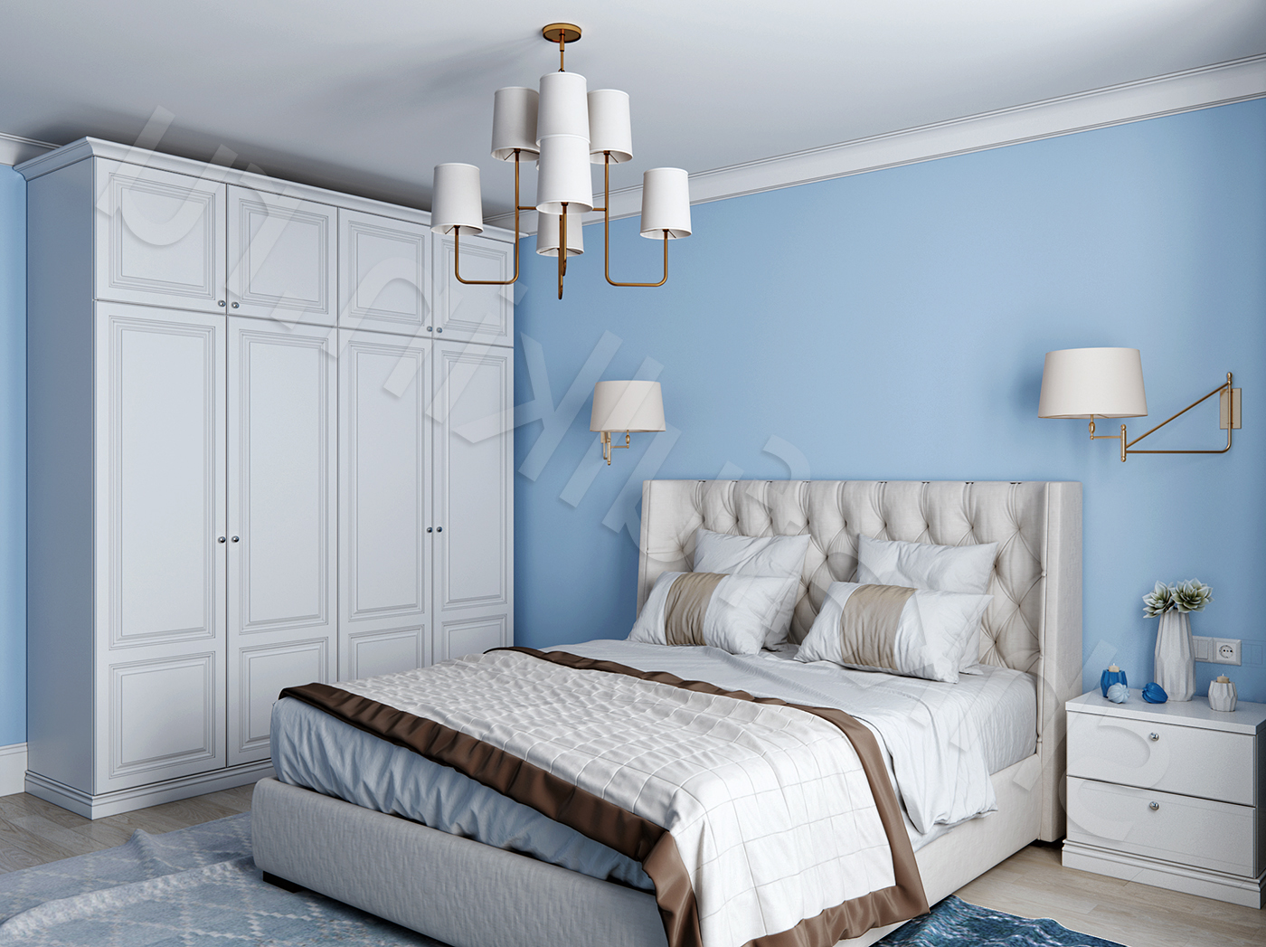 Морозная свежесть, искрящийся белый снег и сказочные зимние пейзажи вдохновили нас на интерьер в стиле мультфильма «Холодное сердце». Голубой цвет относится к холодной цветовой гамме, это цвет природы, способствует успокоению и умственной деятельности. Сочетания белого и голубого цветов в интерьере спальни расслабляют, способствуют здоровому сну, создают эффект простора и свежести.