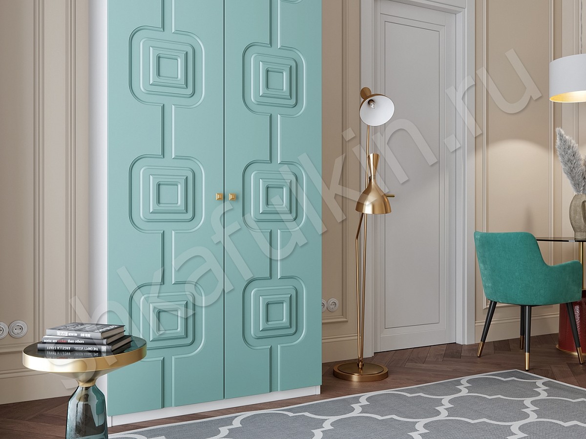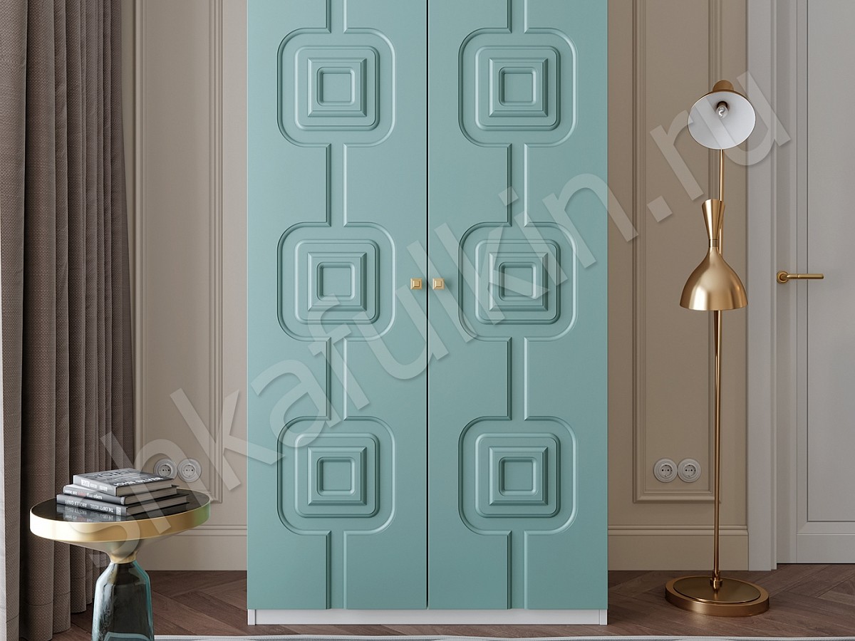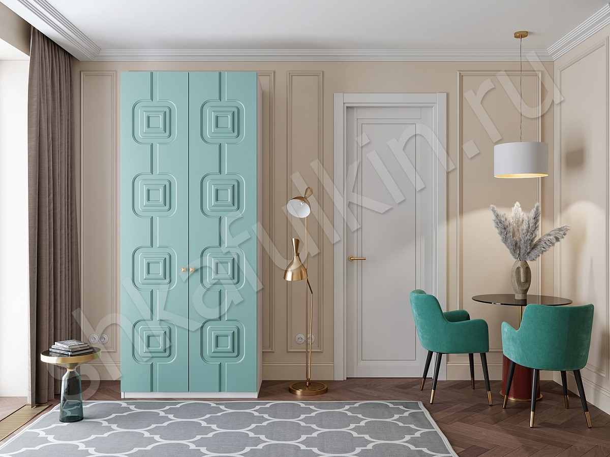 Сочетание нежно-голубых фасадов с белым корпусом шкафа выглядит очень гармонично и прекрасно дополнит интерьер любой комнаты.