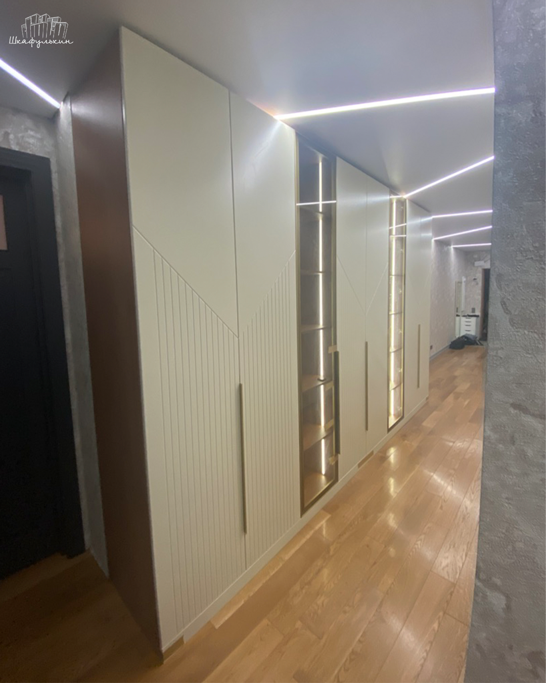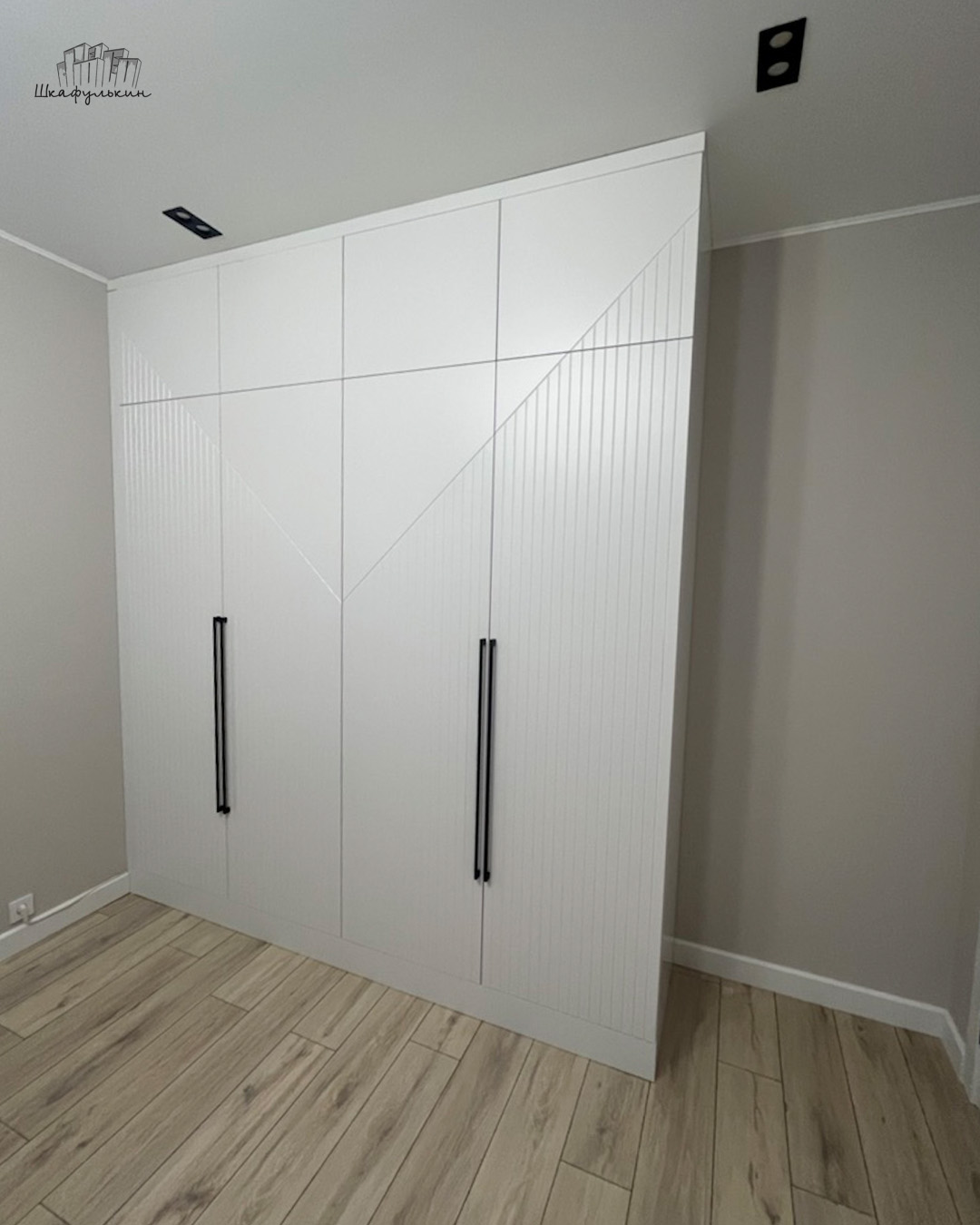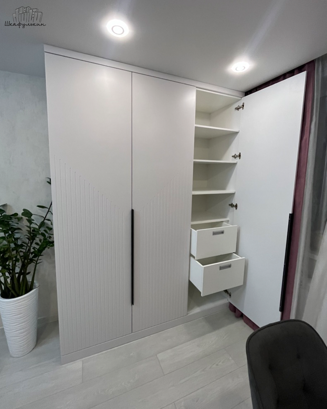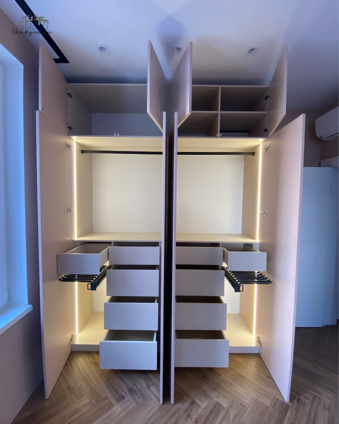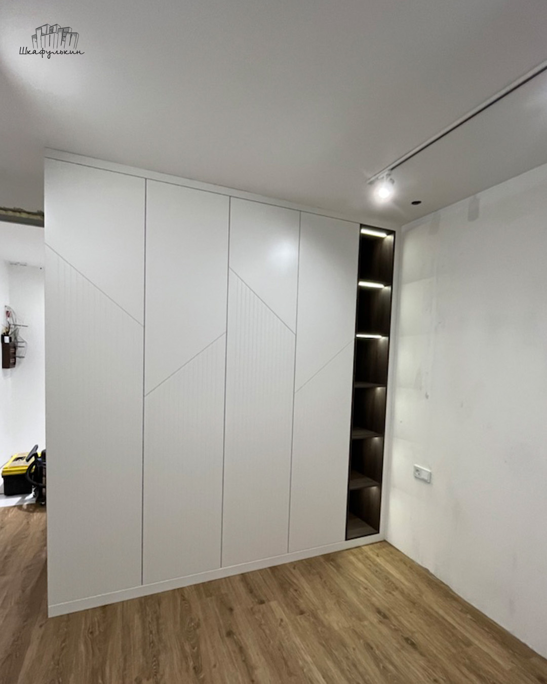 Общие размеры шкафа со стеллажом: 2580x2500x570 мм.