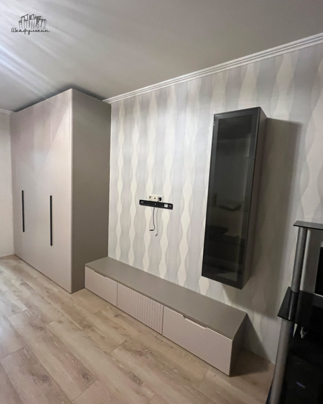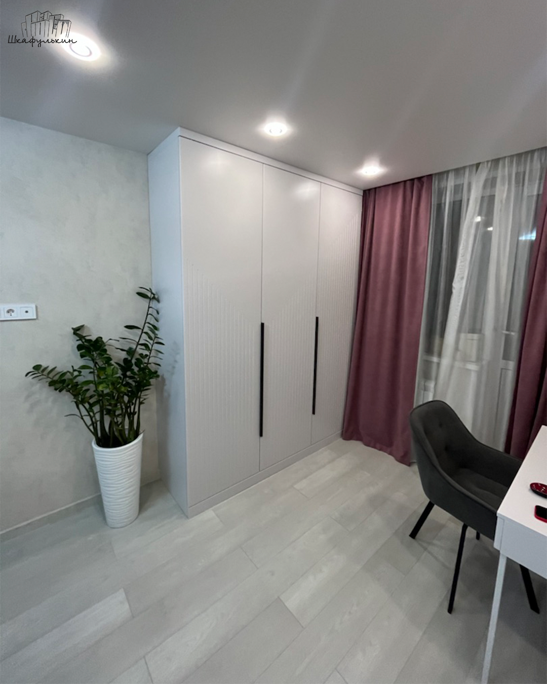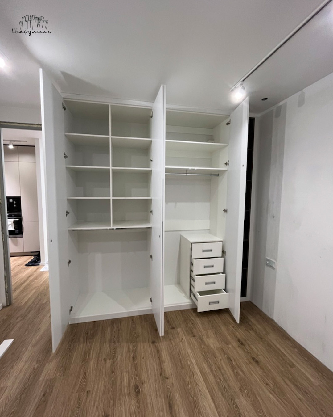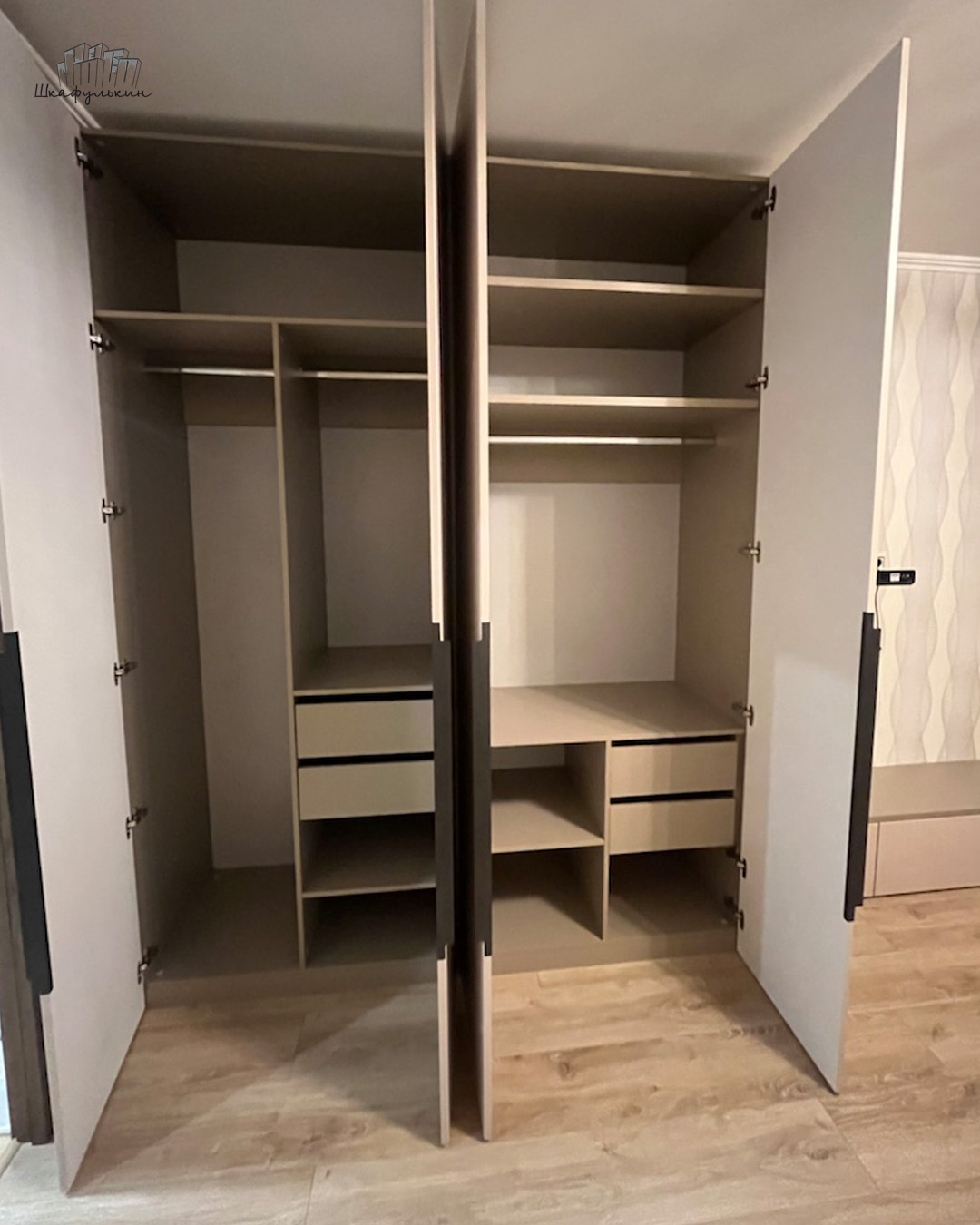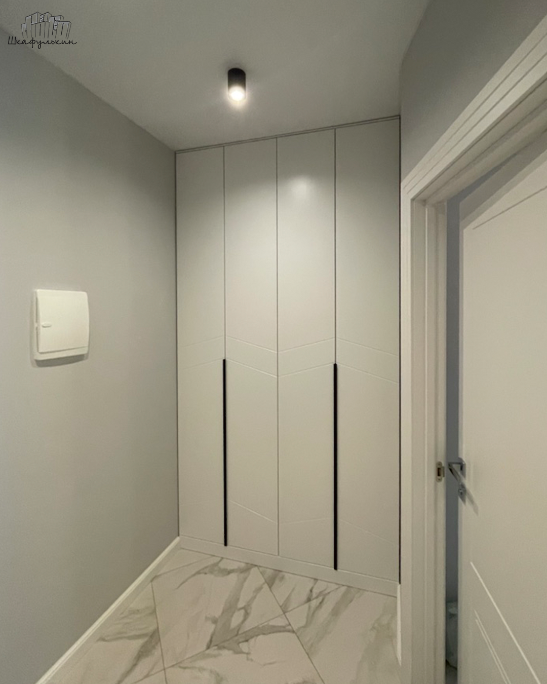 Общие размеры шкафа со стеллажом: 2580x2500x570 мм.
