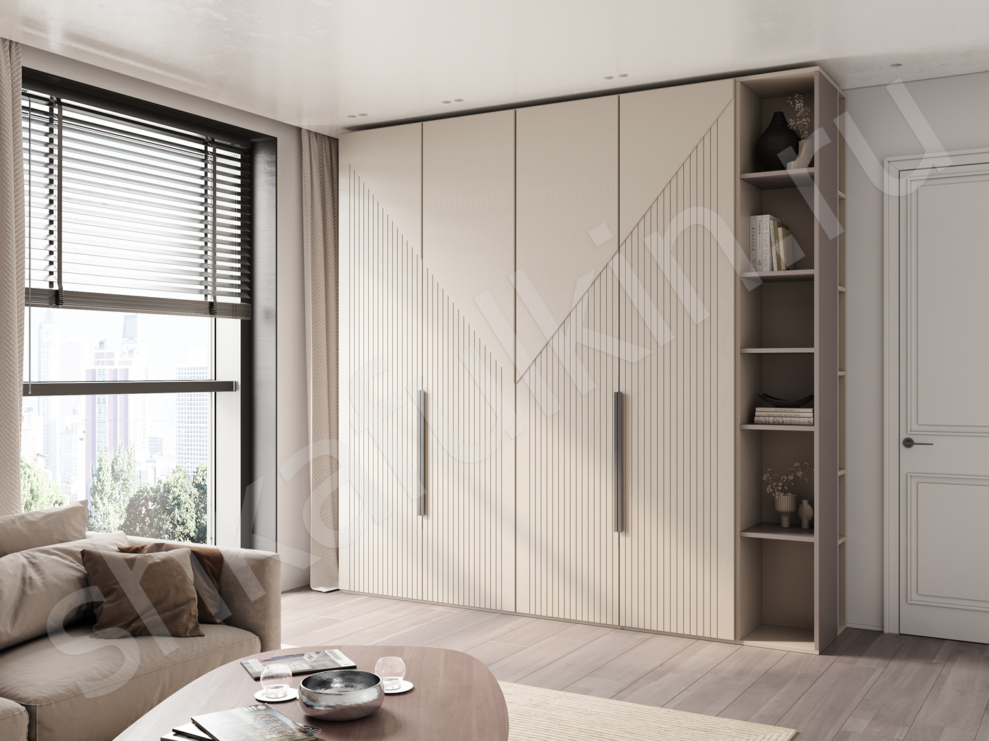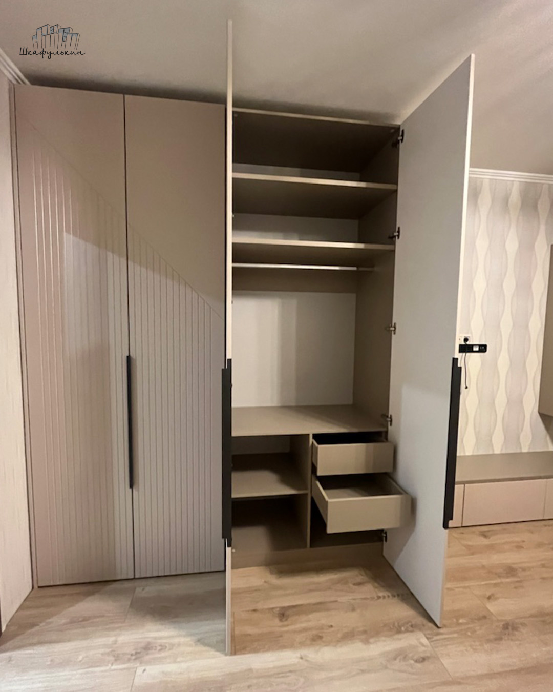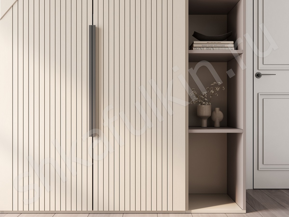 Вне зависимости от того, какой цвет выбран, такие фасады выступают акцентом интерьера. Смотрятся просто, в то же время оригинально. Добавляют ощущение гармонии и естественности.Размеры шкафа 2х створчатого шкафа: 1100х2500х570 мм.